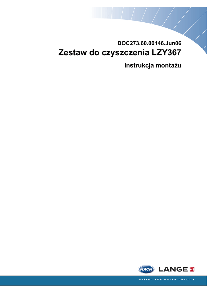 DOC273.60.00146.Jun06 Zestaw do czyszczenia LZY367 Instrukcja montażu Instrukcja montażu DOC273.60.00146Jun06 Zestaw do czyszczenia LZY367 Wprowadzenie Przedłożona instrukcja montażu opisuje montaż i użytkowanie zestawu do czyszczenia LZY367. Zawartość dostawy zestawu do czyszczenia LZY367 Rysunek 1 Zawartość dostawy jednostki czyszczącej LZY367 1 Pierścień typu O (7,5 x 2,5 NBR), 2 sztuki 5 Wąż PharMed 2 Adapter czyszczący dla urządzenia SONDA FILTROW sc, 2 sztuki 6 Wąż (długość 2 m, 3,2 x 0,8), LZY195 3 Wąż (4 x 1, 0,7 m), 2 sztuki 7 Zestaw złączek (3,2 mm) LZY111 Konus i nakrętka kołpakowa (po 2 sztuki) 4 Strzykawka jednorazowa (20 ml) 8 Zaślepka, 2 sztuki, LZY193 Wybór miejsca montażowego Wskazówka: Należy się upewnić, że do dyspozycji stoją instrukcje obsługi urządzenia do analizy DOC023.XX.00025.YYYyy lub DOC023.XX.00026.YYYyy (xx=język, YYYyy=data) oraz urządzenia SONDA FILTROW sc DOC023.XX.00024.YYYyy (xx=język, YYYyy=data). Wskazówka: Należy się upewnić przy wyborze miejsca montażowego, czy używana wanna i urządzenie SONDA FILTROW sc pewnie stoją i czy chemikalia nie mogą wypłynąć. Przy wyborze miejsca montażowego należy zwrócić uwagę na • to, żeby mieć wolny dostęp do drzwi obudowy urządzenia do analizy, • maksymalne długości przewodu i węża oraz • to, żeby mieć wolny dostęp do modułu wyświetlacza. 1 Zestaw do czyszczenia LZY367 Montaż zestawu do czyszczenia LZY367 Niebezpieczeństwo! NIGDY nie wolno używać 3%-procentowego wybielającego ługu chlorowego razem z 5%-procentowym kwasem solnym (Niebezpieczeństwo tworzenia się gazowego chloru). Używane chemikalia, szczególnie wybielający ług chlorowy, nie mogą być mieszane lub wchodzić w kontakt z innymi chemikaliami ( Niebezpieczeństwo tworzenia się gazowego chloru). Należy wdrożyć odpowiednie środki ochronne, odpowiednio do używanych chemikaliów. W każdym przypadku należy mieć na sobie osobiste wyposażenie ochronne (n. p. rękawice i okulary ochronne). Ważna wskazówka: Należy przestrzegać obowiązujących arkuszy danych dotyczących bezpieczeństwa, wskazówek ostrzegawczych na opakowaniach i zbiornikach jak również obowiązujących przepisów zapobiegania wypadkom. Należy stosować się do lokalnych postanowień i utylizować chemikalia w sposób przyjazny dla środowiska. Urządzenie SONDA FILTROW sc należy czyścić tylko w nadającej się do tego wannie. Należy przestrzegać wszystkich wskazówek dotyczących zagrożenia i wskazówek bezpieczeństwa w instrukcjach obsługi urządzenia do analizy i urządzenia SONDA FILTROW sc. 1. Wyjąć urządzenie SONDA FILTROW sc ze zbiornika i postępować przy tym według instrukcji montażu używanego systemu mocującego. 2. Ustawić urządzenie SONDA FILTROW sc w przygotowanej wannie. 3. Zdjąć elementy filtrujące (patrz Rysunek 2 Demontaż elementów filtrujących na stronie 5) i przechowywać je w wilgoci. 4. Użyć jako roztworu czyszczącego 3%-procentowego wybielającego ługu chlorowego (n. p: LCW811, rozcieńczonego wodą w stosunku 1:3) LUB 5%-procentowego kwasu solnego. 5. Napełnić zbiornik roztworem czyszczącym i ustawić go w pobliżu urządzenia SONDA FILTROW sc. 6. Zamontować pierścienie typu O (patrz Rysunek 1 Zawartość dostawy jednostki czyszczącej LZY367 na stronie 1), lekko natłuścić pierścienie typu O i przyłączyć adapter czyszczący zamiast elementów filtrujących (patrz Rysunek 3 Wkładanie adaptera czyszczącego na stronie 5). 7. Zawiesić końce węży na adapterze czyszczącym w przygotowanym zbiorniku z roztworem czyszczącym (patrz Rysunek 4 Przegląd instalacji na stronie 6). 2 Zestaw do czyszczenia LZY367 Czyszczenie urządzenia SONDA FILTROW sc 1. Należy się upewnić, że wszystkie kroki postępowania rozdziału Montaż zestawu do czyszczenia LZY367 na stronie 2 zostały wykonane. 2. Wybrać w menu głównym urządzenie do analizy. 3. Wybrać menu KONSERWACJA>TEST/SERWIS>NAPELNIANIE>NAPELNIJ PROBE i wystartować jeden cykl pompowania. 4. Poczekać, aż cykl pompowania zakończy się. Wskazówka: Należy zwrócić uwagę na to, aby węże się nie opróżniły! 5. Zawiesić końce węży adaptera czyszczącego w zbiorniku wypełnionym czystą wodą i wystartować następny cykl pompowania. 6. Poczekać, aż cykl pompowania zakończy się. 7. Usunąć adapter czyszczący i ponownie zamontować elementy filtrujące (patrz Rysunek 5 Montaż elementów filtrujących na stronie 6). 8. Zamontować ponownie urządzenie SONDA FILTROW sc w zbiorniku i zwrócić przy tym uwagę na instrukcję montażu używanego systemu mocującego. 3 Zestaw do czyszczenia LZY367 Czyszczenie analizatora 1. Ustawić urządzenie do analizy w stan serwisowy. a. Wybrać w tym celu w menu głównym urządzenie do analizy. b. Wybrać menu KONSERWACJA>TEST/SERWIS>TRYB SERWIS. i wybrać START. 2. Zamontować zestaw do czyszczenia tak jak to pokazano na rysunku: Rysunek 6 Zamontowany zestaw do czyszczenia na stronie 7. 3. Usunąć przyłącze węża po prawej stronie na dole naczynia przelewowego i wkręcić zaślepkę (patrz Rysunek 7 Montaż zaślepki i zestawu do czyszczenia na stronie 8). 4. Napełnić strzykawkę roztworem czyszczącym. 5. Usunąć wężyk dopływu próbki urządzenia SONDA FILTROW sc na dole naczynia przelewowego i przykręcić przyłącze wężyka zestawu do czyszczenia (patrz Rysunek 7 Montaż zaślepki i zestawu do czyszczenia na stronie 8). 6. Wstrzykiwać roztwór czyszczący do naczynia przelewowego, aż będzie ono całkowicie napełnione. Wskazówka: Nie wstrzykiwać zbyt dużo roztworu czyszczącego do naczynia przelewowego, ponieważ roztwór czyszczący może wypłynąć w sposób niekontrolowany przez wylot. 7. Roztwór czyszczący odessać ponownie po 5 minutach i zutylizować go w sposób przyjazny dla środowiska. 8. Przepłukać strzykawkę i naczynie przelewowe czystą wodą. 9. Zamontować wszystkie wężyki i połączenia w