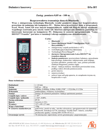 Dalmierz laserowy ___________________________________________ D3a BT ______________________________________________________________ Zasięg pomiaru 0,05 m - 100 m Bezprzewodowa transmisja danych Bluetooth. Wraz z zintegrowaną technologią Bluetooth, wyniki pomiarów mogą być bezprzewodowo przesyłane do palmtopa lub komputera PC. MoŜna łatwo przetworzyć dane w programach Excel, Word, AutoCAD oraz innych kompatybilnych. AutoCAD Plug-In oferuje moŜliwość wygodnego rysowania przy uŜyciu AutoCAD. Klawisze nawigacyjne dalmierza pozwalają na kierowanie kursorami na komputerze PC. Dołączone w zestawie oprogramowanie "Leica DISTO™ Transfer" jest łatwe w instalacji i oferuje automatyczne aktualizowanie. Cechy: • • • • • • • • ______________________ • • • Bluetooth Smart Horizontal Mode™ /Inteligentny Tryb Horyzontalny™ zintegrowany czujnik pochylenia (± 45°) wielofunkcyjna końcówka odniesienia Technologia Power Range™ darmowe Oprogramowanie Leica DISTO™ do transferu danych funkcje pomiarowe: powierzchnia/ kubatura, sprawdzanie kąta prostego, dodawanie/ odejmowanie, pole trójkąta, tyczenie odcinków, pomiar min./ max, pomiar pośredni (funkcja Pitagorasa), pomiar ciągły obszar - funkcja malarza: określanie powierzchni ścian, podłóg a takŜe obwodu pomieszczenia. gwint statywu samowyzwalacz uchwyt typu soft grip sprawia, Ŝe urządzenie trzyma się bezpiecznie w ręce Dane techniczne: Dokładność Zasięg Jednostki Wskazania Pamięć Czujnik kąta / zakres Czujnik kąta / jednostki Norma ochronna Baterie Wymiary Waga z bateriami W zestawie standardowym Gwarancja/ serwis ± 1,0 mm 0,05 m – 100 m 0.000m, 0.0000m, 0.00m, 0.00ft, 0’00’’, 1/32,0.0in, 0 1/32in podświetlany, 4-liniowy wyświetlacz pamięć 20 ostatnich pomiarów/ funkcja opóźnienia pomiaru ± 45° ± 0.0°, 0.00% IP 54 2xAAA (1.5V) 127 x 49 x 27 mm 150g pokrowiec, pasek na rękę, tarczka celownicza, oprogramowanie do transmisji Bluetooth, instrukcja na CD, instrukcja "Szybki Start", baterie, certyfikat producenta zgodny z normą DIN 55350-18-4.2.2 36-miesięczna/ zapewniony serwis gwarancyjny i pogwarancyjny ___________________________________________________________________________________ APG-INNOWACJE Jolanta Góralczyk, 41-400 Mysłowice, ul. Mikołowska 29, NIP 222-016-29-35 tel./ fax: 32 317 31 13, kom. 502 430 657, e-mail: [email protected], www.apg-innowacje.pl ___________________