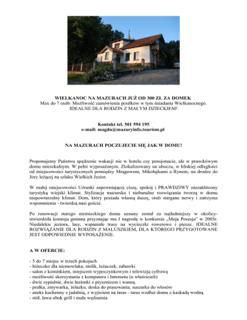 WIELKANOC NA MAZURACH JUŻ OD 300 ZŁ ZA DOMEK Max do 7 osób. Możliwość zamówienia posiłków w tym śniadania Wielkanocnego. IDEALNE DLA RODZIN Z MAŁYM DZIECKIEM! Kontakt tel. 501 594 195 e-mail: [email protected] NA MAZURACH POCZUJECIE SIĘ JAK W DOMU! Proponujemy Państwu spędzenie wakacji nie w hotelu czy pensjonacie, ale w prawdziwym domu mieszkalnym. W pełni wyposażonym. Zlokalizowany na uboczu, w bliskiej odległości od miejscowości turystycznych pomiędzy Mrągowem, Mikołajkami a Rynem, na drodze do Jory leżącej na szlaku Wielkich Jezior. W małej miejscowości Użranki zapewniającej ciszę, spokój i PRAWDZIWY niezakłócony turystyką wiejski klimat. Stylizacja mazurska i niebanalne rozwiązania tworzą w domu niepowtarzalny klimat. Dom, który posiada własną duszę, otuli stargane nerwy i zatrzyma wspomnienia - twierdzą nasi goście. Po renowacji starego niemieckiego domu uznany został za najładniejszy w okolicystwierdziła komisja gminna przyznając mu I nagrodę w konkursie „Moja Posesja” w 2005r. Niedalekie jeziora, lasy, wspaniałe trasy na wycieczki rowerowe i piesze. IDEALNE ROZWIĄZANIE DLA RODZIN Z MALUSZKIEM, DLA KTÓREGO PRZYGOTOWANE JEST ODPOWIEDNIE WYPOSAŻENIE. A W OFERCIE: - 5 do 7 miejsc w trzech pokojach - łóżeczko dla niemowlaka, stolik, leżaczek, zabawki - salon z kominkiem, miejscem wypoczynkowym i telewizją cyfrową - możliwość skorzystania z komputera i Internetu (u właścicieli) - dwie sypialnie, dwie łazienki z prysznicem i wanną - pralka, zmywarka, żelazko, deska do prasowania, suszarka do włosów - aneks kuchenny z jadalnią, z wyjściem na taras - taras wzdłuż domu z kaskadą wodną - stół, ława obok grill i mała wędzarnia - ukwiecony ogród, miejsce do czytania - miejsce na samochód WYPOSAŻENIE DLA DZIECI NAWILŻACZ POWIETRZA Z TRACHEOSTOMIĄ: PRZENOŚNY SSAK, INNE MOŻLIWOŚCI: - domowe obiady - pole namiotowe - plac zabaw dla dzieci ( domek ze zjeżdżalnia, piaskownica, karuzela - batut, huśtawki), kucyk - wypożyczenia dla dziecka trzy kołowego wózka trackowego - wypożyczenia hamaka i książek - domowe obiady - zakupu świeżych jaj, mleka prosto od krowy czy domowych przetworów - zamówienia zakupów w Mrągowie - wypożyczenia rowerów - uzyskania informacji o atrakcjach turystycznych regionu - nabycia map turystycznych - skorzystania z usług fryzjerskich - pomocy w zorganizowaniu wycieczki - organizacja imprez dla dzieci - letnie przedszkole Gospodarze posługują się jęz. angielskim i francuskim