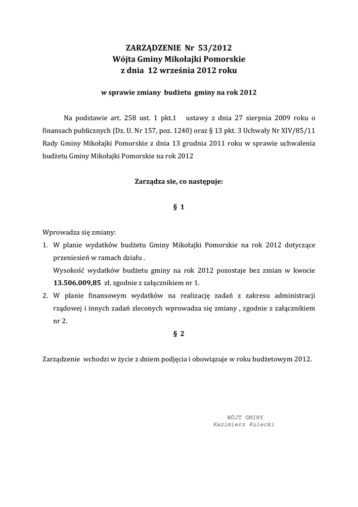 Zarządzenie Nr 53/2012 Wójta Gminy Mikołajki Pomorskie z dnia 12