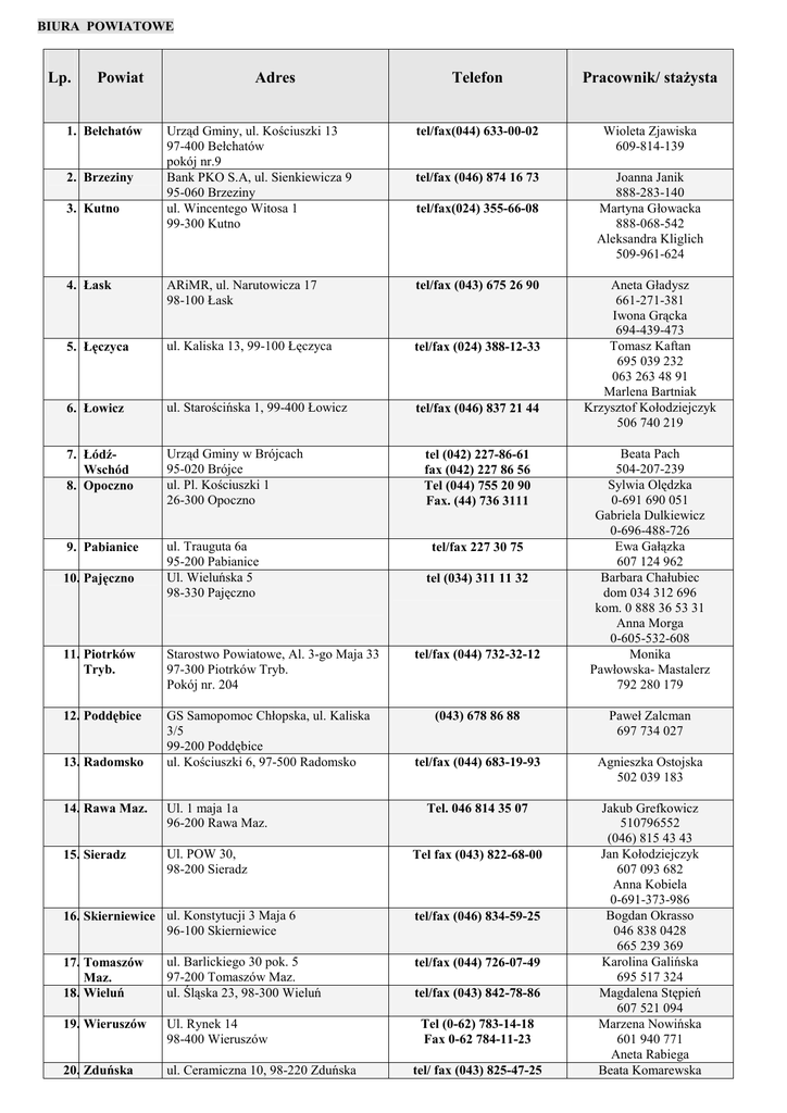 BIURA POWIATOWE Lp. Powiat 1. Bełchatów 2. Brzeziny 3. Kutno Adres Urząd Gminy, ul. Kościuszki 13 97-400 Bełchatów pokój nr.9 Bank PKO S.A, ul. Sienkiewicza 9 95-060 Brzeziny ul. Wincentego Witosa 1 99-300 Kutno Telefon Pracownik/ staŜysta tel/fax(044) 633-00-02 Wioleta Zjawiska 609-814-139 tel/fax (046) 874 16 73 Joanna Janik 888-283-140 Martyna Głowacka 888-068-542 Aleksandra Kliglich 509-961-624 tel/fax(024) 355-66-08 4. Łask ARiMR, ul. Narutowicza 17 98-100 Łask tel/fax (043) 675 26 90 5. Łęczyca ul. Kaliska 13, 99-100 Łęczyca tel/fax (024) 388-12-33 6. Łowicz ul. Starościńska 1, 99-400 Łowicz tel/fax (046) 837 21 44 7. ŁódźWschód 8. Opoczno Urząd Gminy w Brójcach 95-020 Brójce ul. Pl. Kościuszki 1 26-300 Opoczno 9. Pabianice ul. Trauguta 6a 95-200 Pabianice Ul. Wieluńska 5 98-330 Pajęczno 10. Pajęczno 11. Piotrków Tryb. Starostwo Powiatowe, Al. 3-go Maja 33 97-300 Piotrków Tryb. Pokój nr. 204 12. Poddębice GS Samopomoc Chłopska, ul. Kaliska 3/5 99-200 Poddębice ul. Kościuszki 6, 97-500 Radomsko 13. Radomsko 14. Rawa Maz. Ul. 1 maja 1a 96-200 Rawa Maz. 15. Sieradz Ul. POW 30, 98-200 Sieradz 16. Skierniewice ul. Konstytucji 3 Maja 6 96-100 Skierniewice 17. Tomaszów Maz. 18. Wieluń ul. Barlickiego 30 pok. 5 97-200 Tomaszów Maz. ul. Śląska 23, 98-300 Wieluń 19. Wieruszów Ul. Rynek 14 98-400 Wieruszów 20. Zduńska ul. Ceramiczna 10, 98-220 Zduńska tel (042) 227-86-61 fax (042) 227 86 56 Tel (044) 755 20 90 Fax. (44) 736 3111 tel/fax 227 30 75 tel (034) 311 11 32 tel/fax (044) 732-32-12 Aneta Gładysz 661-271-381 Iwona Grącka 694-439-473 Tomasz Kaftan 695 039 232 063 263 48 91 Marlena Bartniak Krzysztof Kołodziejczyk 506 740 219 Beata Pach 504-207-239 Sylwia Olędzka 0-691 690 051 Gabriela Dulkiewicz 0-696-488-726 Ewa Gałązka 607 124 962 Barbara Chałubiec dom 034 312 696 kom. 0 888 36 53 31 Anna Morga 0-605-532-608 Monika Pawłowska- Mastalerz 792 280 179 (043) 678 86 88 Paweł Zalcman 697 734 027 tel/fax (044) 683-19-93 Agnieszka Ostojska 502 039 183 Tel. 046 814 35 07 Jakub Grefkowicz 510796552 (046) 815 43 43 Jan Kołodziejczyk 607 093 682 Anna Kobiela 0-691-373-986 Bogdan Okrasso 046 838 0428 665 239 369 Karolina Galińska 695 517 324 Magdalena Stępień 607 521 094 Marzena Nowińska 601 940 771 Aneta Rabiega Beata Komarewska Tel fax (043) 822-68-00 tel/fax (046) 834-59-25 tel/fax (044) 726-07-49 tel/fax (043) 842-78-86 Tel (0-62) 783-14-18 Fax 0-62 784-11-23 tel/ fax (043) 825-47-25 Wola 21. Zgierz Wola KRUS w Zgierzu, ul. Długa 21a 95-100 Zgierz tel/fax (042) 716-04-60 608-452-578 043 824 72 40 Jerzy Kuzański 0-693-149-421 Beata Krajewska 0-889-411-754