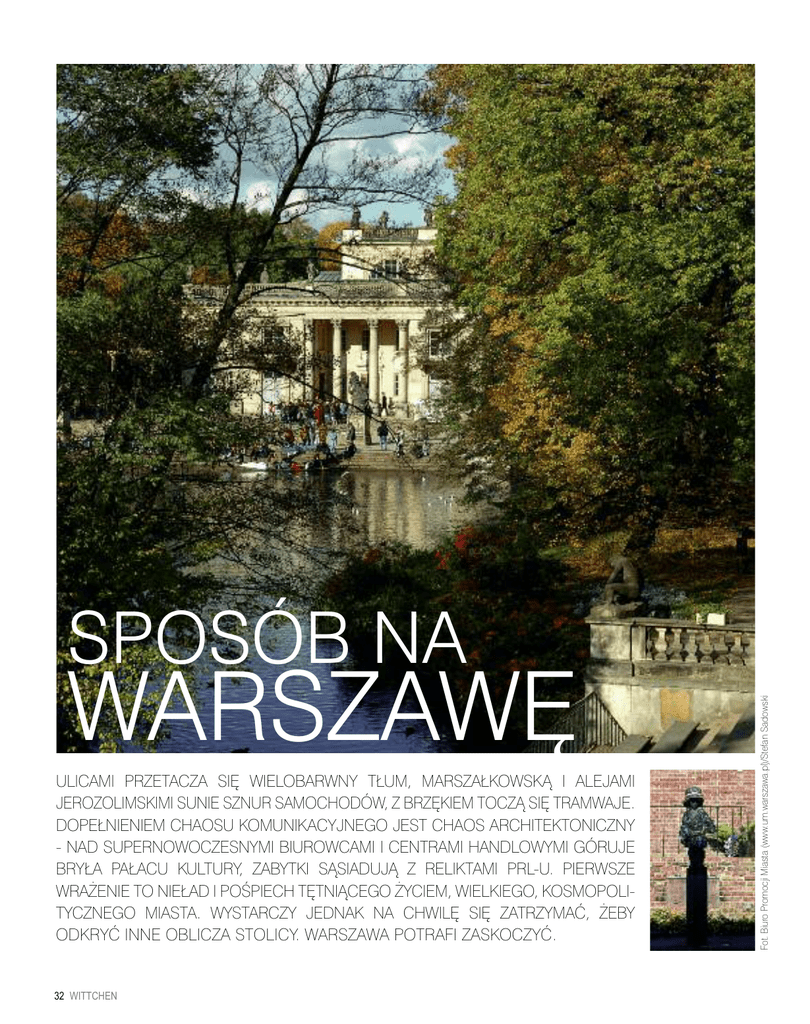 WARSZAWĘ ULICAMI PRZETACZA SIĘ WIELOBARWNY TŁUM, MARSZAŁKOWSKĄ I ALEJAMI JEROZOLIMSKIMI SUNIE SZNUR SAMOCHODÓW, Z BRZĘKIEM TOCZĄ SIĘ TRAMWAJE. DOPEŁNIENIEM CHAOSU KOMUNIKACYJNEGO JEST CHAOS ARCHITEKTONICZNY - NAD SUPERNOWOCZESNYMI BIUROWCAMI I CENTRAMI HANDLOWYMI GÓRUJE BRYŁA PAŁACU KULTURY, ZABYTKI SĄSIADUJĄ Z RELIKTAMI PRL-U. PIERWSZE WRAŻENIE TO NIEŁAD I POŚPIECH TĘTNIĄCEGO ŻYCIEM, WIELKIEGO, KOSMOPOLITYCZNEGO MIASTA. WYSTARCZY JEDNAK NA CHWILĘ SIĘ ZATRZYMAĆ, ŻEBY ODKRYĆ INNE OBLICZA STOLICY. WARSZAWA POTRAFI ZASKOCZYĆ. 32 WITTCHEN Fot. Biuro Promocji Miasta (www.um.warszawa.pl)/Stefan Sadowski SPOSÓB NA warto zobaczyć DLA WARSZAWIAKÓW Z DZIADA PRADZIADA STOLICA JEST PRZEDE WSZYSTKIM MIASTEM PAMIĘCI. BARDZIEJ NIŻ ISTNIEJĄCE BUDYNKI ŚWIADCZĄ O NIEJ ŚLADY – POMNIKI, TABLICE Z CHARAKTERYSTYCZNĄ KOTWICĄ – SYMBOLEM POLSKI WALCZĄCEJ, A TAKŻE ODPRYSKI PO KULACH, WCIĄŻ WIDOCZNE NA NIEKTÓRYCH KAMIENICACH. Fot. Biuro Promocji Miasta (www.um.warszawa.pl)/Jerzy Kośnik, Zbigniew Panów oraz archiwum SBIiPT/W. Panów, Z. Panów, K. Naperty MIASTO OTWARTE Stolicą stała się oficjalnie pod koniec XVI wieku, gdy Zygmunt III Waza przeniósł tu z Krakowa swą siedzibę. Dziś Warszawa to największe miasto Polski – ma ponad 2 miliony mieszkańców i 517 km2 powierzchni. Jest siedzibą władz centralnych i ponad sześćdziesięciu uczelni wyższych (w tym czterech największych w kraju), działa tu około 300 tysięcy zarejestrowanych firm, a także liczne instytucje kulturalne – blisko trzydzieści stałych teatrów, Filharmonia Narodowa, muzea i galerie... Funkcja centrum politycznego, administracyjnego, handlowego i kulturalnego to dla miasta zaszczyt, ale i wyzwanie. Podobnie jak dla jego mieszkańców. Dzięki swym rozmiarom, wielości pełnionych funkcji i ogromnej różnorodności Warszawa jest na swój sposób „miastem otwartym”. Nieustannie przyciąga nowych obywateli – polskich i zagranicznych biznesmenów, architektów i inwestorów, awangardowych artystów... A także – może przede wszystkim – młodych ludzi przyjeżdżających tu na studia (to wszak największy ośrodek akademicki w Polsce), szukających pracy czy po prostu życiowej szansy. Na przybyszach stolica nie zawsze robi korzystne wrażenie – z jednej strony, nikt nie zaprzecza, że można tu rozwinąć skrzydła, z drugiej – wielu przyjezdnych uważa Warszawę za miasto trudne. Męczące, narzucające zbyt szybkie i nerwowe tempo życia, a w dodatku brzydkie. W POSZUKIWANIU HISTORII Nie da się ukryć, że Warszawa nie jest miastem typowo turystycznym – zwłaszcza w porównaniu z Krakowem, Gdańskiem czy Wrocławiem. Komuś, kto przyjeżdża tu na kilka dni, proponuje się zazwyczaj „program minimum”: Stare i Nowe Miasto, Wilanów, Łazienki z pałacem Na Wodzie i Belwederem. Tymczasem to nie wszystko. Zabytki – od Zamku Ujazdowskiego, przez plac Trzech Krzyży, Pałac Zamoyskich i Pałac Staszica, po kościół Świętego Krzyża i budynki tworzące zespół Uniwersytetu Warszawskiego – rozsiane są wzdłuż całego Traktu Królewskiego. Przy placu Teatralnym wzrok przyciąga majestatyczny gmach Teatru Wielkiego i niedawno zrekonstruowany budynek dawnego ratusza (obecnie siedziba banku). Tuż obok, za Grobem Nieznanego Żołnierza, można odpocząć na ławeczce przy słynnej fontannie w Ogrodzie Saskim. Obok budynku Zachęty – najstarszego salonu wystawowego w mieście – wznosi się XVIII-wieczny kościół ewangelicko-augsburski. Na ulicy Twardej stoi Synagoga im. Nożyków, która jako jedyna z czynnych dziś warszawskich bóżnic przetrwała II wojnę światową. Najwięcej zabytkowych (autentycznych lub odrestaurowanych) kamienic, pałaców i świątyń można spotkać w Śródmieściu. Jednak niemal każda ze starszych dzielnic Warszawy – czy to Ochota, czy Wola, Mokotów, Żoliborz albo Praga – może pochwalić się miejscem lub obiektem świadczącym o bogatej historii. WALCZĄCA, NIEZŁOMNA Paradoksalnie, chyba jednym z najmniej „zabytkowych” miejsc w Warszawie jest Starówka. Zarówno Zamek Królewski, jak i większość kamienic przy rynku to rekonstrukcje, budynki zaledwie pięćdziesięcioletnie. Walki podczas powstania w getcie i Powstania Warszawskiego, a także późniejsze celowe wyburzanie i palenie budynków przez hitlerowskie oddziały niszczycielskie sprawiły, że pod koniec wojny 85% zabudowy Warszawy leżało w gruzach. Wojna spustoszyła stolicę, w zamian dała jej jednak heroiczną legendę i prawo do legitymowania się mianem miasta niezłomnego. Pod Barbakanem, w cieniu murów obronnych, stoi niewielki pomnik Małego Powstańca (przez mieszkańców zwanego „Antkiem”), na powstałym w miejscu dzielnicy żydowskiej Muranowie – pomnik Bohaterów Getta. Dla warszawiaków z dziada pradziada stolica jest przede wszystkim miastem pamięci. Bardziej niż istniejące budynki świadczą o niej ślady – pomniki, tablice z charakterystyczną kotwicą – symbolem Polski Walczącej, a także odpryski po kulach, wciąż widoczne na niektórych kamienicach. Co roku 1 sierpnia, wraz z wybiciem 17.00 – godziny „W” – całe miasto na chwilę zamiera. Zatrzymują się przechodnie, hamują samochody, wyją syreny – w ten sposób Warszawa oddaje hołd swoim bohaterom. Toczy się tu nieustanny dialog historii ze współczesnością. Znakomitym tego przykładem jest Muzeum Powstania Warszawskiego – najnowocześniejsze w mieście, multimedialne, fascynujące. Można w nim nie tylko zobaczyć historyczne eksponaty, ale i obejrzeć film, posłuchać dźwięku bomb, a nawet przejść kilka metrów zrekonstruowanym kanałem. WITTCHEN 33 Warszawa ma wiele symboli: „Antek”, Syrenka, Kolumna Zygmunta, pomniki Fryderyka Chopina i Mikołaja Kopernika... Ze stolicą najbardziej kojarzy się Pałac Kultury, wzniesiony w 1955 roku przy placu Defilad. To najwyższy i chyba najdziwniejszy budynek w Polsce. Inspiracją dla radz
