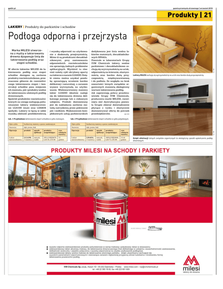 gpd24.pl gazeta przemysłu drzewnego | wrzesień 2010 Produkty | 21 Lakiery | Produkty do parkietów i schodów W ofercie lakierów MILESI do lakierowania podłóg oraz stopni schodów dostępne są zarówno produkty rozcieńczalnikowe, przeznaczone głównie do rzemieślniczego lakierowania stopni i konstrukcji schodów poza miejscem ich montażu, jak i produkty wodne do lakierowania ułożonych podłóg drewnianych. Spośród produktów rozcieńczalnikowych na uwagę zasługują poliuretanowe lakiery wielowarstwowe LGA190 (mat) oraz LDA834 (połysk). Lakiery te łączą w sobie wysoką zdolność powłokotwórczą i wysoką odporność na użytkowanie z doskonałą przejrzystością. Mimo iż są produktami dwuskładnikowymi, przy zastosowaniu odpowiednich rozcieńczalników nie sprawiają żadnych problemów aplikacyjnych. Wyróżnić tu również należy cykl akrylowy oparty na lakierze o nazwie LUA930. Dzięki niemu można uzyskać powłokę sprawiającą wrażenie bardzo delikatnej i naturalnej, a zarazem wysoce wytrzymałą na użytkowanie. Wielowarstwowy matowy lakier LUA930 idealnie nadaje się do lakierowania drewna delikatnego jasnego lub o ciekawym usłojeniu. Produkt dostosowany jest do nakładania zarówno metodą natryskową przez polewanie jak i wałkiem. Wykonawcom kompleksowych usług parkieciarskich tab. 1 Przykładowe lakierowanie stopni schodów w cyklu matowym. dedykowana jest linia wodna lakierów matowych, dwuskładnikowych HPA4/x. Powstałe w laboratoriach Grupy IVM Chemicals lakiery wodne parkietowe i dwuskładnikowe cechują się wytrzymałością na ucisk, odpornością na ścieranie, elastycznością oraz bardzo dużą przyczepnością międzywarstwową i do podłoża. Ze względu na brak zawartości lotnych związków organicznych stanowią ekologiczny wariant lakierowania podłóg. Jak zapewniają polscy przedstawiciele Grupy IVM Chemicals, producenta marki MILESI, rozwinięta sieć dystrybucyjna pozwala Grupie zbierać doświadczenie płynące z rynku i elastycznie dostosowywać ofertę do potrzeb przedsiębiorców. opr. (rr) Lakiery MILESI cechują się wytrzymałością na ucisk oraz bardzo dużą przyczepnością. tab. 2 Przykładowe lakierowanie stopni schodów w cyklu połyskowym. Opis cyklu bezbarwny matowy o porze zamkniętym Opis cyklu bezbarwny matowy o porze zamkniętym Surowiec dąb, jesion, buk Surowiec dąb, jesion, buk Operacja produkt sposób aplikacji produkty uzupełniające czas schnięcia warstwy Operacja produkt sposób aplikacji produkty uzupełniające czas schnięcia warstwy Lakier nawierzchniowy LGA190, 3 warstwy natrysk, wałek 50% LNB20670, LZC18, LTC40 12 godzin Lakier nawierzchniowy LDA834, 3 warstwy natrysk, wałek 100%LNB24046, LZC71, LTC40 12-16 godzin fot. IVM Marka MILESI stworzona z myślą o lakierowaniu drewna dysponuje linią do lakierowania podłóg oraz stopni schodów. fot. IVM Podłoga odporna i przejrzysta Dzięki eliminacji lotnych związków organicznych to ekologiczny sposób wykańczania podłóg drewnianych.