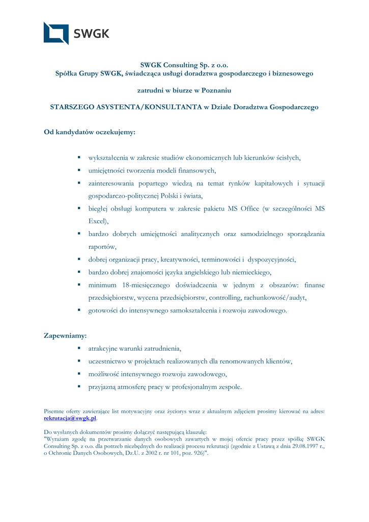 SWGK Consulting Sp. z o.o. Spółka Grupy SWGK, świadcząca usługi doradztwa gospodarczego i biznesowego zatrudni w biurze w Poznaniu STARSZEGO ASYSTENTA/KONSULTANTA w Dziale Doradztwa Gospodarczego Od kandydatów oczekujemy: wykształcenia w zakresie studiów ekonomicznych lub kierunków ścisłych, umiejętności tworzenia modeli finansowych, zainteresowania popartego wiedzą na temat rynków kapitałowych i sytuacji gospodarczo-politycznej Polski i świata, biegłej obsługi komputera w zakresie pakietu MS Office (w szczególności MS Excel), bardzo dobrych umiejętności analitycznych oraz samodzielnego sporządzania raportów, dobrej organizacji pracy, kreatywności, terminowości i dyspozycyjności, bardzo dobrej znajomości języka angielskiego lub niemieckiego, minimum 18-miesięcznego doświadczenia w jednym z obszarów: finanse przedsiębiorstw, wycena przedsiębiorstw, controlling, rachunkowość/audyt, gotowości do intensywnego samokształcenia i rozwoju zawodowego. Zapewniamy: atrakcyjne warunki zatrudnienia, uczestnictwo w projektach realizowanych dla renomowanych klientów, możliwość intensywnego rozwoju zawodowego, przyjazną atmosferę pracy w profesjonalnym zespole. Pisemne oferty zawierające list motywacyjny oraz życiorys wraz z aktualnym zdjęciem prosimy kierować na adres: [email protected]. Do wysłanych dokumentów prosimy dołączyć następującą klauzulę: "Wyrażam zgodę na przetwarzanie danych osobowych zawartych w mojej ofercie pracy przez spółkę SWGK Consulting Sp. z o.o. dla potrzeb niezbędnych do realizacji procesu rekrutacji (zgodnie z Ustawą z dnia 29.08.1997 r., o Ochronie Danych Osobowych, Dz.U. z 2002 r. nr 101, poz. 926)".