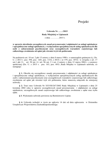 Projekt Uchwała Nr ……/2015 Rady Miejskiej w Lipianach z dnia …………2015 r. w sprawie określenia szczegółowych zasad przyznawania i odpłatności za usługi opiekuńcze i specjalistyczne usługi opiekuńcze, z wyłączeniem specjalistycznych usług opiekuńczych dla osób z zaburzeniami psychicznymi oraz szczegółowych warunków częściowego lub całkowitego zwolnienia od opłat jak równieŜ tryb ich pobierania Na podstawie art. 18 ust. 2 pkt 15 ustawy z dnia 8 marca 1990 r. o samorządzie gminnym (t.j. Dz. U. z 2013 r. poz. 594, poz. 645, poz. 1318, z 2014 r. nr 379, poz. 1072) w związku z art. 17 ust.1 pkt 11, art. 50 ust. 6 i art. 96 ust. 2 i ust. 4 ustawy z dnia 12 marca 2004 r. o pomocy społecznej (Dz. U. z 2015 r. poz. 163, poz. 693) ,Rada Miejska w Lipianach uchwala, co następuje: § 1. Określa się szczegółowe zasady przyznawania i odpłatności za usługi opiekuńcze i specjalistyczne usługi opiekuńcze, z wyłączeniem specjalistycznych usług opiekuńczych dla osób z zaburzeniami psychicznymi oraz szczegółowych warunków częściowego lub całkowitego zwolnienia od opłat jak równieŜ tryb ich pobierania, które stanowią załącznik do niniejszej uchwały. § 2. Traci moc Uchwała Nr XXVIII/267/2002 Rady Miejskiej w Lipianach z dnia 25 kwietnia 2002 roku w sprawie szczegółowych zasad przyznawania i odpłatności za usługi opiekuńcze, szczegółowych zasad częściowego lub całkowitego zwolnienia z opłat oraz trybu opłat. § 3. Wykonanie uchwały powierza się Burmistrzowi Lipian. § 4. Uchwała wchodzi w Ŝycie po upływie 14 dni od dnia ogłoszenia w Dzienniku Urzędowym Województwa Zachodniopomorskiego. Uzasadnienie Zgodnie z art. 17 ust. 1 pkt. 11 ustawy z dnia 12 marca 2004 r. (tekst jedn. Dz. U. z 2015 r. poz. 163) o pomocy społecznej do zadań własnych gminy o charakterze obowiązkowym naleŜy: organizowanie i świadczenie usług opiekuńczych, w tym specjalistycznych usług opiekuńczych, w miejscu zamieszkania, z wyłączeniem specjalistycznych usług opiekuńczych dla osób z zaburzeniami psychicznymi. Art. 50 ust. 6 ustawy nakłada na gminę obowiązek określenia w drodze uchwały, szczegółowych warunków przyznawania i odpłatności za usługi opiekuńcze i specjalistyczne usługi opiekuńcze z wyłączeniem specjalistycznych usług opiekuńczych dla osób z zaburzeniami psychicznymi oraz szczegółowych warunków częściowego lub całkowitego zwolnienia od opłat, jak równieŜ tryb ich pobierania. Usługi opiekuńcze przyznawane są osobom, które z powodu wieku, choroby lub innych przyczyn wymagają pomocy innych osób, a są jej pozbawione i rodzina nie moŜe takiej pomocy zapewnić. Obejmują one pomoc w zaspokajaniu codziennych potrzeb Ŝyciowych (tj. zapewnienia poprzez zakup niezbędnych produktów , przygotowanie posiłków, karmienie), opiekę higieniczną (tj. mycie, pranie, sprzątanie itp.), zaleconą przez lekarza pielęgnację oraz w miarę moŜliwości zapewnienie kontaktów z otoczeniem. W sprawach dotyczących przyznania usług opiekuńczych mają zastosowanie przepisy Kodeksu postępowania administracyjnego oraz ustawy o pomocy społecznej, w tym równieŜ zasada kierowania się w postępowaniu dobrem osób korzystających z pomocy. Poprzednia rzeczywista stawka usług opiekuńczych wynosiła 13,70 zł za godzinę i obowiązywała od 1 maja 2002 r. W związku z powyŜszym przyjęcie niniejszej uchwały jest uzasadnione. Projekt Załącznik do Uchwały Nr….. Rady Miejskiej w Lipianach z dnia ………….2015 r. Szczegółowe zasady przyznawania i odpłatności za usługi opiekuńcze i specjalistyczne usługi opiekuńcze z wyłączeniem specjalistycznych usług opiekuńczych dla osób z zaburzeniami psychicznymi oraz szczegółowe warunki częściowego lub całkowitego zwolnienia od opłat jak równieŜ tryb ich pobierania. §1.1. Usługi opiekuńcze i specjalistyczne usługi opiekuńcze organizuje Ośrodek Pomocy Społecznej w Lipianach. 2. Usługi opiekuńcze i specjalistyczne usługi opiekuńcze świadczone są w miejscu zamieszkania świadczeniobiorcy. 3. Usługi opiekuńcze i specjalistyczne usługi opiekuńcze są formą pomocy, do której uprawnione są osoby samotne, które z powodu wieku, choroby lub innych przyczyn wymagają pomocy innych osób, a nie są w stanie samodzielnie zaspokoić codziennych potrzeb. 4. Usługi opiekuńcze lub specjalistyczne usługi opiekuńcze mogą być przyznawane równieŜ osobie, która wymaga pomocy innych osób, a rodzina, takŜe wspólnie zamieszkujący małŜonek, wstępni, zstępni nie mogą takiej pomocy zapewnić. 5. Wymiar i zakres przyznawania usług opiekuńczych i specjalistycznych usług opiekuńczych uzaleŜniony jest od stanu zdrowia świadczeniobiorcy, jego sytuacji rodzinnej oraz sytuacji materialnej jego rodziny, ustalonej przez pracownika socjalnego w drodze rodzinnego wywiadu środowiskowego. 6. Pracownik socjalny przeprowadzający wywiad moŜe domagać się od osób zobowiązanych do alimentacji w stosunku do osoby korzystającej z pomocy, złoŜenia oświadczenia o dochodach oraz deklaracje pomocy finansowej na jej rzecz. 7. Usługi przyznaje się na wniosek osoby zainteresowanej, jej przedstawiciela ustawowego, innej osoby, a takŜe z urzędu, za zgodą osoby zainteresowanej lub jej przedstawiciela ustawowego. 8. Ośrodek Pomocy Społecznej w Lipiany przyznając usługi opiekuńcze, ustala ich zakres, okres i miejsce świadczenia. 9. Usługi opiekuńcze przyznawane są przez 5 dni w tygodniu w zaleŜności od potrzeb. §2.1.Odpłatność za usługi ustalana jest miesięcznie na podstawie obowiązującej ceny za jedną godzinę świadczenia usług (roboczogodzinę). 2. Kwotę miesięcznej odpłatności za wykonane usługi stanowi iloczyn ceny, o której mowa w ust. 1, wskaźnika odpłatności określonego w procentach, o którym mowa w tabeli oraz liczby godzin usług świadczonych w ciągu miesiąca. 3. Koszt jednej godziny usług opiekuńczyc