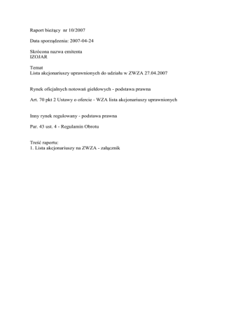 Raport bieŜący nr 10/2007 Data sporządzenia: 2007-04-24 Skrócona nazwa emitenta IZOJAR Temat Lista akcjonariuszy uprawnionych do udziału w ZWZA 27.04.2007 Rynek oficjalnych notowań giełdowych - podstawa prawna Art. 70 pkt 2 Ustawy o ofercie - WZA lista akcjonariuszy uprawnionych Inny rynek regulowany - podstawa prawna Par. 43 ust. 4 - Regulamin Obrotu Treść raportu: 1. Lista akcjonariuszy na ZWZA - załącznik