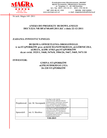 Przedsiębiorstwo Wielobranżowe „MAGRA” Marek Szczepanik i Włodzimierz Synowiec ul. Targowa 17; 26-200 Końskie tel./ fax (041) 372 33 21; (041) 372 58 35 NIP 658-00-01-550 www.pwmagra.prv.pl Rok zał. 1991 Firma Roku 2002 REGON 290144004 e-mail. [email protected] Nr arch. Magra 169 -2011 ANEKS DO PROJEKTU BUDOWLANEGO DECYZJA NR BP.6740.605.2011.KC z dnia 22-12-2011 ZADANIA INWESTYCYJNEGO: BUDOWA OŚWIETLENIA DROGOWEGO w m.STĄPORKÓW przy ul.KOCHANOWSKIEGO, ul.GÓRNICZEJ, ul.REJA, ul.DR ANKI gm.STĄPORKÓW dz.nr ewid. 3525/1, 5468, 5476/8, 3584/26, 5467, 5469, 5471/18 INWESTOR: GMINA STĄPORKÓW ul.PIŁSUDSKIEGO 132A 26-220 STĄPORKÓW Projektował: inż. M. Szczepanik Sprawdził: inż. S. Skrobisz Upr Bud. nr KL 564/94 zaśw.Ś.O.I.I.B.-SWK/IE/1065/01 projektowanie i kierowanie robotami b/o w specjalności instalacyjnej w zakresie sieci, instalacji i urządzeń elektrycznych i elektroenergetycznych Upr Bud. nr SWK/0138/POOE/06 zaśw.Ś.O.I.I.B.-SWK/IE/0029/07 projektowanie b/o w specjalności instalacyjnej w zakresie sieci, instalacji i urządzeń elektrycznych i elektroenergetycznych VIII-2015 Spis treści • 1. 2. 3. 4. Przedmiot i zakres inwestycji...................................................................................................................... 3 Lokalizacja inwestycji................................................................................................................................. 3 Zagospodarowanie terenu ........................................................................................................................... 3 Projekt zagospodarowania .Rysunek PZ-1-1 .............................................................................................. 4 Protokół z narady koordynacyjnej............................................................................................................... 5 • Przedmiot i zakres inwestycji Przedmiotem niniejszego opracowania jest zmiana lokalizacji 6 z 38 szt. projektowanych słupów wydzielonego oświetlenia drogowego w stosunku do projektu podstawowego oraz odcinka linii kablowej nN zasilającą przedmiotowe słupy. 1. Lokalizacja inwestycji. Teren inwestycji w stosunku do projektu podstawowego, zostanie powiększony o działkę gminną nr ewid 5471/18 2. Zagospodarowanie terenu Charakterystyka terenu w granicach opracowania E'...T-E' Rys.PZ-1-1 pokrywa się z granicami w stosunku do projektu podstawowego, powiększona o działkę gminną nr 5471/8 3. Projekt zagospodarowania .Rysunek PZ-1-1 4. Protokół z narady koordynacyjnej. 5. INFORMACJA DOTYCZĄCA BEZPIECZEŃSTWA I OHRONY ZDROWIA ANEKS DO PROJEKTU BUDOWLANEGO DECYZJA NR BP.6740.605.2011.KC z dnia 22-12-2011 ZADANIA INWESTYCYJNEGO: BUDOWA OŚWIETLENIA DROGOWEGO w m.STĄPORKÓW przy ul.KOCHANOWSKIEGO, ul.GÓRNICZEJ, ul.REJA, ul.DR ANKI gm.STĄPORKÓW dz.nr ewid. 3525/1, 5468, 5476/8, 3584/26, 5467, 5469, 5471/18 INWESTOR: GMINA STĄPORKÓW ul.PIŁSUDSKIEGO 132A 26-220 STĄPORKÓW 2.1. Informacje ogólne. Przedmiotem niniejszego opracowania jest zmiana lokalizacji 6 z 38 szt. projektowanych słupów wydzielonego oświetlenia drogowego w stosunku do projektu podstawowego oraz odcinka linii kablowej nN zasilającą przedmiotowe słupy. Teren inwestycji w stosunku do projektu podstawowego, zostanie powiększony o działkę gminną nr ewid 5471/18 Charakterystyka terenu w granicach opracowania E'...T-E' Rys.PZ-1-1 pokrywa się z granicami w stosunku do projektu podstawowego, powiększona o działkę gminną nr 5471/8 2.2. Zakres robót oraz kolejność realizacji poszczególnych obiektów • • • • 2.3. Wybudować 6 szt. stanowisk słupowych, słupów stalowych na fundamentach prefabrykowanych ze złączami przyłączeniowymi przy podstawach. Szczegóły PZ-1-1 Na słupach projektuje się oprawy drogowe o stopniu ochrony IP 65 w II klasie ochronności. Oprawy należy wyposażyć w wysokoprężne lampy sodowe o mocy 70W każda oraz montować na wysięgnikach 2m o kącie 150 na szczycie słupów. Wykonać przecisk pod chodnikiem Wykopać rów kablowy, ułożyć kabel YAKXS 4x35, rury osłonowe, folie niebieską i wykonać inwentaryzację geodezyjną, a następnie zasypać i uporządkować teren. Szczegóły PZ-1. Istniejące obiekty budowlane Po trasie inwestycji liniowej: • Linia napowietrzna nn przewodami gołymi • Droga gminna i powiatowa • uzbrojenie podziemne znajdujące się w miejscu robót budowlanych. Elementy zagospodarowania działki i terenu które mogą stwarzać zagrożenie bezpieczeństwa i zdrowia ludzi 2.4. a) Droga po której odbywa się ruch pojazdów b) Linia nN kablowa i napowietrzna c) Uzbrojenie podziemne znajdujące się w miejscu robót budowlano-montażowych 2.5. Przewidywane zagrożenia występujące podczas realizacji robót budowlanych a) b) c) • • • • Ruch pojazdów i ludzi Praca na wysokości h ≥ 5m Do prac stwarzających zagrożenie zalicza się w szczególności prace: w pobliżu nie osłoniętych urządzeń będących pod napięciem (np.konstrukcje wsporcze) związane z identyfikacją i przecinaniem kabli elektroenergetycznych przy wykonywaniu prób i pomiarów przy urządzeniach znajdujących się pod napięciem • • 2.6. na linii wyłączonej spod napięcia, która krzyżuje się z linią pod napięciem przy wyłączonych spod napięcia linii, które krzyżują się w strefie ograniczonej uziemieniami ochronnymi z liniami znajdującymi się pod napięciem Sposób prowadzenia instruktażu pracowników przed przystąpieniem do realizacji robót szczególnie niebezpiecznych a) Należy poinformować pracowników o występujących zagrożeniach i miejscu ich wystąpienia oraz przeszkolić ich pod względem BHP b) Określić zasady postępowania w przypadku wystąpienia zagrożenia. c) Zlecenie konieczności stosowania przez pracowników środków ochrony indywidualnej, zabezpieczającymi przed skutkami zagrożenia. d) Omówienie zasad bezpośredniego nadzoru nad pracami szczególnie