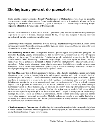 Ekologiczny powrót do przeszlości Blisko pięćdziesięcioro dzieci ze Szkoły Podstawowej w Dobrzelowie wyjechało na początku czerwca na wycieczkę edukacyjną do Parku Jurajsko-Botanicznego w Krasiejowie. Wyjazd był formą nagrody za uczestnictwo w konkursie „Życie z dawnych lat”. Został zorganizowany dzięki wsparciu Starostwa Powiatowego w Bełchatowie. Park w Krasiejowie został otwarty w 2010 roku i, jak do tej pory, zalicza się do trzech najmłodszych tego typu obiektów w Polsce. Zajmuje obszar 40 ha, co daje mu miejsce w ścisłej czołówce największych parków tematycznych w Europie. Uczniowie podczas wyjazdu skorzystali z wielu atrakcji, poprzez zabawę poznali m.in. różne teorie na temat powstania Ziemi i Kosmosu, początków życia na naszej planecie. Do nauki posłużyło wiele różnorodnych pomocy dydaktycznych. Multimedialny Tunel Czasu to magiczne miejsce, gwarantujące niezapomnianą przygodę. Na pokładzie Kapsuły Czasu, przemierzającej 300 metrowy tunel, dzieci udały się w podróż przez miliardy lat istnienia Wszechświata. Podróżnicy mogli podziwiać wizualizacje 3D, które przedstawiały Układ Słoneczny, tworzenie się galaktyk, powstanie życia na Ziemi, rozwój i wymieranie wielu gatunków zwierząt, a także wędrówki kontynentów, zmiany klimatyczne, kataklizmy. Pokaz został stworzony przy użyciu najnowszej techniki operowania obrazem oraz dźwiękiem i został zakończony widokiem Opolszczyzny z okresu triasowego, stanowiąc zachętę do dalszej wędrówki przez następne etapy dziejów życia na Ziemi. Pawilon Muzealny jest jedynym muzeum w Europie, gdzie turyści spoglądając przez balustradę lub patrząc przez grubą szybę znajdującą się pod stopami, oglądają setki kości leżących „in situ”, czyli w miejscu ich odkrycia. Ta wyjątkowa lekcja nie ominęła również naszych dzieciaków. Oprócz pawilonu i eksponatów w gablotach, zwiedzili wystawę poświęconą „silezaurom”. Ścieżka dydaktyczna skupia się na erze mezozoicznej, czyli „erze dinozaurów”. Ten przedział czasowy spędza sen z powiek naukowcom już od wielu pokoleń oraz cieszy się niesłabnącym zainteresowaniem nie tylko ludzi nauki, ale również amatorów. Ponad półtorakilometrowa trasa wiedzie przez teren dawnego wyrobiska. Wzdłuż niej ustawione są modele 250 różnorodnych mezozoicznych płazów i gadów (głównie dinozaurów), wśród których dominuje postać najdłuższego znanego dinozaura - około 60-metrowego amficeliasa. Dzięki ścieżce uczestnicy wycieczki poznali rzeczywiste rozmiary zwierząt mezozoiku. Modele wykonane zostały z niezwykłą dbałością o szczegóły. Rozmieszczone wzdłuż alei liczne plansze zademonstrowały uczniom charakterystyczne dla ery dinozaurów środowisko roślinne. W Prehistorycznym Oceanarium, dzięki osiągnięciom współczesnej techniki, rozegrało się jedyne w swoim rodzaju widowisko. Obserwując kolejne, niewystępujące już dziś morskie zwierzęta, dzieci uległy iluzji spotkania z żywymi stworzeniami. Wydział Ochrony Środowiska, Rolnictwa i Leśnictwa Starostwo Powiatowe w Bełchatowie