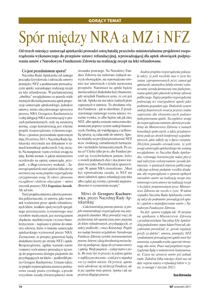 Gorący temat Spór między NRA a MZ i NFZ Od trzech miesięcy samorząd aptekarski prowadzi ostrą batalię przeciwko ministerialnemu projektowi rozporządzenia wykonawczego do przepisów ustawy refundacyjnej, wprowadzającej dla aptek obowiązek podpisywania umów z Narodowym Funduszem Zdrowia na realizację recept na leki refundowane. Co jest przedmiotem sporu? Naczelna Rada Aptekarska od samego początku krytykowała i odrzucała umowy pomiędzy NFZ a podmiotami prowadzącymi apteki, warunkujące realizację recept na leki refundowane. W parlamentarnej „obróbce” uwzględniono co prawda wiele istotnych dla funkcjonowania aptek propozycji samorządu aptekarskiego, jednakże umowy, mimo zdecydowanego sprzeciwu prezesa NRA Grzegorza Kucharewicza i całej delegacji NRA uczestniczącej w pracach parlamentarnych, stały się ustawową normą, czego konsekwencją jest właśnie projekt rozporządzenia wykonawczego. Wraz z pismem przewodnim opatrzonym datą 20 czerwca 2011 r. Naczelna Rada Aptekarska otrzymała ten dokument w ramach konsultacji społecznych. I się zaczęło. Na marginesie: warto zwrócić uwagę na datę. Krótki termin, w jakim ministerstwo oczekiwało na opinię samorządu, przypadł... w długi czerwcowy weekend. – Samorząd aptekarski miał zaledwie kilka dni na merytoryczną ocenę projektu rozporządzenia i przygotowanie uwag. To wbrew zdrowemu rozsądkowi i dobrym obyczajom – mówi rzecznik prasowy NIA Eugeniusz Jarosik. Ale ad rem. Treść projektu ministra zdrowia potwierdza jednoznacznie, że umowa, jako warunek wydawania przez apteki refundowanych leków, środków spożywczych specjalnego przeznaczenia żywieniowego oraz wyrobów medycznych, jest rozwiązaniem zbędnym, nieefektywnym i wysoce biurokratycznym – napisano w piśmie do ministra zdrowia, które w imieniu samorządu aptekarskiego wystosował prezes NRA. Zaznaczono, że przepisy generować będą dodatkowe koszty po stronie NFZ i aptek. Rozporządzenie, ogólne warunki umów i ramowy wzór umowy prowadzą w tej wersji do pogorszenia dostępu pacjentów do przysługujących im leków – podkreślił prezes Grzegorz Kucharewicz. Uznano także, że projekt rozporządzenia narusza podstawowe zasady prawa cywilnego, a przede wszystkim zasadę równorzędności stron 10 stosunku prawnego. Na Narodowy Fundusz Zdrowia nie nałożono żadnych nowych obowiązków, nie wprowadzono również kar umownych z tytułu naruszenia przepisów. Natomiast na apteki będzie można nałożyć drakońskie kary finansowe, gdy urzędnik Funduszu uzna, że coś jest nie tak. Apteka nie ma także żadnych praw zapisanych w umowie. To absolutna władza Funduszu – jak to określono. Z przedstawionego ramowego wzoru umowy wyraźnie wynika, że albo będzie tak jak chce NFZ, albo apteka zostanie zniszczona ekonomicznie poprzez system sankcji finansowych. Osobną, ale współgrającą z tą filozofią sprawą, są załączniki do umowy. Apteka miałaby na przykład przedstawiać NFZ m.in. ewidencję zatrudnionych farmaceutów i techników farmaceutycznych. Po co, na co? Chyba tylko po to, aby Fundusz poczuł się wszechwładnym panem, który o swoich poddanych chce i ma prawo wiedzieć wszystko. Powróciła także sprawa recept. W opinii NRA stwierdzono: „Musi być wprowadzona zasada, że NFZ nie może odmówić aptece refundacji ceny leku albo żądać jej zwrotu z powodu nieprawidłowości w wystawieniu recepty”. Mówi dr Grzegorz Kucharewicz, prezes Naczelnej Rady Aptekarskiej: – Cała konstrukcja prawna sprawia, że projekt ministerialnego rozporządzenia ma antypacjencki charakter. Może prowadzić wręcz do pozbawienia lub ograniczenia praw pacjenta do leków refundowanych, przysługujących, co należy podkreślić, z mocy Konstytucji. Projekt ten nadaje bowiem urzędnikom Narodowego Funduszu Zdrowia szerokie instrumentarium prawne, którym z dużą dowolnością można będzie się posługiwać, dążąc do zerwania umowy z apteką. Wtedy pacjencie – szukaj wiatru w polu. Bo może być to przecież ta jedyna apteka w najbliższym otoczeniu – a tak jest w niejednej wsi czy małym mieście. Oczywiście, apteka może odwoływać się od decyzji Funduszu, ale to już zupełnie inna sprawa. Apteka i tak nie przetrwa długiego procesu. Analiza projektu rozporządzenia pokazała także, że jeśli weszłoby ono w życie bez zmian zaproponowanych przez samorząd aptekarski, niemożliwe byłoby również wykonywanie zawodu farmaceuty oraz funkcjonowania apteki jako placówki ochrony zdrowia publicznego. Zapisy projektu rozporządzenia podważają też wiarygodność apteki jako podmiotu gospodarczego. Drakoński system sankcji finansowych stwarza przecież realne zagrożenie dla ekonomicznych podstaw funkcjonowania apteki. Szczegółowe uwagi do rozporządzenia ministra zdrowia przesłaliśmy do Ministerstwa Zdrowia w ramach konsultacji społecznych, a także przedstawiliśmy podczas dwóch konferencji uzgodnieniowych, jakie odbyły się w lipcu i sierpniu. Złożyłem ponadto oświadczenie, że jeśli uwagi samorządu aptekarskiego nie zostaną uwzględnione, to Naczelna Rada Aptekarska, wykonując konstytucyjny nakaz pieczy nad należytym wykonywaniem zawodu farmaceuty, w granicach interesu publicznego i dla jego ochrony podejmie wszelkie działania, aby rozporządzenie w sprawie ogólnych warunków umów na realizację recept oraz ramowego wzoru umowy na realizację recept w kształcie proponowanym przez Ministerstwo Zdrowia nie weszło w życie. W takim wypadku Naczelna Rada Aptekarska zwróci się także do podmiotów prowadzących apteki z apelem o niepodpisywanie umów z Narodowym Funduszem Zdrowia. Na dziś sprawa wygląda tak: 18 sierpnia na spotkaniu w Ministerstwie Zdrowia z przedstawicielami Naczelnej Izby Aptekarskiej podsekretarz stanu Adam Fronczak zdecydowanie powiedział, że „pewne regulacje poszły za daleko”, umowa, pomiędzy NFZ i podmiotami prowadzącymi apteki musi być sensowna, a pona