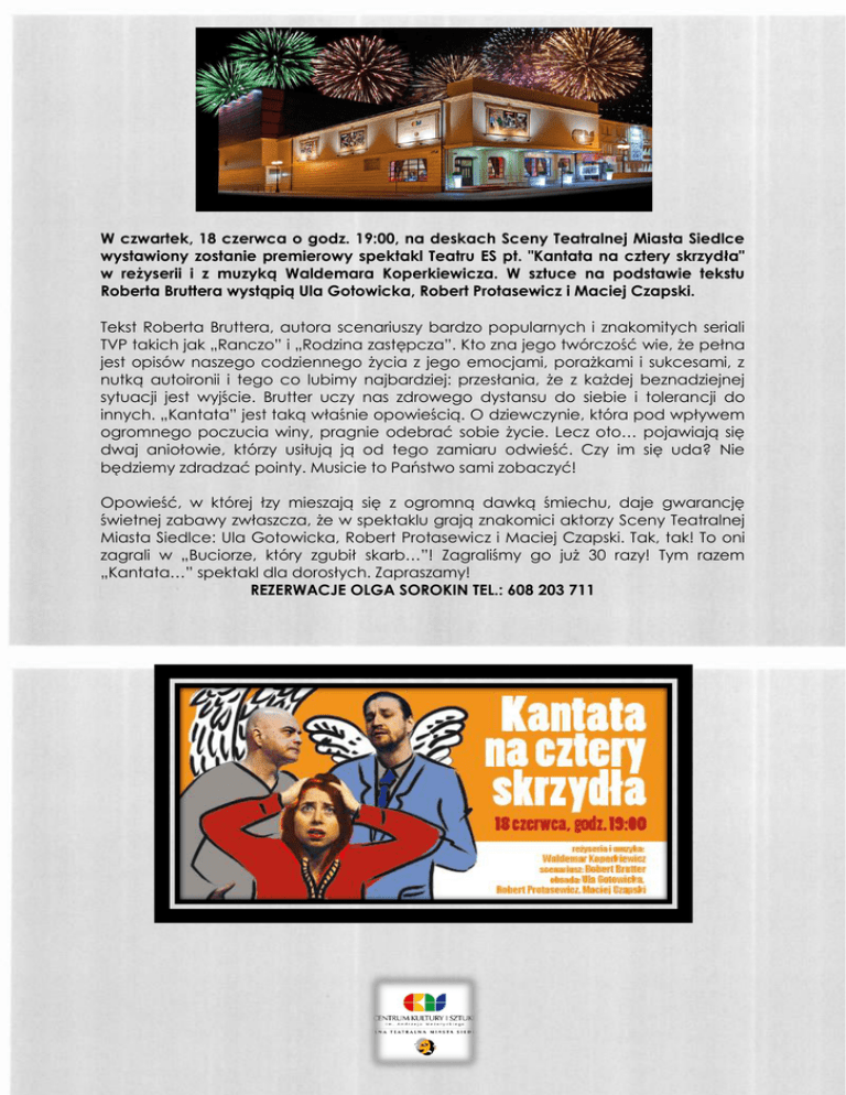 W czwartek, 18 czerwca o godz. 19:00, na deskach Sceny Teatralnej Miasta Siedlce wystawiony zostanie premierowy spektakl Teatru ES pt. "Kantata na cztery skrzydła" w reżyserii i z muzyką Waldemara Koperkiewicza. W sztuce na podstawie tekstu Roberta Bruttera wystąpią Ula Gotowicka, Robert Protasewicz i Maciej Czapski. Tekst Roberta Bruttera, autora scenariuszy bardzo popularnych i znakomitych seriali TVP takich jak „Ranczo” i „Rodzina zastępcza”. Kto zna jego twórczość wie, że pełna jest opisów naszego codziennego życia z jego emocjami, porażkami i sukcesami, z nutką autoironii i tego co lubimy najbardziej: przesłania, że z każdej beznadziejnej sytuacji jest wyjście. Brutter uczy nas zdrowego dystansu do siebie i tolerancji do innych. „Kantata” jest taką właśnie opowieścią. O dziewczynie, która pod wpływem ogromnego poczucia winy, pragnie odebrać sobie życie. Lecz oto… pojawiają się dwaj aniołowie, którzy usiłują ją od tego zamiaru odwieść. Czy im się uda? Nie będziemy zdradzać pointy. Musicie to Państwo sami zobaczyć! Opowieść, w której łzy mieszają się z ogromną dawką śmiechu, daje gwarancję świetnej zabawy zwłaszcza, że w spektaklu grają znakomici aktorzy Sceny Teatralnej Miasta Siedlce: Ula Gotowicka, Robert Protasewicz i Maciej Czapski. Tak, tak! To oni zagrali w „Buciorze, który zgubił skarb…”! Zagraliśmy go już 30 razy! Tym razem „Kantata…” spektakl dla dorosłych. Zapraszamy! REZERWACJE OLGA SOROKIN TEL.: 608 203 711