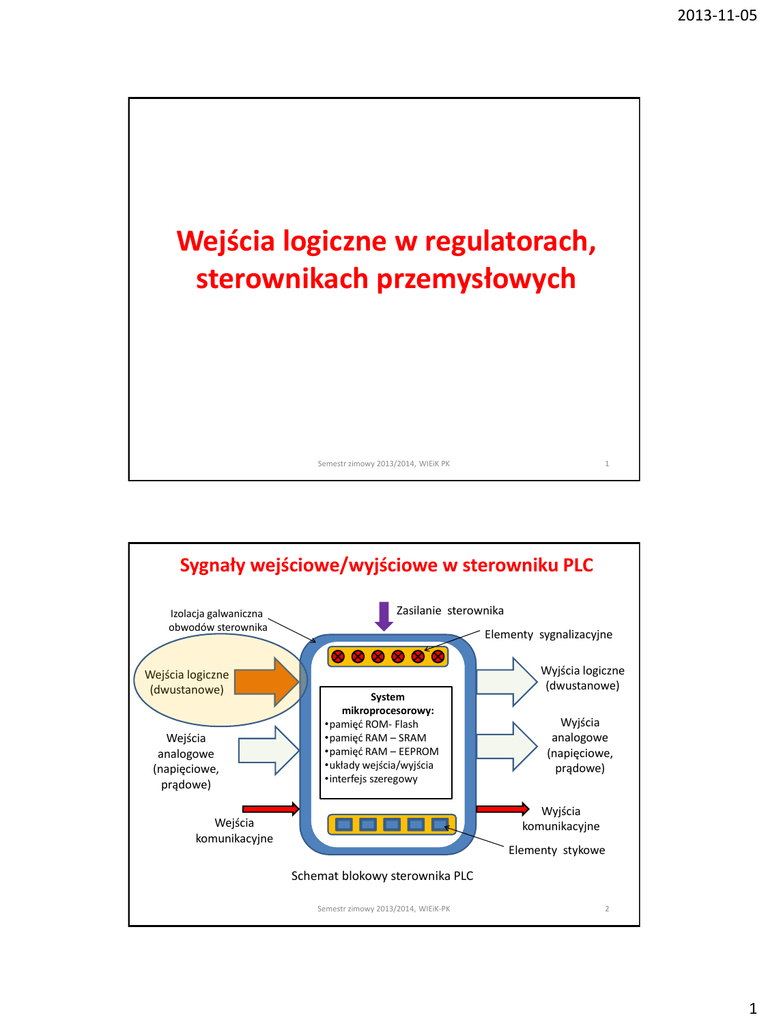 2013-11-05 Wejścia logiczne w regulatorach, sterownikach przemysłowych Semestr zimowy 2013/2014, WIEiK PK 1 Sygnały wejściowe/wyjściowe w sterowniku PLC Izolacja galwaniczna obwodów sterownika Wejścia logiczne (dwustanowe) Wejścia analogowe (napięciowe, prądowe) Zasilanie sterownika Elementy sygnalizacyjne System mikroprocesorowy: •pamięć ROM- Flash •pamięć RAM – SRAM •pamięć RAM – EEPROM •układy wejścia/wyjścia •interfejs szeregowy Wyjścia logiczne (dwustanowe) Wyjścia analogowe (napięciowe, prądowe) Wyjścia komunikacyjne Wejścia komunikacyjne Elementy stykowe Schemat blokowy sterownika PLC Semestr zimowy 2013/2014, WIEiK-PK 2 1 2013-11-05 Podstawowe parametry wejścia logicznego • • • • • • • • • rodzaj napięcia zasilania obwodu wejściowego, DC, AC, DC+AC izolacja galwaniczna z głównym układem sterującym, charakterystyka napięciowa wejścia, (zakres stanu „1” i „0”), typ logiki: logika dodatnia i logika ujemna, maksymalny prąd wejściowy, opóźnienie zadziałania, maksymalna częstotliwość przełączania, odporność na przepięcia, błędne podłączenie, oporność izolacji, odporność na zakłócenia, dodatkowe funkcje, (wejścia mieszane, np. wejście logiczne i wejście analogowe), • sygnalizacja stanu logicznego (dioda LED): po stronie wejściowej lub wyjściowej obwodu wejściowego Semestr zimowy 2013/2014, WIEiK PK 3 Wejście logiczne pojedyncze, czujnik z własnym zasilaniem Rwe czujnik Iwe Układ sterowania czujnika Uwy Układ sterowania Uwe LED LED LED Sygnalizacja stanu logicznego Sygnalizacja stanu logicznego uziemienie, punkt wspólny Izolacja galwaniczna Semestr zimowy 2013/2014, WIEiK PK 4 2 2013-11-05 Wejście logiczne pojedyncze, zasilanie zewnętrzne Rwe Sterownik, czujnik Układ sterowania Iwe Uk Układ sterowania Uwe styk LED Źródło zasilania Sygnalizacja stanu logicznego uziemienie Izolacja galwaniczna Semestr zimowy 2013/2014, WIEiK PK 5 Wejście logiczne pojedyncze, wyjście z czujnika typu PNP Źródło zasilania czujnika + Rwe Układ czujnika, sterowanie Uk Iwe klucz Układ wejściowy Uwe Iwy LED Punkt wspólny Semestr zimowy 2013/2014, WIEiK PK Sygnalizacja stanu logicznego Izolacja galwaniczna 6 3 2013-11-05 Wejście logiczne pojedyncze, wyjście z czujnika typu NPN Źródło zasilania czujnika + Rwe Iwy Układ czujnika, sterowanie Iwe Układ wejściowy Uwe Uk klucz LED Punkt wspólny Sygnalizacja stanu logicznego Izolacja galwaniczna Semestr zimowy 2013/2014, WIEiK PK 7 Podział wejść logicznych. Podział ze względu na izolację galwaniczną Izolacja galwaniczna pomiędzy wejściem a głównym układem sterującym, (mikrokontrolerem), izolacja galwaniczna pomiędzy wejściami i wyjściami sterownika • Wejścia logiczne z izolacją galwaniczną (24Vdc, 110/230Vac) – izolacja wykonana na transoptorze lub izolatorach magnetycznych • Wejścia logiczne z bez izolacji galwanicznej (+5V TTL, 24Vdc) – szybkie wejścia Semestr zimowy 2013/2014, WIEiK PK 8 4 2013-11-05 Podział wejść logicznych. Podział ze względu na szybkość działania • Wejścia standardowe typu 24Vdc z izolacją galwaniczną na transoptorach, czas reakcji (opóźnienie) ok. kilka [ms], max częstotliwość wejściowa ok. kilkaset [Hz]. • Wejścia szybkie typu 24Vdc, izolacją galwaniczną na transoptorach, czas reakcji kilkadziesiąt [us], max częstotliwość wejściowa ok. kilka [kHz]. • Wejścia szybkie, bez izolacji typu TTL (+5V), 24Vdc, czas reakcji [us], max częstotliwość wejściowa ok. kilkanaście [kHz]. • Wejścia standardowe typu 230Vac z izolacją galwaniczną na transoptorach, czas reakcji ok. kilkadziesiąt [ms], max częstotliwość wejściowa ok. kilkanaście [Hz]. Semestr zimowy 2013/2014, WIEiK PK 9 Wejścia logiczne wielokrotne – prąd wpływający (sink input), zasilanie uziemione, logika dodatnia Sterownik Io1 X0 R01 X1 R04 Układ wejściowy X2 R03 +24Vdc COM Semestr zimowy 2013/2014, WIEiK PK 10 5 2013-11-05 Wyjścia logiczne wielokrotne – prąd wypływający, (source input) logika ujemna Sterownik Io1 X0 R01 X1 R04 Układ wejściowy X2 R03 +24Vdc COM Semestr zimowy 2013/2014, WIEiK PK 11 Podstawowe parametry typowych wejść logicznych Parametry wejścia typu 24Vdc (logika dodatnia) • Stan „0” logiczne od -30V do +5V • Stan „1” logiczne od +15V do +30V Parametry wejścia typu 230Vac (zasilanie 115Vac do 230Vac/50Hz lub 60Hz) • Stan „0” logiczne od 0Vac do 40Vac • Stan „1” logiczne od 80Vac do 250Vac Semestr zimowy 2013/2014, WIEiK PK 12 6 2013-11-05 Pozostałe typy wejść logicznych Wejścia logiczne typu: • 5Vdc - standard układów cyfrowych typu TTL • 12Vdc • 48Vdc – napięcie spotykane w telekomunikacji • 24Vac • 110Vac Semestr zimowy 2013/2014, WIEiK PK 13 Przykłady - wejścia logiczne stałoprądowe (DC) bez izolacji galwanicznej Semestr zimowy 2013/2014, WIEiK PK 14 7 2013-11-05 Przykłady - wejścia logiczne stałoprądowe z izolacją galwaniczną na transoptorach Wyjście typu WE Wyjście typu WC Semestr zimowy 2013/2014, WIEiK PK 15 Przykłady - wejścia logiczne stałoprądowe z izolacją galwaniczną na transoptorach Semestr zimowy 2013/2014, WIEiK PK 16 8 2013-11-05 Przykłady - wejścia logiczne zmiennoprądowe (AC) z izolacją galwaniczną Semestr zimowy 2013/2014, WIEiK PK 17 Połączenie wyjścia czujnika dwustanowego z wejściem w PLC Semestr zimowy 2013/2014, WIEiK PK 18 9 2013-11-05 Połączenie wyjścia czujnika dwustanowego z wejściem w PLC Semestr zimowy 2013/2014, WIEiK PK 19 Przykłady - szybkie wejścia logiczne z izolacją galwaniczną na transoptorach 10Mb/s 1Mb/s Semestr zimowy 2013/2014, WIEiK PK 20 10 2013-11-05 Obwody wyjściowe tranzystorowe czujników – 3 przewodowe i podłączenie odbiornika (wejścia PLC) Wyjścia na tranzystorach bipolarnych NPN lub PNP, maksymalne prądy do 1Adc, maksymalne napięcie zasilania do 30Vdc Wyjście czujnika typu NPN Wyjście czujnika typu PNP Semestr zimow