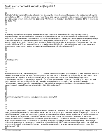 privatebanking.pl Jakie nieruchomości kupują najbogatsi ? 06.04.2015. Sotheby's International Realty, globalny nr 1 na rynku nieruchomości luksusowych, podsumował wyniki sprzedaży za 2014 - rok ten okazał się rekordowy pod kątem wzrostów. Na samym rynku amerykańskim sieć osiągnęła wynik sprzedaży na poziomie 70 miliardów dolarów, co stanowi wzrost o 11% w stosunku do 2013 r. Publikacji wyników towarzyszy analiza dotycząca tegojakie nieruchomości najchętniej kupują najzamożniejsi ludzie na świecie. Badania przeprowadzone na zlecenie Sotheby's International Realty wskazują, że upodobania milionerów z różnych zakątków globu są spójne: od lat prym wiodą rezydencje położone nad wodą, zabytkowe posiadłości o charakterze historycznym i lokalizacje w modnych wakacyjnych kurortach. "Ultrabogaci" z całego świata lokują w nieruchomościach majątek wart łącznie prawie 3 biliony USD,co stanowi liczbę przewyższającą PKB Indii... Niemal 80% z nich poza głównym domem ma co najmniej jedną, a zwykle więcej luksusowych nieruchomości. "Ultrabogaci" Według danych SIR, na świecie jest 211 275 osób określanych jako "ultrabogate" (Ultra High Net Worth UHNW) - uznaje się za nie ludzi posiadających aktywa netto o wartości przynajmniej 30 mln USD. Dwa najważniejsze regiony, w których zamieszkuje odpowiednio 35% i 29% światowej grupy osób posiadającej majątki o najwyższej wartości, to Północna Ameryka i Europa. Tak jak przez setki lat, tak i dziś, jeden z istotnych składników ich majątku stanowią nieruchomości. Jak rozumieć pojęcie "luksusowych nieruchomości mieszkalnych"? W globalnym raporcie Sothenys International Realty to takie, których wartość wynosi więcej niż 1.000.000 dolarów. Czym kierują się milionerzy, kupując wymarzone domy? "Luxury Lifestyle Report", analiza opublikowana przez SIR, dowodzi, że choć kupujący na całym świecie mają podobne upodobania, można też dopatrzeć się specyficznych trendów na poszczególnych rynkach. I tak na przykład, gdyby życzenia najbogatszych Amerykanów mogły zostać wyrażone w jednym idealnym domu, byłaby to luksusowa posiadłość na wybrzeżu, nad rzeką, jeziorem lub morzem, z garażem mogącym pomieścić kolekcję samochodów, zaprojektowana i urządzona według ich własnego projektu. Z kolei bogaci Brytyjczycy przykładają szczególną wagę do historycznej wartości rezydencji, poszukując obiektów pałacowych, dworów czy prestiżowych posiadłości. Chińczykom szczególnie zależy na właściwej prezentacji swoich zbiorów dzieł sztuki i szukając rezydencji, zwracają uwagę na elementy takie jak galeria, sejfy. http://www.privatebanking.pl Kreator PDF Utworzono 4 March, 2017, 09:22 privatebanking.pl Trzeba wyróżnić dwa typy luksusowych nieruchomości - pierwszym będzie tzw. główny dom, a więc podstawowy adres, związany z "bazą" rodziny i miejscem pracy. Drugie (i kolejne) domy to z kolei nieruchomości kupowane głównie z myślą o czasie wolnym - letnich czy zimowych wakacjach, pasjach albo ojczyźnie, do której chce się wracać. W porównaniu z sytuacją sprzed pięciu lat większość zamożnych klientów z USA, Wielkiej Brytanii, Brazylii i Chin jest bardziej skłonna kupić jako główne lokum prestiżową podmiejską rezydencję niż obiekt w centrum miasta. Jeśli chodzi o następną inwestycję tego rodzaju, tzw. "drugi dom", najpopularniejszą opcją okazał się dom nad wodą - najwięcej (42 procent) klientów w segmencie luksusowym zainteresowanych było rezydencjami położonymi nad brzegiem rzeki, jeziora lub morza. Większość zamożnych klientów skłaniało się ku zakupowi rezydencji w celu przeznaczania jej na rodzinną siedzibę, to jest z zamiarem zapisania jej dzieciom. W przypadku niemal połowy agencji należących do sieciSIR, klienci kupujący rezydencje z myślą o swoich potomkach wydają od miliona do trzech milionów dolarów. Jednym z kluczowych aspektów branych pod uwagę przez nabywców nieruchomości jest - obok walorów użytkowych - zwrot z inwestycji. źródło: PRNews.pl http://www.privatebanking.pl Kreator PDF Utworzono 4 March, 2017, 09:22