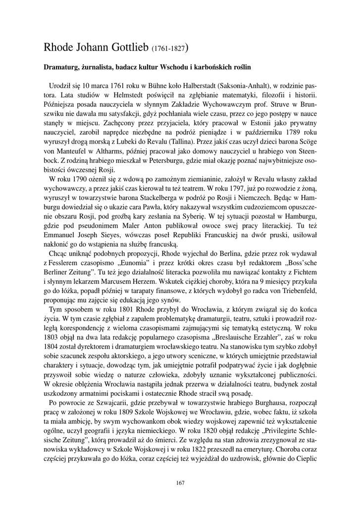 Rhode Johann Gottlieb (1761−1827) Dramaturg, żurnalista, badacz kultur Wschodu i karbońskich roślin Urodził się 10 marca 1761 roku w Bühne koło Halberstadt (Saksonia−Anhalt), w rodzinie pas− tora. Lata studiów w Helmstedt poświęcił na zgłębianie matematyki, filozofii i historii. Późniejsza posada nauczyciela w słynnym Zakładzie Wychowawczym prof. Struve w Brun− szwiku nie dawała mu satysfakcji, gdyż pochłaniała wiele czasu, przez co jego postępy w nauce stanęły w miejscu. Zachęcony przez przyjaciela, który pracował w Estonii jako prywatny nauczyciel, zarobił naprędce niezbędne na podróż pieniądze i w październiku 1789 roku wyruszył drogą morską z Lubeki do Revalu (Tallina). Przez jakiś czas uczył dzieci barona Scöge von Manteufel w Altharms, później pracował jako domowy nauczyciel u hrabiego von Steen− bock. Z rodziną hrabiego mieszkał w Petersburgu, gdzie miał okazję poznać najwybitniejsze oso− bistości ówczesnej Rosji. W roku 1790 ożenił się z wdową po zamożnym ziemianinie, założył w Revalu własny zakład wychowawczy, a przez jakiś czas kierował tu też teatrem. W roku 1797, już po rozwodzie z żoną, wyruszył w towarzystwie barona Stackelberga w podróż po Rosji i Niemczech. Będąc w Ham− burgu dowiedział się o ukazie cara Pawła, który nakazywał wszystkim cudzoziemcom opuszcze− nie obszaru Rosji, pod groźbą kary zesłania na Syberię. W tej sytuacji pozostał w Hamburgu, gdzie pod pseudonimem Maler Anton publikował owoce swej pracy literackiej. Tu też Emmanuel Joseph Sieyes, wówczas poseł Republiki Francuskiej na dwór pruski, usiłował nakłonić go do wstąpienia na służbę francuską. Chcąc uniknąć podobnych propozycji, Rhode wyjechał do Berlina, gdzie przez rok wydawał z Fesslerem czasopismo „Eunomia” i przez krótki okres czasu był redaktorem „Boss’sche Berliner Zeitung”. Tu też jego działalność literacka pozwoliła mu nawiązać kontakty z Fichtem i słynnym lekarzem Marcusem Herzem. Wskutek ciężkiej choroby, która na 9 miesięcy przykuła go do łóżka, popadł później w tarapaty finansowe, z których wydobył go radca von Triebenfeld, proponując mu zajęcie się edukacją jego synów. Tym sposobem w roku 1801 Rhode przybył do Wrocławia, z którym związał się do końca życia. W tym czasie zgłębiał z zapałem problematykę dramaturgii, teatru, sztuki i prowadził roz− ległą korespondencję z wieloma czasopismami zajmującymi się tematyką estetyczną. W roku 1803 objął na dwa lata redakcję popularnego czasopisma „Breslauische Erzahler”, zaś w roku 1804 został dyrektorem i dramaturgiem wrocławskiego teatru. Na stanowisku tym szybko zdobył sobie szacunek zespołu aktorskiego, a jego utwory sceniczne, w których umiejętnie przedstawiał charaktery i sytuacje, dowodząc tym, jak umiejętnie potrafił podpatrywać życie i jak dogłębnie przyswoił sobie wiedzę o naturze człowieka, zdobyły uznanie wykształconej publiczności. W okresie oblężenia Wrocławia nastąpiła jednak przerwa w działalności teatru, budynek został uszkodzony armatnimi pociskami i ostatecznie Rhode stracił swą posadę. Po powrocie ze Szwajcarii, gdzie przebywał w towarzystwie hrabiego Burghausa, rozpoczął pracę w założonej w roku 1809 Szkole Wojskowej we Wrocławiu, gdzie, wobec faktu, iż szkoła ta miała ambicję, by swym wychowankom obok wiedzy wojskowej zapewnić też wykształcenie ogólne, uczył geografii i języka niemieckiego. W roku 1820 objął redakcję „Privilegirte Schle− sische Zeitung”, którą prowadził aż do śmierci. Ze względu na stan zdrowia zrezygnował ze sta− nowiska wykładowcy w Szkole Wojskowej i w roku 1822 przeszedł na emeryturę. Choroba coraz częściej przykuwała go do łóżka, coraz częściej też wyjeżdżał do uzdrowisk, głównie do Cieplic 167 i Szczawna. Nie pozwalał jednak, by obowiązki zawodowe i stan zdrowia zepchnęły na margi− nes jego zainteresowania naukowe, z którymi wiązało się też m.in. jego członkostwo w Kró− lewskiej Naukowej Komisji Egzaminacyjnej i w Śląskim Towarzystwie Kultury Ojczystej. Swoją sławę ugruntował pracami o dawnych kulturach i religiach, zwłaszcza Persji i Indii. Orientaliści, wobec faktu, że nie znał języków orientalnych, a w pracach swoich wysuwał wiele niedostatecznie uzasadnionych hipotez, zalecali daleko idącą ostrożność przy korzystaniu z jego prac, zgodnie jednak uznawali je za dzieła godne uwagi. W dziedzinie historii sztuki Rhode zdobył sobie uznanie przypominając dawnych, nieznanych i zapomnianych malarzy niemieckich i holenderskich, których dzieła w jego czasach nie były prawie w ogóle reprodukowane. Jako przyrodnik wszedł Rhode do historii nauki dzięki swej pracy o szczątkach karbońskich roślin, które zachowały się w piaskowcach i łupkach towarzyszących pokładom węgla w śląskich kopalniach, a którymi prawie nikt nie zajmował się od czasów Georga Antona Volkmanna. W swej pracy Rhode spróbował usystematyzować karbońskie rośliny i słusznie uznał węgiel za substancję powstałą z owych roślin, jednak, wobec braku botanicznego przygotowania, niepotrzebnie starał się identyfikować kopalne rośliny ze współczesnymi, w którym to dążeniu nawet różne utwory krystaliczne skłonny był uważać za skamieniałe kwiaty. W uznaniu jego zasług dla nauki Fakultet Filozoficzny Uniwersytetu w Jenie nadał mu godność doktora honoris causa. Zmarł 23 sierpnia 1827 roku we Wrocławiu. Jego nazwisko upamiętnione zostało w rodzajowej nazwie karbońskiej paproci Rhodea, oraz w nazwie gatunkowej karbońskiego widłaka – Lepidodendron rhodeanum Sternberg. Ważniejsze prace: 1800 – Theorie der Verbreitung des Schalles für Baukünstler. Berlin. 1809 – Artistische Blumenlese, oder Beiträge zur Geschichte der Kunst vorzüglich in Deutsch− land, aus dem funfzehnten und sechszehnten Jahrhundert. B