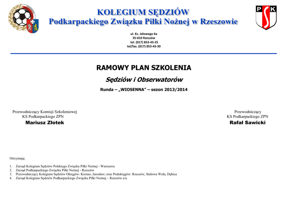 ul. Ks. Jałowego 6a 35-010 Rzeszów tel. (017) 853-43-25 tel/fax. (017) 853-43-30 RAMOWY PLAN SZKOLENIA Sędziów i Obserwatorów Runda – „WIOSENNA” – sezon 2013/2014 Przewodniczący Komisji Szkoleniowej KS Podkarpackiego ZPN Przewodniczący KS Podkarpackiego ZPN Mariusz Złotek Rafał Sawicki Otrzymują: 1. 2. 3. 4. Zarząd Kolegium Sędziów Polskiego Związku Piłki Nożnej - Warszawa Zarząd Podkarpackiego Związku Piłki Nożnej - Rzeszów Przewodniczący Kolegium Sędziów Okręgów: Krosno, Jarosław; oraz Podokręgów: Rzeszów, Stalowa Wola, Dębica Zarząd Kolegium Sędziów Podkarpackiego Związku Piłki Nożnej – Rzeszów a/a Tematy Ramowego Planu Szkolenia Sędziów i Obserwatorów– runda wiosenna sezonu 2013/2014 Termin spotkań częstotliwość Tematyka Rodzaj zajęć Trening Styczeń kondycyjny, minimum 2, 3 razy w tygodniu ćwiczenia praktyczne • Indywidualne przygotowanie sprawnościowo – kondycyjne do rundy wiosennej sezonu 2013/2014. • Prowadzenie zawodów tj.: sparingi, turnieje w ramach ćwiczeń praktycznych. Szkolenie teoretycznoaudiowizualne Luty minimum 2 szkolenia w miesiącu w Okręgach i Podokręgach - TEMAT GŁÓWNY SZKOLENIA: • Przypomnienie ostatnich zmian w Przepisach Gry. • Przypomnienie istotnych zapisów w Regulaminie Okręgi: Krosno, Jarosław Podokręgi: Rzeszów, Stalowa Wola, Dębica Teren działalności KS Podkarpackiego ZPN Okręgi: Krosno, Jarosław Indywidualnie sędziowie wszystkich klas rozgrywkowych Przewodniczący Komisji Szkoleniowych Okręgów i Podokręgów Podokręgi: Rzeszów, Stalowa Wola, Dębica -Analiza pytań testowych z najnowszego numeru „Sędzia nr 4” Szkolenie teoretyczno- - TEMAT GŁÓWNY SZKOLENIA: • Poruszanie i ustawianie sędziego na polu gry. Szkolenie winno być prowadzone w oparciu o materiał UEFA RAP 2013/1 Szkolenie teoretyczno- minimum 2 szkolenia w miesiącu w Okręgach i Podokręgach Teren działalności KS Podkarpackiego ZPN Odpowiedzialni za realizację Rozgrywek. audiowizualne Marzec Miejsce spotkania - TEMAT GŁÓWNY SZKOLENIA: • audiowizualne Pozbawienie realnej szansy na zdobycie bramki oraz przerwanie korzystnej akcji. Szkolenie winno być prowadzone w oparciu o materiał UEFA RAP 2013/1 - TEMAT GŁÓWNY SZKOLENIA: Szkolenie teoretycznoaudiowizualne • Według zapotrzebowania danego Okręgu lub Podokręgu. -Analiza pytań testowych z najnowszego numeru „Sędzia nr 1” Teren działalności KS Podkarpackiego ZPN Okręgi: Krosno, Jarosław Przewodniczący Komisji Szkoleniowych Okręgów i Podokręgów Podokręgi: Rzeszów, Stalowa Wola, Dębica Teren działalności KS Podkarpackiego ZPN Okręgi: Krosno, Jarosław Przewodniczący Komisji Szkoleniowych Okręgów i Podokręgów Podokręgi: Rzeszów, Stalowa Wola, Dębica Teren działalności KS Podkarpackiego ZPN Okręgi: Krosno, Jarosław Podokręgi: Rzeszów, Stalowa Wola, Dębica Przewodniczący Komisji Szkoleniowych Okręgów i Podokręgów Uwagi Egzaminy - EGZAMINY KONKURSOWE Zarząd KS Dokładne miejsca Podkarpackiego ZPN, oraz terminy Kwiecień • Egzamin kondycyjny Komisja Szkoleniowa egzaminów dla Egzaminy + minimum 1 szkolenie w miesiącu w Okręgach i Podokręgach • Egzamin teoretyczny (dotyczy IV ligi); poszczególnych lig Zarządy KS Okręgów i (klas) zostaną Podokręgów, podane w Komisje Szkoleniowe późniejszym terminie Szkolenie teoretyczno- - TEMAT GŁÓWNY SZKOLENIA: • audiowizualne Ręka-kryteria oceny kontaktu piłki z ręką. Szkolenie winno być prowadzone w oparciu o materiał UEFA RAP 2013/1 Szkolenie teoretyczno- Maj minimum 2 szkolenia w miesiącu w Okręgach i Podokręgach audiowizualne - TEMAT GŁÓWNY SZKOLENIA: • Według zapotrzebowania danego Okręgu lub Podokręgu. Szkolenie teoretyczno- - TEMAT GŁÓWNY SZKOLENIA: • audiowizualne Korzyść-najnowsze wytyczne w tym zakresie. Szkolenie winno być prowadzone w oparciu o materiał UEFA RAP 2013/1 Czerwiec Szkolenie minimum 1 szkolenie w miesiącu w Okręgach i Podokręgach teoretycznoaudiowizualne - TEMAT GŁÓWNY SZKOLENIA: • Według zapotrzebowania danego Okręgu lub Podokręgu. Teren działalności KS Podkarpackiego ZPN Okręgi: Krosno, Jarosław Podokręgi: Rzeszów, Stalowa Wola, Dębica Teren działalności KS Podkarpackiego ZPN Okręgi: Krosno, Jarosław Przewodniczący Komisji Szkoleniowych Okręgów i Podokręgów Przewodniczący Komisji Szkoleniowych Okręgów i Podokręgów Podokręgi: Rzeszów, Stalowa Wola, Dębica Teren działalności KS Podkarpackiego ZPN Okręgi: Krosno, Jarosław Przewodniczący Komisji Szkoleniowych Okręgów i Podokręgów Podokręgi: Rzeszów, Stalowa Wola, Dębica Teren działalności KS Podkarpackiego ZPN Okręgi: Krosno, Jarosław Przewodniczący Komisji Szkoleniowych Okręgów i Podokręgów Podokręgi: Rzeszów, Stalowa Wola, Dębica -Analiza pytań testowych z najnowszego numeru „Sędzia nr 2” UWAGA: 1. Szczegółowe plany pracy Okręgów i Podokręgów są integralną częścią niniejszego planu. 2. Częstotliwość zebrań szkoleniowych może być większa, lecz obowiązkowo – z pełnym stanem szkolących się sędziów – taka jak w planie szkolenia. Przewodniczący Komisji Szkoleniowej KS Podkarpackiego ZPN Mariusz Złotek Przewodniczący KS Podkarpackiego ZPN Rafał Sawicki