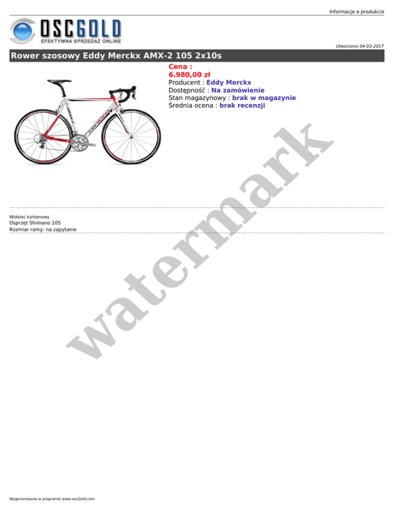 Informacje o produkcie Utworzono 04-03-2017 Rower szosowy Eddy Merckx AMX-2 105 2x10s Cena : 6.980,00 zł Widelec karbonowy w at Osprzęt Shimano 105 Rozmiar ramy: na zapytanie er m ar k Producent : Eddy Merckx Dostępność : Na zamówienie Stan magazynowy : brak w magazynie Średnia ocena : brak recenzji Wygenerowano w programie www.oscGold.com