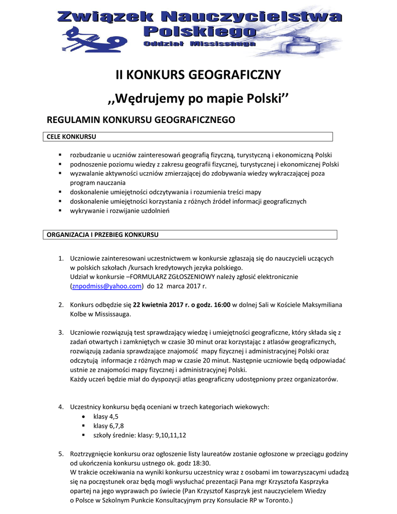 II KONKURS GEOGRAFICZNY ,,Wędrujemy po mapie Polski’’ REGULAMIN KONKURSU GEOGRAFICZNEGO CELE KONKURSU rozbudzanie u uczniów zainteresowań geografią fizyczną, turystyczną i ekonomiczną Polski podnoszenie poziomu wiedzy z zakresu geografii fizycznej, turystycznej i ekonomicznej Polski wyzwalanie aktywności uczniów zmierzającej do zdobywania wiedzy wykraczającej poza program nauczania doskonalenie umiejętności odczytywania i rozumienia treści mapy doskonalenie umiejętności korzystania z różnych źródeł informacji geograficznych wykrywanie i rozwijanie uzdolnień ORGANIZACJA I PRZEBIEG KONKURSU 1. Uczniowie zainteresowani uczestnictwem w konkursie zgłaszają się do nauczycieli uczących w polskich szkołach /kursach kredytowych jezyka polskiego. Udział w konkursie –FORMULARZ ZGŁOSZENIOWY należy zgłosić elektronicznie ([email protected]) do 12 marca 2017 r. 2. Konkurs odbędzie się 22 kwietnia 2017 r. o godz. 16:00 w dolnej Sali w Kościele Maksymiliana Kolbe w Mississauga. 3. Uczniowie rozwiązują test sprawdzający wiedzę i umiejętności geograficzne, który składa się z zadań otwartych i zamkniętych w czasie 30 minut oraz korzystając z atlasów geograficznych, rozwiązują zadania sprawdzające znajomość mapy fizycznej i administracyjnej Polski oraz odczytują informacje z różnych map w czasie 20 minut. Następnie uczniowie będą odpowiadać ustnie ze znajomości mapy fizycznej i administracyjnej Polski. Każdy uczeń będzie miał do dyspozycji atlas geograficzny udostępniony przez organizatorów. 4. Uczestnicy konkursu będą oceniani w trzech kategoriach wiekowych: klasy 4,5 klasy 6,7,8 szkoły średnie: klasy: 9,10,11,12 5. Roztrzygnięcie konkursu oraz ogłoszenie listy laureatów zostanie ogłoszone w przeciągu godziny od ukończenia konkursu ustnego ok. godz 18:30. W trakcie oczekiwania na wyniki konkursu uczestnicy wraz z osobami im towarzyszacymi udadzą się na poczęstunek oraz będą mogli wysłuchać prezentacji Pana mgr Krzysztofa Kasprzyka opartej na jego wyprawach po świecie (Pan Krzysztof Kasprzyk jest nauczycielem Wiedzy o Polsce w Szkolnym Punkcie Konsultacyjnym przy Konsulacie RP w Toronto.) 6. Prace uczniów będą oceniane przez powołaną do tego celu Komisję Konkursową. 7. Laureaci trzech pierwszych miejsc otrzymają pamiątkowe dyplomy i zostaną nagrodzeni atrakcyjnymi nagrodami. ZAKRES TEMATYCZNY KONKURSU I. Szkoła Podstawowa-klasy 4,5 - Wiadomości i umiejętności: 1. Geografia fizyczna Polski rozpoznawanie na mapie hipsometrycznej nizin, wyżyn i gór charakterystyka wybranych krajobrazów Polski: gór wysokich, wyżyny wapiennej, nizinny, pojezierny, nadmorski formy ochrony przyrody stosowane w Polsce, wskazywanie na mapie parków narodowych; najważniejsze walory turystyczne miast Polski, lokalizacja na mapie Europy: Polski oraz państw sąsiadujących z Polską i ich stolic, znajomość mapy fizycznej i administracyjnej Polski: odczytywanie z map informacji, lokalizowanie obiektów na mapie konturowej Polski (krainy geograficzne, rzeki, jeziora, kompleksy leśne, parki narodowe) 2. Ojczyzna. najważniejsze święta narodowe, symbole państwowe i miejsca ważne dla pamięci narodowej; lokalizacja na mapie i opisywanie głównych regionów Polski; miejsca największych skupisk Polaków na świecie 3. Wspólnota europejska. uczestnictwo Polski we wspólnocie europejskiej oraz rozpoznawanie symboli unijnych: flaga i hymn Unii Europejskiej (Oda do radości). II. Klasy 6-8 oraz 9-12 - Wiadomości i umiejętności 1. Znajomość mapy fizycznej i administracyjnej Polski Mapa - umiejętność czytania, interpretacji i posługiwania się mapą (odczytywanie z map informacji, lokalizacja obiektów na mapie konturowej) 2. Zagadnienia geografii fizycznej Polski: położenie, obszar, granice, sąsiedzi, struktury geologiczne Polski, ukształtowanie powierzchni, klimat Polski, wody powierzchniowe i podziemne, Morze Bałtyckie, zróżnicowanie glebowe i roślinne ochrona przyrody w Polsce 3. Zagadnienia geografii społeczno-ekonomicznej Polski: Demografia i osadnictwo: rozmieszczenie ludności, zróżnicowanie narodowościowe i religijne w Polsce, współczesne procesy urbanizacyjne Gospodarka: warunki rozwoju rolnictwa i główne obszary uprawy i hodowli w Polsce, energetyka i przemysł-główne okręgi przemysłowe, turystyka-najważniejsze zabytki i walory turystyczne 4. Przynależność Polski do organizacji międzynarodowych 5. Znajomość obiektów w Polsce wpisanych na Listę Światowego Dziedzictwa Kulturowego i Przyrodniczego