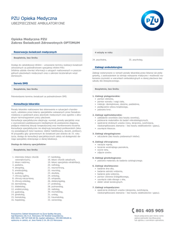 PZU Opieka Medyczna UBEZPIECZENIE AMBULATORYJNE Opieka Medyczna PZU Zakres Świadczeń Zdrowotnych OPTIMUM Rezerwacja świadczeń medycznych Bezpłatnie, bez limitu 34. psychiatra, Dostęp do całodobowej infolinii – umawianie terminu realizacji świadczeń zdrowotnych za pośrednictwem specjalnej infolinii PZU. Infolinia udziela również informacji o usługach realizowanych w poszczególnych placówkach medycznych oraz o zakresie terytorialnym wizyt domowych. Serwis SMS 35. psycholog. Zabiegi ambulatoryjne Zabiegi wykonywane w ramach porady lekarskiej przez lekarza lub pielęgniarkę, z zastrzeżeniem że istnieje wskazanie medyczne i możliwość wykonania czynności w warunkach ambulatoryjnych w danej placówce bez szkody dla Ubezpieczonego. Bezpłatnie, bez limitu Bezpłatnie, bez limitu Potwierdzenie terminu świadczeń za pośrednictwem SMS. Konsultacje lekarskie Porady lekarskie realizowane bez skierowania w sytuacjach chorobowych, udzielane przez lekarzy specjalistów wskazanych przez Świadczeniodawcę w godzinach pracy placówek medycznych oraz zgodnie z aktualnym harmonogramem pracy placówek. Konsultacje specjalistyczne obejmują: wywiad, poradę specjalisty wraz z czynnościami podstawowymi niezbędnymi do postawienia diagnozy, podjęcia właściwej decyzji terapeutycznej oraz monitorowania leczenia. Konsultacje specjalistyczne nie obejmują konsultacji profesorskich (lekarzy posiadających tytuł naukowy: doktor habilitowany, docent, profesor). W przypadku gdy uprawnionym do świadczeń jest dziecko do 15. roku życia, dostęp do konsultacji specjalistycznych zależy od dostępności danego specjalisty dziecięcego w danej lokalizacji. 1. Zabiegi pielęgniarskie: • pomiar ciśnienia, • pomiar wzrostu i wagi ciała, • iniekcje: domięśniowe, dożylne, podskórne, • podłączenie wlewu kroplowego, • pobranie krwi. 2. Zabiegi ogólnolekarskie: • zakładanie cewników (bez kosztu cewnika), • pobieranie materiałów do badań mikrobiologicznych, • opatrzenie drobnych urazów (rany, skręcenia, zwichnięcia, nieskomplikowane złamania – bez kosztu stabilizatorów i gipsu), • usunięcie kleszcza. 3. Zabiegi alergologiczne: • odczulanie (bez kosztu podawanych leków). 4. Zabiegi chirurgiczne: • nacięcie ropnia, • leczenie wrośniętego paznokcia, • szycie rany, • zdjęcie szwów. Dostęp do lekarzy specjalistów: Bezpłatnie, bez limitu 1. internista (lekarz chorób wewnętrznych), 2. lekarz rodzinny, 3. pediatra, 4. alergolog, 5. anestezjolog, 6. audiolog, 7. chirurg ogólny, 8. chirurg naczyniowy, 9. chirurg onkolog, 10. dermatolog, 11. diabetolog, 12. endokrynolog, 13. gastrolog, 14. ginekolog, 15. hematolog, 16. hepatolog, 4 wizyty w roku 17. kardiolog, 18. lekarz chorób zakaźnych, 19. lekarz specjalista rehabilitacji, 20. nefrolog, 21. neurochirurg, 22. neurolog, 23. okulista, 24. onkolog, 25. ortopeda, 26. otolaryngolog, 27. proktolog, 28. pulmonolog, 29. radiolog, 30. reumatolog, 31. urolog, 32. traumatolog, 33. wenerolog. Powszechny Zakład Ubezpieczeń na Życie Spółka Akcyjna, Sąd Rejonowy dla m.st. Warszawy XII Wydział Gospodarczy, KRS 30211, NIP 527-020-60-56, kapitał zakładowy: 295 000 000,00 zł, wpłacony w całości, al. Jana Pawła II 24, 00-133 Warszawa 5. Zabiegi ginekologiczne: • pobranie materiału do badania cytologicznego. 6. Zabiegi okulistyczne: • badanie dna oka, • badanie ostrości widzenia, • badanie pola widzenia, • pomiar ciśnienia śródgałkowego, • usunięcie ciała obcego z oka, • dobór szkieł korekcyjnych. 7. Zabiegi ortopedyczne: • opatrzenie drobnych urazów (skręcenia, zwichnięcia, nieskomplikowane złamania – bez kosztu stabilizatorów i gipsu). 801 405 905 Koszt połączenia jest równy cenie jednej jednostki taryfikacyjnej lub zgodny z cennikiem operatora. 8. Zabiegi otolaryngologiczne: • płukanie uszu, • przedmuchiwanie trąbki słuchowej, • usunięcie ciała obcego z ucha/nosa/gardła, • postępowanie zachowawcze w krwawieniu z nosa, • opatrunek uszny z lekiem. 9. Zabiegi urologiczne: • zakładanie cewników (bez kosztu cewnika). Diagnostyka laboratoryjna Diagnostyka realizowana zgodnie ze wskazaniami medycznymi na podstawie skierowania od lekarza Świadczeniodawcy w placówkach wskazanych przez Świadczeniodawcę za pośrednictwem infolinii medycznej. 1. Badania hematologiczne i układu krzepnięcia: Bezpłatnie, bez limitu • • • • • • • • • • • • • • • • • kwas foliowy, lipidogram, mocznik, potas (K), proteinogram, seromukoid, sód (Na), test obciążenia glukozą, triglicerydy, wapń całkowity (Ca), witamina B12, żelazo – całkowita zdolność wiązania (TIBC), żelazo (Fe), antygen swoisty dla stercza – PSA całkowite, ferrytyna, transferryna, BUN – azot mocznikowy, hemoglobina glikowana (HbA1C). 3. Badania serologiczne i immunologiczne: Bezpłatnie, bez limitu • czas częściowej tromboplastyny po aktywacji/ czas kaolinowo-kefalinowy (APTT), • czas protrombinowy (PT), • fibrynogen (FIBR), • morfologia krwi z pełnym różnicowaniem granulocytów, • morfologia krwi bez rozmazu, • hematokryt, • odczyn opadania krwinek czerwonych (OB), • leukocyty, • płytki krwi, • retikulocyty. 2. Badania biochemiczne: Bezpłatnie, bez limitu • • • • • • • • • • • • • • • • • • • • • • • • • • • • • • • • albuminy, ALA kwas aminolewulinowy, aminotransferaza alaninowa (ALT), aminotransferaza asparaginianowa (AST), amylaza, apolipoproteina A1, białko całkowite, białko C-reaktywne (CRP), bilirubina bezpośrednia, bilirubina pośrednia, bilirubina całkowita, ceruloplazmina, chlorki (Cl), cholesterol całkowity, cholesterol HDL, cholesterol LDL, czynnik reumatoidalny (RF), dehydrogenaza mleczanowa (LDH), esteraza acetylocholinowa, fosfataza alkaliczna (AP), fosfataza kwaśna całkowita, fosfataza sterczowa, fosforany, fosfor, lipaza, magnez całkowity 