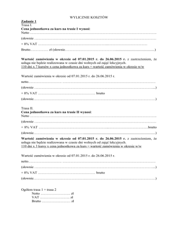 WYLICZNIE KOSZTÓW Zadanie 1 Trasa I. Cena jednostkowa za kurs na trasie I wynosi: Netto ……………………………………………………………………………………………. (słownie ………………………………………………………………………………………… + 8% VAT …………………………………………………..…………………………… Brutto…………… zł (słownie……………………………………............................................) Wartość zamówienia w okresie od 07.01.2015 r. do 26.06.2015 r. z zastrzeżeniem, że usługa nie będzie realizowana w czasie dni wolnych od zajęć lekcyjnych. 110 dni x 7 kursów x cena jednostkowa za kurs = wartość zamówienia w okresie w/w Wartość zamówienia w okresie od 07.01.2015 r. do 26.06.2015 r. netto………………………. …………………………………………………………………… (słownie ………………………………………………………………………………………...) + 8% VAT ………………………………………… brutto (słownie…………………………………………………………………………………………) Trasa II. Cena jednostkowa za kurs na trasie II wynosi: Netto ……………………………………………………………………………………………. (słownie ………………………………………………………………………………………… + 8% VAT …………………………………………………..……………………………brutto (słownie……………………………………................................................................................) Wartość zamówienia w okresie od 07.01.2015 r. do 26.06.2015 r. z zastrzeżeniem, że usługa nie będzie realizowana w czasie dni wolnych od zajęć lekcyjnych. 110 dni x 3 kursy x cena jednostkowa za kurs = wartość zamówienia w okresie w/w Wartość zamówienia w okresie od 07.01.2015 r. do 26.06.2015 r. netto………………………. …………………………………………………………………… (słownie ………………………………………………………………………………………...) + 8% VAT ………………………………………… brutto (słownie…………………………………………………………………………………………) Ogółem trasa 1 + trasa 2 Netto ……………………. zł VAT ……………………. zł Brutto …………………… zł WYLICZNIE KOSZTÓW Zadanie 2 Wyliczenie kosztów dotyczące przetargu nieograniczonego na dowóz uczniów ze Szkoły Podstawowej w Chotomowie na basen w GCKiS w Jabłonnie Usługa będzie wykonywana w okresie od 07.01.2015 r. do 26.06.2015 r. tj.: - 22 tygodnie - w tygodniu 25 kursy - koszt jednego kursu ........................... zł netto 22 tygodnie x 25 kursy x ......................... zł/kurs = ..........................zł. podatek VAT ......... % = .......................... zł RAZEM ............................zł