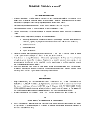REGULAMIN AKCJI „Koło promocji” §1 POSTANOWIENIA OGÓLNE 1. Niniejszy Regulamin określa warunki, na jakich przeprowadzana jest Akcja Promocyjna, której celem jest zachęcenie klientów Galerii Brama Mazur („Galeria”) do dokonywania zakupów, odbywająca się na podstawie niniejszego Regulaminu (zwana dalej „Akcją”). 2. Akcja będzie prowadzona na terenie Galerii Brama Mazur w Ełku, plac Miejski 1. 3. Akcja odbywa się w dniu 15 kwietnia 2016r., w godzinach 18:00-23:00. 4. Zakupy powinny być dokonane w jednym ze sklepów na terenie Galerii w dniach 9-15 kwietnia 2016r. 5. Z udziału w Akcji wyłączone są paragony, na których widnieją: a) transakcje dokonane w zakładach totalizatora sportowego, zakładach bukmacherskich, kantorach, wpłaty i wypłaty bankomatu/wpłatomatu oraz doładowania telefonów; b) produkty lecznicze; c) wyroby tytoniowe; d) napoje alkoholowe. 6. Akcja nie stanowi loterii promocyjnej w rozumieniu art. 2 ust. 1 pkt. 10 ustawy z dnia 19 marca 2009r o grach hazardowych (Dz.U. z 2009r., Nr 201, poz. 1540 z późn.zm.). 7. Uczestnictwo w Akcji jest bezpłatne i dobrowolne, a przystąpienie do Akcji jest równoznaczne z akceptacją przez Uczestnika niniejszego Regulaminu w całości. Uczestnik zobowiązuje się do przestrzegania określonych w nim zasad jak również potwierdza, że spełnia wszystkie warunki uprawniającego go do udziału w Akcji. 8. Uczestnik zgłaszając swój udział w Akcji wyraża zgodę na przetwarzanie przez Organizatora i Fundatora nagród jego danych osobowych zawartych w potwierdzeniu odbioru nagrody celem realizacji Akcji i wydania nagród. Podanie danych jest dobrowolne. §2 PODMIOTY AKCJI 1. Organizatorem akcji jest Star Center Iwona Górna Tomaszowice 81B, 21-008 Tomaszowice NIP 922-217-23-44, REGON 951088553, („Organizator”). Organizator działa na zlecenie spółki GV Ełk Sp. z o.o. z siedzibą w Warszawie (00-498) przy ul. Książęcej 19/3, NIP 5252492212, REGON 14265660900000, zarejestrowaną w Sądzie Rejonowym dla m.st. Warszawy w Warszawie, XII Wydział Gospodarczy Krajowego Rejestru Sądowego pod numerem KRS 0000369301. 2. Fundatorem Nagród jest spółka GV Ełk Sp. z o.o. z siedzibą w Warszawie, NIP 5252492212. §3 DEFINICJE POJĘĆ STOSOWANYCH W REGULAMINIE 1. Zakup Promocyjny – transakcja zakupu towarów/usług (z zastrzeżeniem postanowień par. 1 pkt. 4 Regulaminu) za łączną kwotę od 100 zł brutto na jednym dokumencie płatniczym dokonana w Galerii w czasie trwania Akcji. 2. Uczestnik Promocji - Pełnoletnia osoba fizyczna posiadająca pełną zdolność do czynności prawnych. W Akcji nie mogą brać udziału pracownicy i/lub przedstawiciele Organizatora, podmioty mające podpisane umowy i świadczące usługi w siedzibie Organizatora oraz inne podmioty bezpośrednio zaangażowane w przeprowadzenie Akcji, pracownicy zarządcy lub właściciela Galerii, pracownicy najemców Galerii, jak również pracownicy ochrony i serwisu sprzątającego Galerii. Pracownikiem w rozumieniu Regulaminu jest zarówno osoba zatrudniona na podstawie umowy o pracę jak i osoba współpracująca na podstawie umowy cywilnoprawnej. 3. Punkt Obsługi Akcji - punkt wydawania nagród. 4. Koło promocji – koło z podziałem na sześć pól, na których są zaznaczone nagrody wg podziału opisanego w punkcie nr 5 niniejszego paragrafu. Wybór nagrody następuje według wskazania koła. 5. Nagroda – nagroda rzeczowa w postaci jednej z 88 nagród, którą Uczestnik może otrzymać, biorąc udział w Akcji. Nagrody w szczególności: a. Bilety do kina (24 sztuk) w cenie 15 zł brutto każdy b. Sprzęt Euro RTV AGD (10 sztuk) średnia wartość każdego sprzętu 150 zł brutto, w szczególności: Brytfanna ENED – 1 sztuka; wartość: 149,99 zł brutto Zestaw 5 noży w bloku – 2 sztuki; wartość jednej sztuki 146,34 zł brutto Suszarka do włosów REMINGTOB- 1 sztuka; wartość: 89,99 zł brutto Maszynka do włosów – 1 sztuka; wartość 119,99 zł brutto Blender ręczny – 1 sztuka; wartość 149,99 zł brutto Mikser z misą – 1 sztuka; wartość 149,99 zł brutto Czajnik Inox – 1 sztuka; wartość 169,99 zł brutto Czajnik szklany – 1 sztuka; wartość 129,99 zł brutto Komplet noży – 1 sztuka; wartość 129,99 zł brutto c. Vouchery na deser Wymarzone lody (10 sztuk) 10 zł brutto każdy d. Karty podarunkowe Empik (5 sztuk) 50 zł brutto każda e. Karty podarunkowe JYSK (5 sztuk) 50 zł brutto każda f. Torby ekologiczne z logo Bramy Mazur 34 sztuk – jako upominek promocyjny §4 ZASADY AKCJI 1. Za jeden dowód zakupu dokumentujący Zakup Promocyjny przyznawana jest jedna Nagroda. 2. Uczestnik, aby dokonać wyboru nagrody, kręci kołem promocji. Uczestnik otrzymuje Nagrodę wskazaną przez koło nagród. 3. Wielokrotność kwoty 100 zł brutto, na jednym dokumencie zakupu nie uprawnia Uczestnika Promocji do otrzymania kolejnej nagrody. 4. Nagrody będą wydawane przez Punkt Obsługi Akcji zlokalizowany na terenie Galerii. 5. Osoba obsługująca Punkt Obsługi Akcji opieczętuje dowód zakup, na jego odwrocie, na podstawie którego wyda Nagrodę. Opieczętowany dowód zakupu nie uprawnia do ponownego otrzymania Nagrody. Uczestnik jest zobowiązany zachować dowód zakupu w trakcie trwania Promocji. 6. Pula Nagród jest ograniczona. W przypadku wyczerpania się zapasów niektórych nagród, wówczas Uczestnik kręci kołem aż do skutku, aż koło wskaże nagrodę, której zapasy jeszcze są dostępne. W sytuacji wyczerpania się wszystkich nagród, Uczestnikowi nie przysługują żadne roszczenia w stosunku do Organizatora, jeśli pula Nagród zostanie wyczerpana. 7. Uczestnik może wziąć udział w Promocji wielokrotnie pod warunkiem każdorazowego spełnienia warunków określonych w niniejszym Regulaminie. 8. Po dokonaniu zakupu w terminie trwania Akcji Uczestnik powinien udać się do punktu obsługi akcji w czasie odbywania się Akcji określonego w paragrafie 1, punkt 3, gdzie wydawane są na