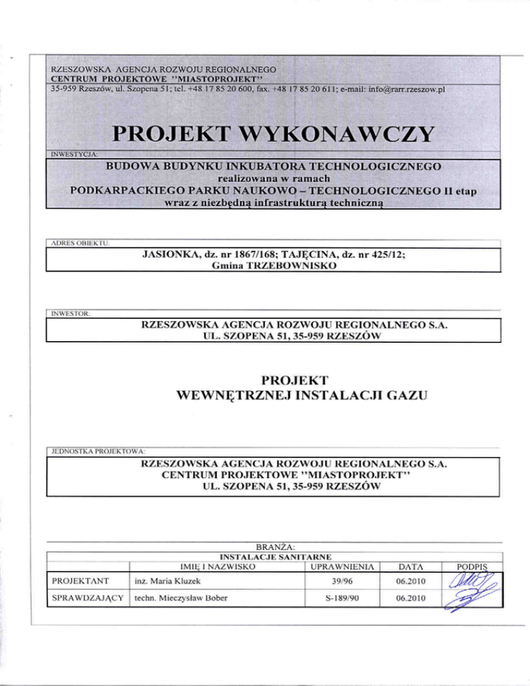 2 ZAWARTOĝû OPRACOWANIA: 1. OPIS TECHNICZNY 2. RYSUNKI: Rzut fragmentu parteru Aksonometria gazu skala 1:100 skala 1:100 rys. nr 1 rys. nr 2 3 OPIS TECHNICZNY 1. Przedmiot i zakres opracowania. Przedmiotem niniejszego opracowania jest projekt wykonawczy wewnĊtrznej instalacji gazowej dla „Inkubatora Technologicznego” zlokalizowanego na terenie PPN-T Jasionka S1. 2. Opis instalacji gazowej. Opracowanie obejmuje odcinek instalacji gazowej od stacji redukcyjnej umieszczonej na zewnĊtrznej Ğcianie budynku do palników kotłowych w kotłowni. Stacja redukcyjna jest tematem odrĊbnego opracowania. Instalacja bĊdzie dostarczaü gaz ziemny GZ 50 do 2 palników o znam. mocy 300 kW kaĪdy. Przepływ gazu w iloĞci 75 m3/h odbywał siĊ bĊdzie przewodem φ80 z rur stalowych bez szwu wg. PN - 80/H-74219 łączonych na spaw. Przewód gazowy do kotła prowadziü po Ğcianach oraz pod stropem parteru oraz kotłowni w normatywnych odległoĞciach od instalacji elektrycznej i od pozostałych projektowanych instalacji w budynku. Przewody gazowe prowadziü na powierzchni Ğcian wewnĊtrznych w odległoĞci 2 cm od tynku na uchwytach w odległoĞci co 1,5 m dla poziomów. Przewód gazowy przez Ğciany prowadziü w rurach ochronnych wg BN/82/8976-50, która powinna wystawaü po 3 cm z kaĪdej strony Ğciany. PrzestrzeĔ miĊdzy rurą ochronną a przewodem naleĪy wypełniü materiałem plastycznym. Przewody instalacji gazowej w stosunku do innych instalacji stanowiących wyposaĪenie budynku naleĪy zlokalizowaü w sposób zapewniający bezpieczeĔstwo uĪytkowania. OdległoĞü miĊdzy przewodami instalacji gazowej a innymi przewodami powinna umoĪliwiaü wykonanie prac konserwatorskich. Poziome odcinki instalacji gazowej powinny byü usytuowane w odległoĞci co najmniej 0,1m powyĪej innych przewodów instalacyjnych a przy skrzyĪowaniach odległoĞü miĊdzy przewodem gazowym a przewodami Innych instalacji winna wynosiü co najmniej 0,02m. Zawory naleĪy tak zamontowaü aby były widoczne i aby była łatwoĞü w ich montaĪu i demontaĪu, oraz sprawdzenia szczelnoĞci. WysokoĞü minimalna zamontowania zaworu powinna wynosiü 70 cm od podłogi. Palniki gazowe łączyü na sztywno za pomocą podejĞcia z rur i kształtek gwintowanych, stosując dwuzłączki dla łatwego rozłączenia przyboru. 3. Zabezpieczenie kotłowni przed koncentracją ulatniającego siĊ gazu. Dla zapewnienia moĪliwoĞci odciĊcia dopływu gazu do kotłowni projektuje siĊ montaĪ kurka z głowicą samozamykającą wchodzącego w zestaw ASBIG. Kurek z głowicą samozamykającą zlokalizowany bĊdzie na zewnątrz budynku razem ze stacją redukcyjną. Dobrano Aktywny System BezpieczeĔstwa Instalacji Gazowej typu GAZEX, który bĊdzie automatycznie zamykał dopływ gazu i energii elektrycznej do kotłowni przy przekroczeniu stĊĪenia gazu o 0.01 % dolnej granicy wybuchowoĞci. System składa siĊ - z głowicy samozamykającej (zawór dn 80); głowica nie wymaga zasilania w stanie normalnej pracy( czuwania), jest zamykana krótkim impulsem elektrycznym o niskim napiĊciu 12 V i znikomej energii. Instalacja elektryczna łącząca głowicĊ i moduł alarmowy jest wiĊc wolna od napiĊcia i prądu, mogącego spowodowaü iskrzenie lub wydzielanie siĊ duĪej iloĞci ciepła. - 3 detektorów gazu (czujki) - umieszczone w kotłowni nad kotłami oraz pod stropem w martwych miejscach kotłowni ( tam gdzie moĪliwa jest kumulacja gazu) -modułów alarmowych - pozwala na ustawienie bezpiecznej granicy stĊĪenia gazu pomieszczeniu, moduł zasila i steruje pracą detektorów gazu oraz generuje impulsy zamykające głowicĊ 4 - sygnalizatora akustycznego - sygnalizatora Ğwietlnego, który eliminuje zagroĪenia wybuchu gazu poprzez odciĊcie dopływu gazu. Zawór umieszczony jest w szafce, na zewnĊtrznej Ğcianie budynku łącznie ze stacją redukcyjną i jest jej czĊĞcią. Detektory naleĪy umieĞciü nad kotłami zgodnie z instrukcją producenta. Głowica zamykana jest impulsem elektrycznym, otwierana tylko rĊcznie. Szczegółowe warunki instalowania aparatów gazowych omawia Rozporządzenie Ministra Przemysłu i Handlu z dnia 14.11.1995 ( Dz.U.Nr z dnia 7.12.1995). 4. Sprawdzenie - próba szczelnoĞci i odbiór instalacji gazowej. Po wykonaniu instalacji gazowej i przed oddaniem do uĪytku naleĪy sprawdziü zgodnoĞü z projektem polegającym na sprawdzeniu wymiarów przewodów gazowych, wentylacyjnych i właĞciwego prowadzenia, oraz działania przyborów gazowych itp. Ponadto naleĪy przeprowadziü kontrolĊ jakoĞci odnoĞnie materiałów, zgodnoĞci z przepisami i próbĊ szczelnoĞci. PróbĊ szczelnoĞci przeprowadziü przed pomalowaniem rur. Przed przeprowadzeniem próby instalacji naleĪy przedmuchaü powietrzem w celu usuniĊcia ewentualnych zanieczyszczeĔ i sprawdzeniu, czy instalacja nie jest zatkana. PróbĊ szczelnoĞci przeprowadziü dla całej instalacji sprĊĪonym powietrzem pod ciĞnieniem 0,4 MPa. Badanie szczelnoĞci przeprowadza siĊ po uprzednim ustabilizowaniu temperatury czynnika próbnego. InstalacjĊ naleĪy uwaĪaü za szczelną o ile wytworzone ciĞnienie pozostanie w ciągu co najmniej 24 h nie zmienione. Do kontroli ciĞnienia uĪywaü manometru rtĊciowego lub wodnego. PróbĊ szczelnoĞci przeprowadziü w obecnoĞci Dostawcy Gazu. Po zakoĔczeniu próby sporządziü protokół komisyjny w 3-ch egzemplarzach z opisem przebiegu próby. Odbiór instalacji gazowej naleĪy przeprowadziü po wykonaniu pozytywnych prób, kontroli zgodnoĞci i jakoĞci wykonania instalacji, po otrzymaniu pozwolenia uĪytkownika i odbiorcy o sposobie jej uruchomienia, uĪywania i eksploatacji, wraz z dostarczeniem instrukcji obsługi urządzenia gazowego. 5. Zabezpieczenie antykorozyjne przewodów. Przewody instalacji gazowej , po wykonaniu próby szczelnoĞci, naleĪy zabezpieczyü antykorozyjnie poprzez dokładne oczyszczenie przewodów z rdzy, a nastĊpnie pomalowanie ich farbą podkładową i nawierzchniową. Przew