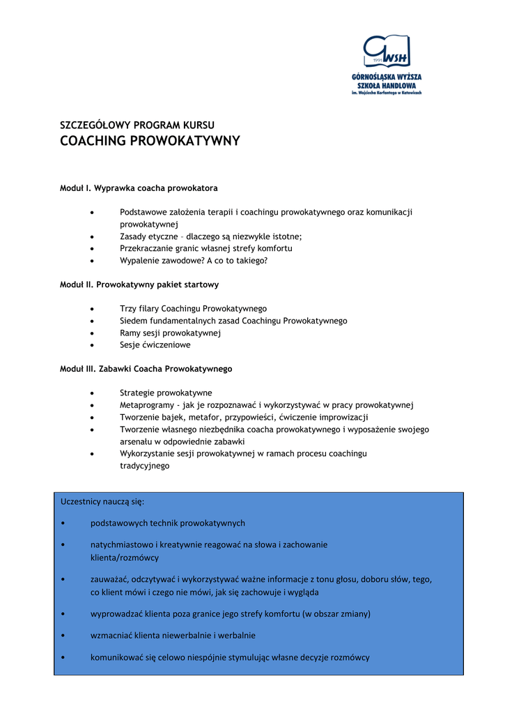 SZCZEGÓŁOWY PROGRAM KURSU COACHING PROWOKATYWNY Moduł I. Wyprawka coacha prowokatora Podstawowe założenia terapii i coachingu prowokatywnego oraz komunikacji prowokatywnej Zasady etyczne – dlaczego są niezwykle istotne; Przekraczanie granic własnej strefy komfortu Wypalenie zawodowe? A co to takiego? Moduł II. Prowokatywny pakiet startowy Trzy filary Coachingu Prowokatywnego Siedem fundamentalnych zasad Coachingu Prowokatywnego Ramy sesji prowokatywnej Sesje ćwiczeniowe Moduł III. Zabawki Coacha Prowokatywnego Strategie prowokatywne Metaprogramy - jak je rozpoznawać i wykorzystywać w pracy prowokatywnej Tworzenie bajek, metafor, przypowieści, ćwiczenie improwizacji Tworzenie własnego niezbędnika coacha prowokatywnego i wyposażenie swojego arsenału w odpowiednie zabawki Wykorzystanie sesji prowokatywnej w ramach procesu coachingu tradycyjnego Uczestnicy nauczą się: • podstawowych technik prowokatywnych • natychmiastowo i kreatywnie reagować na słowa i zachowanie klienta/rozmówcy • zauważać, odczytywać i wykorzystywać ważne informacje z tonu głosu, doboru słów, tego, co klient mówi i czego nie mówi, jak się zachowuje i wygląda • wyprowadzać klienta poza granice jego strefy komfortu (w obszar zmiany) • wzmacniać klienta niewerbalnie i werbalnie • komunikować się celowo niespójnie stymulując własne decyzje rozmówcy dobrze się bawić i jednocześnie bardzo efektywnie pracować