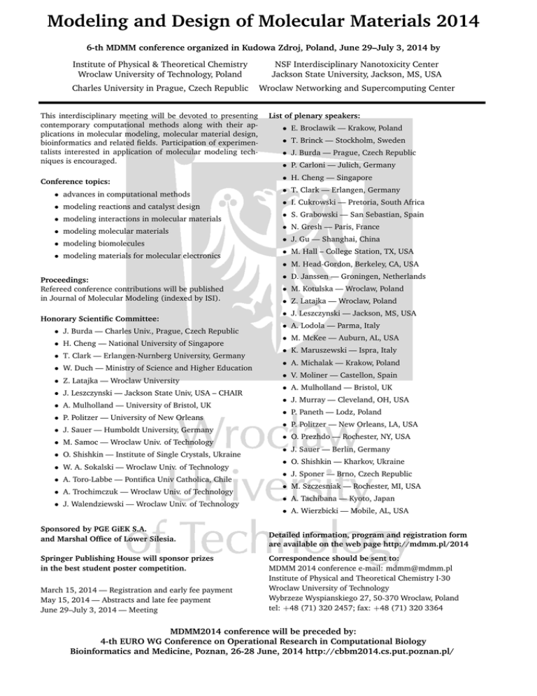 Modeling and Design of Molecular Materials 2014 6-th MDMM conference organized in Kudowa Zdroj, Poland, June 29–July 3, 2014 by Institute of Physical & Theoretical Chemistry Wroclaw University of Technology, Poland NSF Interdisciplinary Nanotoxicity Center Jackson State University, Jackson, MS, USA Charles University in Prague, Czech Republic Wroclaw Networking and Supercomputing Center This interdisciplinary meeting will be devoted to presenting contemporary computational methods along with their applications in molecular modeling, molecular material design, bioinformatics and related fields. Participation of experimentalists interested in application of molecular modeling techniques is encouraged. Conference topics: • advances in computational methods • modeling reactions and catalyst design • modeling interactions in molecular materials • modeling molecular materials • modeling biomolecules • modeling materials for molecular electronics Proceedings: Refereed conference contributions will be published in Journal of Molecular Modeling (indexed by ISI). Honorary Scientific Committee: • J. Burda — Charles Univ., Prague, Czech Republic • H. Cheng — National University of Singapore • T. Clark — Erlangen-Nurnberg University, Germany • W. Duch — Ministry of Science and Higher Education • Z. Latajka — Wroclaw University • J. Leszczynski — Jackson State Univ, USA – CHAIR • A. Mulholland — University of Bristol, UK • P. Politzer — University of New Orleans • J. Sauer — Humboldt University, Germany • M. Samoc — Wroclaw Univ. of Technology • O. Shishkin — Institute of Single Crystals, Ukraine • W. A. Sokalski — Wroclaw Univ. of Technology • A. Toro-Labbe — Pontifica Univ Catholica, Chile • A. Trochimczuk — Wroclaw Univ. of Technology • J. Walendziewski — Wroclaw Univ. of Technology Sponsored by PGE GiEK S.A. and Marshal Office of Lower Silesia. Springer Publishing House will sponsor prizes in the best student poster competition. March 15, 2014 — Registration and early fee payment May 15, 2014 — Abstracts and late fee payment June 29–July 3, 2014 — Meeting List of plenary speakers: • E. Broclawik — Krakow, Poland • T. Brinck — Stockholm, Sweden • J. Burda — Prague, Czech Republic • P. Carloni — Julich, Germany • H. Cheng — Singapore • T. Clark — Erlangen, Germany • I. Cukrowski — Pretoria, South Africa • S. Grabowski — San Sebastian, Spain • N. Gresh — Paris, France • J. Gu — Shanghai, China • M. Hall – College Station, TX, USA • M. Head-Gordon, Berkeley, CA, USA • D. Janssen — Groningen, Netherlands • M. Kotulska — Wroclaw, Poland • Z. Latajka — Wroclaw, Poland • J. Leszczynski — Jackson, MS, USA • A. Lodola — Parma, Italy • M. McKee — Auburn, AL, USA • K. Maruszewski — Ispra, Italy • A. Michalak — Krakow, Poland • V. Moliner — Castellon, Spain • A. Mulholland — Bristol, UK • J. Murray — Cleveland, OH, USA • P. Paneth — Lodz, Poland • P. Politzer — New Orleans, LA, USA • O. Prezhdo — Rochester, NY, USA • J. Sauer — Berlin, Germany • O. Shishkin — Kharkov, Ukraine • J. Sponer — Brno, Czech Republic • M. Szczesniak — Rochester, MI, USA • A. Tachibana — Kyoto, Japan • A. Wierzbicki — Mobile, AL, USA Detailed information, program and registration form are available on the web page http://mdmm.pl/2014 Correspondence should be sent to: MDMM 2014 conference e-mail: [email protected] Institute of Physical and Theoretical Chemistry I-30 Wroclaw University of Technology Wybrzeze Wyspianskiego 27, 50-370 Wroclaw, Poland tel: +48 (71) 320 2457; fax: +48 (71) 320 3364 MDMM2014 conference will be preceded by: 4-th EURO WG Conference on Operational Research in Computational Biology Bioinformatics and Medicine, Poznan, 26-28 June, 2014 http://cbbm2014.cs.put.poznan.pl/
