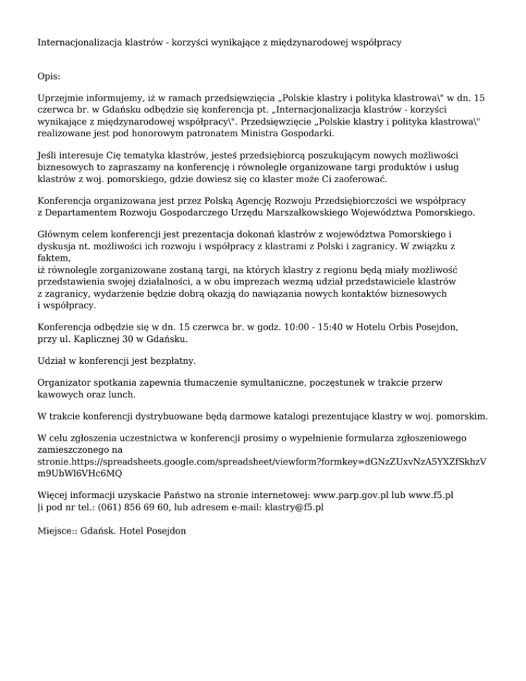 Internacjonalizacja klastrów - korzyści wynikające z międzynarodowej współpracy Opis: Uprzejmie informujemy, iż w ramach przedsięwzięcia „Polskie klastry i polityka klastrowa\" w dn. 15 czerwca br. w Gdańsku odbędzie się konferencja pt. „Internacjonalizacja klastrów - korzyści wynikające z międzynarodowej współpracy\". Przedsięwzięcie „Polskie klastry i polityka klastrowa\" realizowane jest pod honorowym patronatem Ministra Gospodarki. Jeśli interesuje Cię tematyka klastrów, jesteś przedsiębiorcą poszukującym nowych możliwości biznesowych to zapraszamy na konferencję i równolegle organizowane targi produktów i usług klastrów z woj. pomorskiego, gdzie dowiesz się co klaster może Ci zaoferować. Konferencja organizowana jest przez Polską Agencję Rozwoju Przedsiębiorczości we współpracy z Departamentem Rozwoju Gospodarczego Urzędu Marszałkowskiego Województwa Pomorskiego. Głównym celem konferencji jest prezentacja dokonań klastrów z województwa Pomorskiego i dyskusja nt. możliwości ich rozwoju i współpracy z klastrami z Polski i zagranicy. W związku z faktem, iż równolegle zorganizowane zostaną targi, na których klastry z regionu będą miały możliwość przedstawienia swojej działalności, a w obu imprezach wezmą udział przedstawiciele klastrów z zagranicy, wydarzenie będzie dobrą okazją do nawiązania nowych kontaktów biznesowych i współpracy. Konferencja odbędzie się w dn. 15 czerwca br. w godz. 10:00 - 15:40 w Hotelu Orbis Posejdon, przy ul. Kaplicznej 30 w Gdańsku. Udział w konferencji jest bezpłatny. Organizator spotkania zapewnia tłumaczenie symultaniczne, poczęstunek w trakcie przerw kawowych oraz lunch. W trakcie konferencji dystrybuowane będą darmowe katalogi prezentujące klastry w woj. pomorskim. W celu zgłoszenia uczestnictwa w konferencji prosimy o wypełnienie formularza zgłoszeniowego zamieszczonego na stronie.https://spreadsheets.google.com/spreadsheet/viewform?formkey=dGNzZUxvNzA5YXZfSkhzV m9UbWl6VHc6MQ Więcej informacji uzyskacie Państwo na stronie internetowej: www.parp.gov.pl lub www.f5.pl |i pod nr tel.: (061) 856 69 60, lub adresem e-mail: [email protected] Miejsce:: Gdańsk. Hotel Posejdon