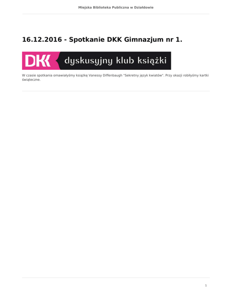 Miejska Biblioteka Publiczna w Działdowie 16.12.2016 - Spotkanie DKK Gimnazjum nr 1. W czasie spotkania omawiałyśmy książkę Vanessy Diffenbaugh "Sekretny język kwiatów". Przy okazji robiłyśmy kartki świąteczne. 1