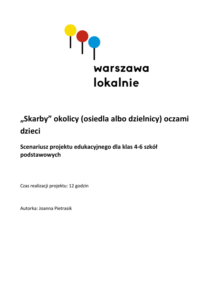 „Skarby” okolicy (osiedla albo dzielnicy) oczami dzieci Scenariusz projektu edukacyjnego dla klas 4-6 szkół podstawowych Czas realizacji projektu: 12 godzin Autorka: Joanna Pietrasik Uzasadnienie realizacji projektu: Istotą proponowanego projektu jest odnalezienie i docenienie przez dzieci dziedzictwa kulturowo – historycznego swojej okolicy (osiedla labo dzielnicy). W konsekwencji wpłynie to na zwiększenie identyfikacji dzieci ze swoją okolicą i zbuduję ich pozytywną wieź z okolicą, w której się uczą albo/i mieszkają. Sednem projektu jest stworzenie przez dzieci mapy z zaznaczonymi „skarbami” dziedzictwa kulturowego i historycznego okolicy szkoły. Dzieci będą zbierały informacje o elementach dziedzictwa kulturowego i historii okolicy szkoły, wyszukiwały elementy dziedzictwa, którymi ich zdaniem mogą się pochwalić. Nie chcemy narzucać dzieciom elementów dziedzictwa, z którego mogą być dumni albo uznać za godne zainteresowania. Chcemy żeby inicjatywa i zaciekawienie jakimś fragmentem dziedzictwa okolicy wypływał wprost ze szczerej uwagi i zainteresowania dzieci. Efektem projektu będzie twórcze przedstawienie najciekawszych miejsc związanych z dziedzictwem kulturowo - historycznym, który otacza szkołę i dzieci na prezentacji mapy z zaznaczoną trasą spacerową. Realizacja projektu będzie składała się z trzech głównych etapów: 1. Etap przygotowawczy - refleksja co jest największym skarbem, zasobem okolicy oraz co warto pokazać inny tak by poznali dziedzictwo kulturowo-historyczne okolicy (osiedla albo dzielnicy). 1. Etap realizacji - spacer w terenie – odkrywanie dziedzictwa kulturowego oraz przygotowanie mapy z „zaznaczonymi” skarbami okolicy ilustrującymi jej dziedzictwo 2. Etap kończący - prezentacja efektu pracy młodych (mapy okolicy i trasy spacerowej) Cele ogólne projektu: zwiększenie wśród dzieci poczucia identyfikacji z miejscem uczenia się i mieszkania zbudowanie wśród dzieci więzi z okolicą poprzez poznanie jej dziedzictwa kulturowego i historycznego zachęcenie dzieci do włączania się we wspólne działania Cele szczegółowe w języku uczestników: uczennicy i uczniowie poznają i//lub na nowo odkryją elementy kultury i historii okolicy szkoły uczennice i uczniowie zrobią mapę okolicy szkoły z zaznaczonymi na niej „skarbami” uczennice i uczniowie lepiej poznają dziedzictwo kulturowe i historię okolicy szkoły 2 Główne kompetencje kluczowe rozwijane podczas realizacji projektu: zainteresowanie przeszłością i przyszłością swojej okolicy oraz jej rozwojem społecznogospodarczym, konstruktywne uczestnictwo w działaniach społeczności lokalnej, umiejętność planowania działań (pracy, nauki). Opis działań w projekcie Efektem realizacji projektu ma być przekonanie, że nie tylko dorośli, ale również młodzi, mogą być dumni ze swojej okolicy, znać jej walory oraz wpływać na swoje otoczenie. Projekt zakłada sporą dowolność podejmowanych działań i duży zakres decyzji dzieci oraz współpracę z rodzicami i instytucjami lokalnymi (zadaniem nauczyciela będzie włączenie rodziców do projektu). Wspólna praca rodziców i dzieci ma wzmocnić przekaz edukacyjny podkreślający wagę znajomości dziedzictwo swojej okolicy i wspólne działanie na rzecz społeczności lokalnej. Etap projektu Działania/ Opis Sformułowanie problemu i celów projektu Starter/rozgrzewka: Czas Terminy (wpisać daty) 1 godz. Co jest skarbem moim i okolicy? Dzieci zastanawiają się jak wygląda ich najbliższa okolica, co jest ich zdaniem jej największą zaletą, „skarbem” oraz z czego mogą być dumne. Zastanawiają się co jest „skarbem” ich osobistym i tym w najbliższej okolicy szkoły. Uczniowie i uczennice poznają istotę projektu. Planowanie działań Co nas czeka w projekcie? Uczniowie i uczennice formułują cele projektu, opracowują kryteria sukcesu oraz plan działań Działania uczniów Co jest dziedzictwem kulturowo-historycznym naszej okolicy? 1 godz. 1 godz. Uczniowie i uczennice zastanawiają się co jest 3 największym skarbem, zasobem okolicy oraz co warto pokazać inny tak by poznali dziedzictwo kulturowohistoryczne okolicy (osiedla albo dzielnicy). Uczniowie i uczennice poznają znaczenie terminu: dziedzictwo kulturowo-historyczne Ustalamy trasę spaceru po okolicy – przygotowanie do pracy w terenie Uczniowie i uczennice przygotowują się do pracy w terenie tj. ustalają trasę spaceru po okolicy. Robią wstępną listę „obiektów”, miejsc, które chcą umieścić na swojej mapie. Spacer po okolicy – zbieranie i weryfikacja materiałów do mapy Uczniowie i Uczennice w czasie wycieczki po okolicy fotografują wybrane miejsca, obiekty i ludzi. Robią również zdjęcia, takie których wcześniej nie planowali oraz zdobywają o nich informacje. Przeprowadzają wywiady z mieszkańcami, sąsiadami, rodzicami i dziadkami na temat dziedzictwa okolicy 1 godz. 2 godz. + 2 godz. (praca własna dzieci i rodziców) Przygotowanie do prezentacji mapy „skarbów” okolicy Uczniowie i uczennice analizują zebrany materiał, to, podsumowują to czego nauczyli się na spacerze okolicy. Tworzą mapę „skarbów” okolicy. 3 godz. Przygotowują prezentację mapy „skarbów” okolicy: drukują zdjęcia, opracowują opisy do mapy, zapraszają gości itd. Prezentacja Prezentacja mapy „skarbów” okolicy Uczniowie i uczennice prezentują efekty swojej pracy i projektu. Refleksja 2 godz. Podsumowanie projektu: Dzieci zastanawiają się nad swoimi kompetencjami które zdobyły i rozwinęły w trakcie trwania projektu. 1 godz. Łącznie: 12 godz. 4 ETAPY PROJEKTU EDUKACYJNEGO 1. SFORMUŁOWANIE PROBLEMU I CELÓW PROJEKTU Co jest skarbem moim i okolicy? – 1 godz. Cel: refleksja uczniów i uczennic na temat zasobów, skarbów swoich i okolicy szkoły Pomoce: taśma klejąca, duże arkusze papieru, farby lub kredki lub flamastry, mapa Warszawy Opowiedz uczniom o projekc