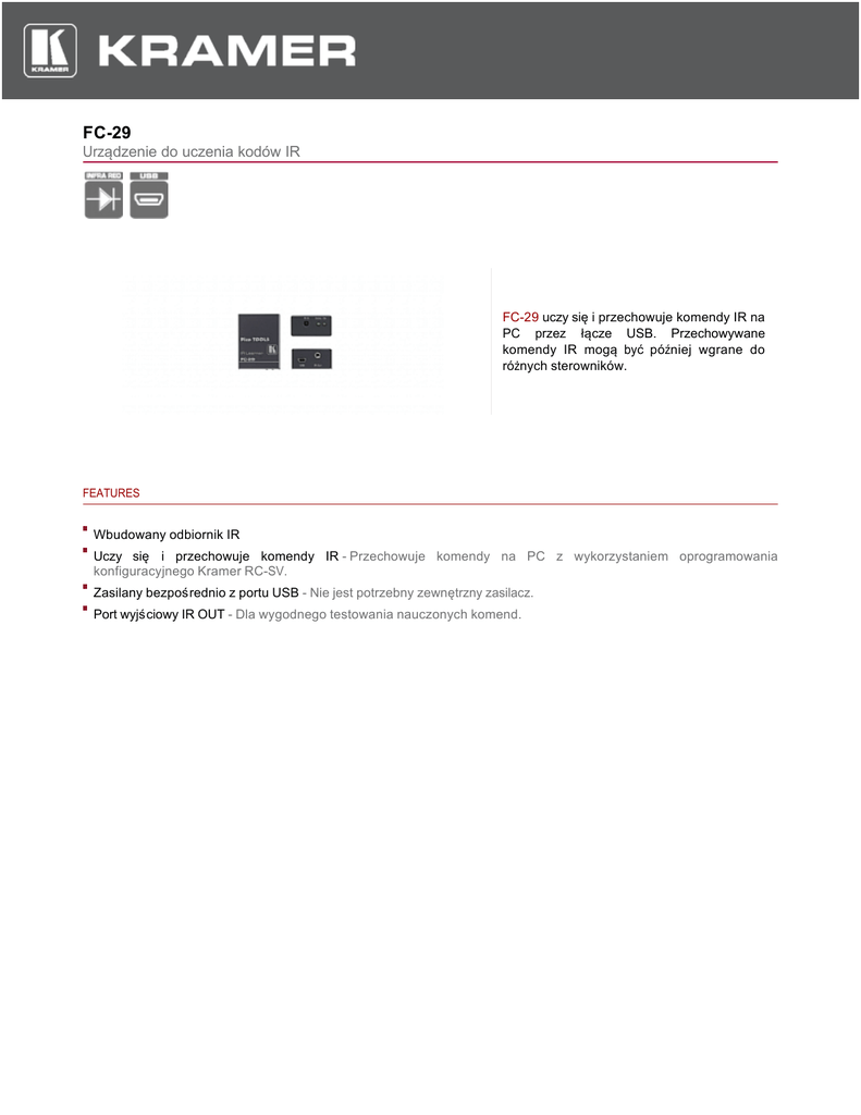 FC-29 Urządzenie do uczenia kodów IR FC-29 uczy się i przechowuje komendy IR na PC przez łącze USB. Przechowywane komendy IR mogą być później wgrane do różnych sterowników. FEATURES Wbudowany odbiornik IR Uczy się i przechowuje komendy IR - Przechowuje komendy na PC z wykorzystaniem oprogramowania konfiguracyjnego Kramer RC-SV. Zasilany bezpośrednio z portu USB - Nie jest potrzebny zewnętrzny zasilacz. Port wyjściowy IR OUT - Dla wygodnego testowania nauczonych komend. FC-29 TECHNICAL SPECIFICATIONS WEJŚCIE: 1 odbiornik IR WYJŚCIA: 1 nadajnik IR na złączu mini jack 3,5 mm ŹRÓDŁO ZASILANIA: 5 V DC (USB), 120 mA WYMIARY: 4.22 cm x 5.18 cm x 2.44 cm (1.66" x 2.04" x 0.96") szer., głęb., wys. MASA: Ok. 0.15 kg (0.55 lbs). AKCESORIA: Zasilacz OPTIONS: RK−4PT 19" rack adapter.