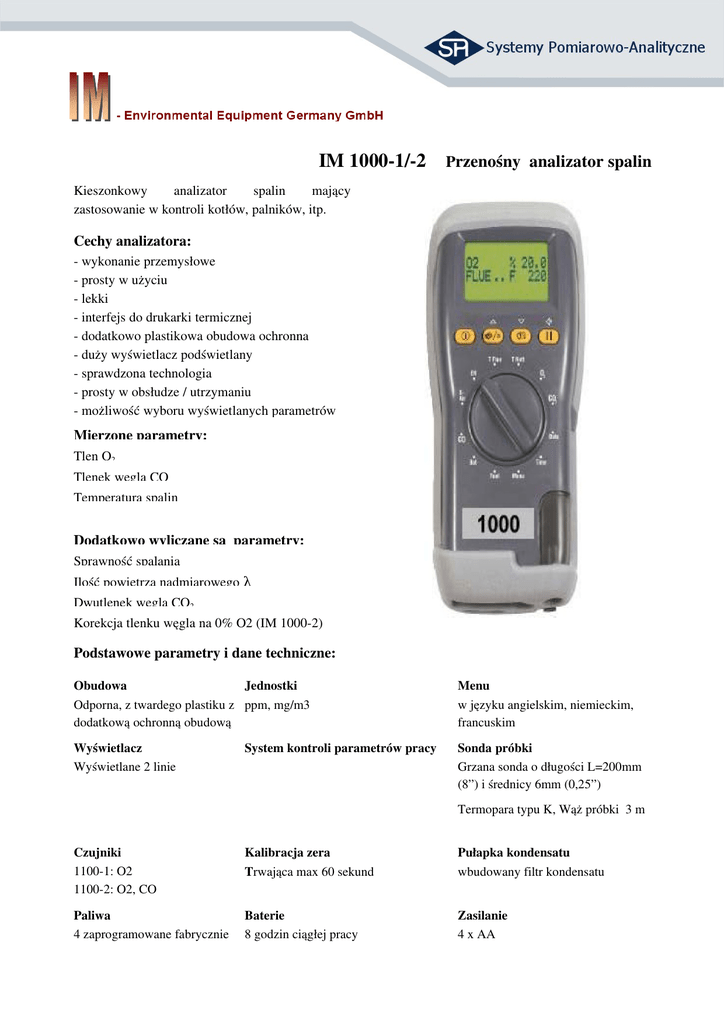 IM 10001/2 Przenośny analizator spalin Kieszonkowy analizator spalin mający zastosowanie w kontroli kotłów, palników, itp. Cechy analizatora: wykonanie przemysłowe prosty w użyciu lekki interfejs do drukarki termicznej dodatkowo plastikowa obudowa ochronna duży wyświetlacz podświetlany sprawdzona technologia prosty w obsłudze / utrzymaniu możliwość wyboru wyświetlanych parametrów Mierzone parametry: Tlen O2 Tlenek węgla CO Temperatura spalin Dodatkowo wyliczane są parametry: Sprawność spalania Ilość powietrza nadmiarowego λ Dwutlenek węgla CO2 Korekcja tlenku węgla na 0% O2 (IM 10002) Podstawowe parametry i dane techniczne: Obudowa Jednostki Odporna, z twardego plastiku z ppm, mg/m3 dodatkową ochronną obudową Menu w języku angielskim, niemieckim, francuskim Wyświetlacz Wyświetlane 2 linie Sonda próbki Grzana sonda o długości L=200mm (8”) i średnicy 6mm (0,25”) System kontroli parametrów pracy Termopara typu K, Wąż próbki 3 m Czujniki 11001: O2 11002: O2, CO Kalibracja zera Pułapka kondensatu Trwająca max 60 sekund wbudowany filtr kondensatu Paliwa 4 zaprogramowane fabrycznie Baterie 8 godzin ciągłej pracy Zasilanie 4 x AA Mierzony związek Metoda pomiarowa Rozdzielczość Dokładność Zakres Standard O2 Tlen Celka elektrochemiczna 0,1 % vol ± 0,2 % vol 020,9 % vol √ CO Tlenek węgla Celka elektrochemiczna 1 ppm ± 5% 02000ppm 10002 COp Tlenek węgla Wyliczany 1 ppm ± 5% 02000ppm 10002 TG Temp. spalin Termopara “K” 1oF / oC ± 2 % 321112oF 0600oC √ TN Temp. Wyliczany 1oF / oC ± 0,3 % 321112oF 0600oC √ TA Temp. otoczenia Półprzewodnik 1oF / oC ± 0,3 % 32212oF 0100oC √ CO2 Dwutlenek węgla Wyliczany 0,1 % vol ± 0,3 % 0CO2 max √ ETA Sprawność spalania Wyliczany 0,1 % ± 1 % 099,9 % √ λ Powietrze nadmiarowe Wyliczany 0,1 ± 2 % 0250% √ Temperatura pracy 50oF – 104oF / 0oC – 40oC (1090%, niekondensująca) Temperatura przechowywania: 4oF – 122oF / 20oC – 50oC Wymiary: 200mm x 45mm x 90mm Waga: 1 kg Dostępne są również inne zakresy Opcje Adapter AC Drukarka termiczna Miękka walizka do przenoszenia Twarda walizka do przenoszenia Model IM 10001 O2, pułapka kondensatu, sonda próbki, baterie, instrukcja obsługi IM 10002 O2, CO pułapka kondensatu, sonda próbki, baterie, instrukcja obsługi Przedstawiciel firmy IM na terenie Polski: SPA Systemy PomiarowoAnalityczne sp. z o.o. www.spasystemy.pl ; biuro@spasystemy.pl