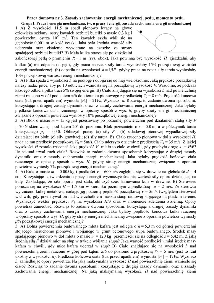 Praca domowa nr 3. Zasady zachowania: energii mechanicznej, pędu, momentu pędu. Grupa1. Praca i energia mechaniczna, tw. o pracy i energii, zasada zachowania energii mechanicznej 1. A) Z wysokości 11,5 m spadł pionowo lecący na głowę człowieka szklany, ostry kawałek rozbitej butelki o masie 0,3 kg i powierzchni ostrza 10-7 m2. Ten kawałek szkła wbił się na głębokość 0,001 m w kość czaski. Jaka była średnia wartość siły uderzenia oraz ciśnienie wywierane na czaszkę ze strony spadającej rozbitej butelki? B) Mała kulka stacza się po zjeżdżalni zakończonej pętlą o promieniu R = 1 m (rys. obok). Jaka powinna być wysokość H zjeżdżalni, aby kulka: (a) nie odpadła od pętli, gdy praca na rzecz siły tarcia wyniosłaby 15% początkowej wartości energii mechanicznej; (b) odpadła na wysokości h = 1,5R , gdyby praca na rzecz siły tarcia wyniosłaby 10% początkowej wartości energii mechanicznej? 2. A) Piłka spada z wysokości h na podłogę i odbija się od niej wielokrotnie. Jaką prędkość początkową należy nadać piłce, aby po 10 odbiciach wzniosła się na początkową wysokość h. Wiadomo, że podczas każdego odbicia piłka traci 5% swojej energii. B) Ciało znajdujące się na wysokości h nad powierzchnią ziemi rzucono w dół pod kątem π/6 do kierunku pionowego z prędkością V0 = 8 m/s. Prędkość końcowa ciała (tuż przed upadkiem) wyniosła |Vk| = 21V0. Wyznacz h. Rozwiąż to zadanie dwoma sposobami: korzystając z drugiej zasady dynamiki oraz z zasady zachowania energii mechanicznej. Jaka byłaby prędkość końcowa ciała rzuconego w opisany sposób z wys. h, gdyby straty energii mechanicznej związane z oporami powietrza wyniosły 10% początkowej energii mechanicznej? 3. A) Blok o masie m = 15 kg jest przesuwany po poziomej powierzchni pod działaniem stałej siły F = 70 N skierowanej pod kątem 20◦ do poziomu. Blok przesunięto o s = 5,0 m, a współczynnik tarcia kinetycznego µk = 0,30. Obliczyć pracę: (a) siły F ; (b) składowej pionowej wypadkowej siły działającej na blok; (c) siły grawitacji; (d) siły tarcia. B) Ciało rzucono pionowo w dół z wysokości H, nadając mu prędkość początkową V0 = 5m/s. Ciało uderzyło o ziemię z prędkością Vk = 35 m/s. Z jakiej wysokości H zostało rzucone? Jaką prędkość V1 miało to ciało w chwili, gdy przebyło drogę s1 = H/6? Ile sekund trwał ruch ciała? Rozwiąż to zadanie dwoma sposobami: korzystając z drugiej zasady dynamiki oraz z zasady zachowania energii mechanicznej. Jaka byłaby prędkość końcowa ciała rzuconego w opisany sposób z wys. H, gdyby straty energii mechanicznej związane z oporami powietrza wyniosły 7% początkowej energii mechanicznej? 4. A) Kula o masie m = 0,005 kg i prędkości v = 600 m/s zagłębiła się w drewnie na głębokość d = 4 cm. Korzystając z twierdzenia o pracy i energii wyznaczyć średnią wartość siły oporu działającej na kulę. Zakładając, że siła oporu jest stała, obliczyć czas hamowania kuli w drewnie. B) Sterowiec porusza się na wysokości H = 1,5 km w kierunku poziomym z prędkością u = 2 m/s. Ze sterowca wyrzucono kulkę metalową, nadając jej poziomą prędkość początkową v = 5m/s (względem sterowca) w chwili, gdy przelatywał on nad wierzchołkiem masztu stacji radiowej stojącego na płaskim terenie. Wyznaczyć wektor prędkości V1 na wysokości H/3 oraz w momencie zderzenia z ziemią. Opory powietrza zaniedbać. Rozwiąż to zadanie dwoma sposobami: korzystając z drugiej zasady dynamiki oraz z zasady zachowania energii mechanicznej. Jaka byłaby prędkość końcowa kulki rzuconej w opisany sposób z wys. H, gdyby straty energii mechanicznej związane z oporami powietrza wyniosły p% początkowej energii mechanicznej? 5. A) Dolna powierzchnia budowalnego młota kafara jest odległa o h = 5,3 m od górnej powierzchni stojącego nieruchomo pionowo i wbijanego w grunt betonowego słupa budowlanego. Środek masy spadającego pionowo w dół młota o masie m = 120 kg przemieścił się na odległość s = 5,42 m. Z jaką średnią siłą F działał młot na słup w trakcie wbijania słupa? Jaką wartość prędkości v miał środek masy kafara w chwili, gdy młot kafara uderzał w słup? B) Ciało znajdujące się na wysokości h nad powierzchnią ziemi rzucono w górę pod kątem π/6 do poziomo z prędkością V0 = 5 m/s (jest to rzut ukośny z wysokości h). Prędkość końcowa ciała (tuż przed upadkiem) wyniosła |Vk| = 17V0. Wyznacz h, zaniedbując opory powietrza. Na jaką maksymalną wysokość H nad powierzchnię ziemi wzniosło się ciało? Rozwiąż to zadanie dwoma sposobami: korzystając z drugiej zasady dynamiki oraz z zasady zachowania energii mechanicznej. Na jaką maksymalną wysokość H nad powierzchnię ziemi 1 wzniosłoby się to ciało rzucone w opisany sposób, gdyby straty energii mechanicznej związane z oporami powietrza wyniosły 5% początkowej energii mechanicznej? 6. A) Sanki o masie 10 kg ześlizgują się ze zbocza góry. Długość zbocza wynosi 20 m, kąt jego nachylenia względem płaskiego terenu wokół góry wynosi 30 stopni. Współczynnik tarcia na całej drodze sanek f = 0.01. Jaką odległość przebędą sanki na poziomym odcinku po zjechania do zbocza? B) Ciało znajdujące się na wysokości h nad powierzchnią ziemi rzucono pionowo do góry z prędkością V0 = 5 m/s. Prędkość końcowa ciała (tuż przed upadkiem) wyniosła |Vk| = 5V0. Wyznaczyć h. Na jaką maksymalną wysokość H nad powierzchnię ziemi wzniosło się ciało? Rozwiąż to zadanie dwoma sposobami: korzystając z drugiej zasady dynamiki oraz z zasady zachowania energii mechanicznej. Jaka byłaby prędkość końcowa ciała rzuconego w opisany sposób na wys. h, gdyby straty energii mechanicznej związane z oporami powietrza wyniosły 9% początkowej energii mechanicznej? 7. A) Klocek został pchnięty w górę wzdłuż równi pochyłej o kącie nachylenia 