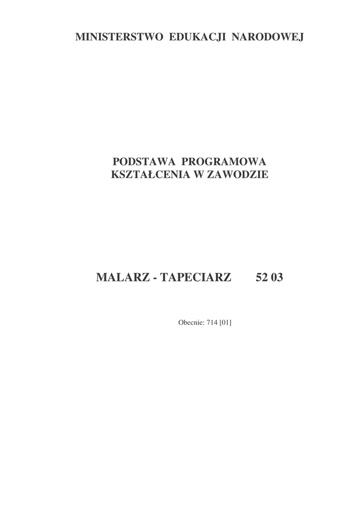 MINISTERSTWO EDUKACJI NARODOWEJ PODSTAWA PROGRAMOWA KSZTAŁCENIA W ZAWODZIE MALARZ - TAPECIARZ Obecnie: 714 [01] 52 03 I. ZAŁO ENIA PROGRAMOWO-ORGANIZACYJNE KSZTAŁCENIA W ZAWODZIE MALARZ - TAPECIARZ 1. OPIS KWALIFIKACJI ABSOLWENTA 1.1. Umiej tno ci zawodowe stanowi ce kwalifikacje w zawodzie W wyniku realizacji kształcenia w zawodzie ucze (słuchacz) powinien umie : − dokonywa prawidłowego doboru materiałów, narz dzi i sprz tu, − ustala ilo ci materiałów potrzebnych do wykonania robót, − posługiwa si narz dziami i urz dzeniami zgodnie z zasadami ich eksploatacji i konserwacji, oraz zasadami bhp, − czyta dokumentacj techniczn i sporz dza szkice robocze potrzebne do wykonywania robót malarskich i tapeciarskich, − sporz dza proste projekty rozwi za kolorystycznych wn trz i elewacji, − organizowa , u ytkowa i likwidowa stanowiska pracy do robót malarskich z uwzgl dnieniem przepisów bhp, ppo . i ochrony rodowiska, − przygotowywa podło a do robót malarskich, − wykonywa malowanie wapienne, klejowe, emulsyjne, olejne, kazeinowe i krzemianowe oraz lakierowanie i powlekanie emaliami, − przygotowywa tapety, kleje, szpachlówki i powierzchnie podło y do tapetowania, − wykonywa tapetowanie, − wykonywa napisy, szyldy i ornamenty, − wykonywa przedmiary i obmiary robót oraz rozliczenia materiałowe, − oblicza wynagrodzenie za wykonywan prac , − składa oferty pracy, wykonywa proste kosztorysy ofertowe i sporz dza umowy o wykonanie robót. 1.2. Wymagania psychofizyczne wła ciwe dla zawodu − dobry stan zdrowia, − du a sprawno − odporno − wra liwo − zdolno ruchowa, na l k wysoko ci, estetyczna, podejmowania samodzielnych decyzji, − odpowiedzialno i zdyscyplinowanie 1.3. Przeciwwskazania zdrowotne − wady wzroku: schorzenia upo ledzaj ce ostro widzenia, rozró niania barw, du a krótkowzroczno , oczopl s, − choroby układu kr enia i wady serca, − choroby układu oddechowego, − choroby układu nerwowego: padaczka, niedowłady ko czyn, − choroby reumatyczne, − choroby alergiczne, − schorzenia kr gosłupa, ko czyn górnych i dolnych upo ledzaj ce sprawno ruchow , − przewlekłe choroby skóry. Uwaga ko cowa: 3 O przydatno ci do zawodu i zdolno ci do pracy w budownictwie orzeka uprawniony lekarz. Badania lekarskie musz uwzgl dnia wszystkie kryteria okre lone we wskazaniach i przeciwwskazaniach zdrowotnych, dotycz ce toku nauki i pó niejszego wykonywania zawodu przez kandydata. 2. SPECYFICZNE WYMAGANIA ZAWODU Kształcenie młodzie y i dorosłych w zawodzie malarza-tapeciarza odbywa si w 3-letnich szkołach zasadniczych na podbudowie programowej szkoły podstawowej. Absolwent uzyskuje tytuł robotnika wykwalifikowanego, daj cy prawo wykonywania zawodu lub kontynuowania nauki w trzyletnim technikum budowlanym. Tre ci kształcenia zawodowego podzielono na dwa bloki programowe A i B. Blok A, o nazwie technologia robót malarskich i tapeciarskich, obejmuje wiadomo ci i umiej tno ci z materiałoznawstwa, budownictwa ogólnego, technologii robót malarskich i tapeciarskich, ich wykonawstwa, bhp i ochrony rodowiska. Blok B, o nazwie dokumentacja techniczna oraz podstawy działalno ci gospodarczej, umo liwia opanowanie umiej tno ci wykorzystania dokumentacji technicznej przy wykonywaniu czynno ci zawodowych, wykonywania rysunków technicznych i odr cznych, ornamentów i napisów, sporz dzania projektów rozwi za kolorystycznych wn trz i elewacji budynków. Zapewnia tak e nabycie umiej tno ci funkcjonowania w systemie gospodarki rynkowej: poszukiwania pracy i samodzielnego prowadzenia działalno ci gospodarczej. Wa n rol w kształceniu zawodowym odgrywa współpraca z przedsi biorstwami budowlanymi i remontowymi, poniewa 4 szkoły umo liwia odbywanie zaj praktycznych na budowach i zapewnia dost p do nowoczesnych rozwi za technologicznych. 3. WARUNKI TECHNICZNE Szkoła podejmuj ca kształcenie w zawodzie powinna posiada : − klasopracowni ogólnobudowlan wyposa on w modele, makiety, plansze, normy, albumy, filmy, prze rocza, foliogramy ilustruj ce tre ci poszczególnych tematów i urz dzenia techniczne, umo liwiaj ce korzystanie ze zgromadzonych pomocy dydaktycznych: magnetowid, telewizor, rzutnik, projektoskop do przenoszenia na ekran napisów i rysunków wykonanych na folii, kamera telewizyjna do prezentowania rysunków i wykresów z podr czników na ekranie telewizora, czasopisma techniczne, − pracowni rysunku zawodowego ze stanowiskami kre larskimi (dla ka dego ucznia) odpowiednio oprzyrz dowanymi, dostosowanymi do rysowania i kre lenia rysunków technicznych i z zestawem rodków dydaktycznych wyszczególnionych dla klasy-pracowni ogólnobudowlanej, − pracownie warsztatowe z pomieszczeniami: • sale do wykonywania praktycznych zada malarskich i tapeciarskich, wyposa one w odpowiednie narz dzia i sprz t, instrukcje bhp, rodki ochrony osobistej, plansze, modele, tablice obja niaj ce wykonanie poszczególnych robót, • klasy-pracownie do przeprowadzania instrukta y, przekazywania niezb dnych informacji teoretycznych dotycz cych wykonywanych prac, wy wietlania filmów dydaktycznych, sporz dzania notatek w zeszytach przedmiotowych, • podr czne laboratorium wyposa one w urz dzenia i sprz t do wykonywania podstawowych bada materiałów budowlanych. 5 4. WARUNKI KADROWE Wymagania w zakresie kwalifikacji nauczycieli powinny by zgodne z Rozporz dzeniem Ministra Edukacji Narodowej z dnia 10 pa dziernika 1991 r. w sprawie szczegółowych kwalifikacji wymaganych od nauczycieli oraz okre lenia szkół i wypadków, w których mo na zatrudni nauczycieli nie maj cych wy szego wykształcenia (Dz. U. Nr 98, poz. 433 oraz z 1994 r. Nr 5, poz. 19 i Nr 109, poz. 521). 5. KSZTAŁCENIE W RÓ NYCH FORMACH ORGANIZACYJNYCH Zakres kształcenia zawodowego malarzy-tapeciarzy okre laj umiej tno ci zawodowe, stanowi ce kwalifikacje w zawodzie. Wyodr bniono dwa bloki programowe obejmuj ce kształcenie teoretyczne i praktyczne we wszystkich klasach. Kształcenie dorosły