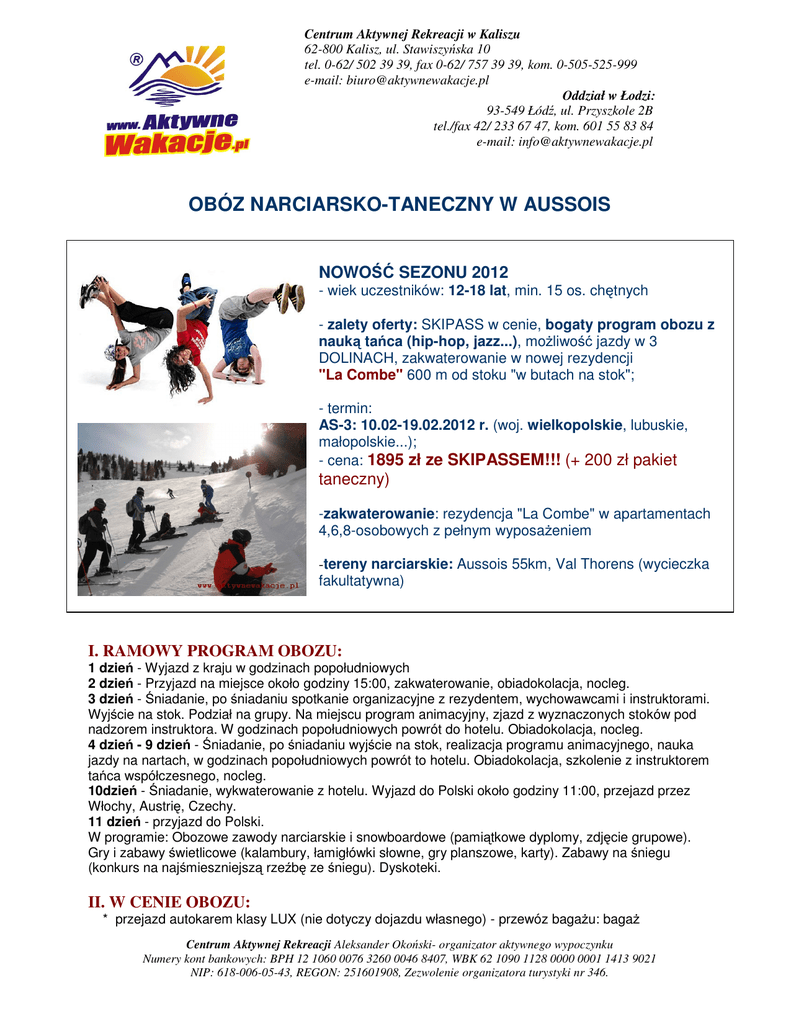 Centrum Aktywnej Rekreacji w Kaliszu 62-800 Kalisz, ul. Stawiszyńska 10 tel. 0-62/ 502 39 39, fax 0-62/ 757 39 39, kom. 0-505-525-999 e-mail: [email protected] Oddział w Łodzi: 93-549 Łódź, ul. Przyszkole 2B tel./fax 42/ 233 67 47, kom. 601 55 83 84 e-mail: [email protected] OBÓZ NARCIARSKO-TANECZNY W AUSSOIS NOWOŚĆ SEZONU 2012 - wiek uczestników: 12-18 lat, min. 15 os. chętnych - zalety oferty: SKIPASS w cenie, bogaty program obozu z nauką tańca (hip-hop, jazz...), moŜliwość jazdy w 3 DOLINACH, zakwaterowanie w nowej rezydencji "La Combe" 600 m od stoku "w butach na stok"; - termin: AS-3: 10.02-19.02.2012 r. (woj. wielkopolskie, lubuskie, małopolskie...); - cena: 1895 zł ze SKIPASSEM!!! (+ 200 zł pakiet taneczny) -zakwaterowanie: rezydencja "La Combe" w apartamentach 4,6,8-osobowych z pełnym wyposaŜeniem -tereny narciarskie: Aussois 55km, Val Thorens (wycieczka fakultatywna) I. RAMOWY PROGRAM OBOZU: 1 dzień - Wyjazd z kraju w godzinach popołudniowych 2 dzień - Przyjazd na miejsce około godziny 15:00, zakwaterowanie, obiadokolacja, nocleg. 3 dzień - Śniadanie, po śniadaniu spotkanie organizacyjne z rezydentem, wychowawcami i instruktorami. Wyjście na stok. Podział na grupy. Na miejscu program animacyjny, zjazd z wyznaczonych stoków pod nadzorem instruktora. W godzinach popołudniowych powrót do hotelu. Obiadokolacja, nocleg. 4 dzień - 9 dzień - Śniadanie, po śniadaniu wyjście na stok, realizacja programu animacyjnego, nauka jazdy na nartach, w godzinach popołudniowych powrót to hotelu. Obiadokolacja, szkolenie z instruktorem tańca współczesnego, nocleg. 10dzień - Śniadanie, wykwaterowanie z hotelu. Wyjazd do Polski około godziny 11:00, przejazd przez Włochy, Austrię, Czechy. 11 dzień - przyjazd do Polski. W programie: Obozowe zawody narciarskie i snowboardowe (pamiątkowe dyplomy, zdjęcie grupowe). Gry i zabawy świetlicowe (kalambury, łamigłówki słowne, gry planszowe, karty). Zabawy na śniegu (konkurs na najśmieszniejszą rzeźbę ze śniegu). Dyskoteki. II. W CENIE OBOZU: * przejazd autokarem klasy LUX (nie dotyczy dojazdu własnego) - przewóz bagaŜu: bagaŜ Centrum Aktywnej Rekreacji Aleksander Okoński- organizator aktywnego wypoczynku Numery kont bankowych: BPH 12 1060 0076 3260 0046 8407, WBK 62 1090 1128 0000 0001 1413 9021 NIP: 618-006-05-43, REGON: 251601908, Zezwolenie organizatora turystyki nr 346. podstawowy do 20 kg, 1 para sprzętu (narty lub snowboard + buty w pokrowcu) * 7 noclegów w apartamencie 4,6,8 os. z pościelą i ręcznikami * 6- dniowy karnet narciarski na stoki AUSSOIS (55 km tras) * szkolenie z instruktorem tańca współczesnego (6 x 2h); w ramach zajęć tanecznych: hip-hop, jazz, afrodance. Zajęcia odbywać się będą wieczorem na świetlicy po zajęciach na stoku, * wyŜywienie- śniadania i obiadokolacje (polska kuchnia) * wycieczka do Orelle (Val Thorens) - przy minimum 20 os. chętnych. (Uwaga!!! dopłata do karnetu 17,50 €) * opieka wykwalifikowanej kadry pedagogicznej oraz instruktorów narciarskich (zajęcia na stoku w róŜnych grupach zaawansowania) * opieka rezydenta III. CENA NIE ZAWIERA: * ubezpieczenie podróŜne KL, NNW 50 PLN/os. (obowiązkowe) * ubezpieczenie SKI 40 PLN/os. (zawiera OC na stoku) -zalecane * ubezpieczenie od kosztów rezygnacji * ubezpieczenie od chorób przewlekłych * pakiet taneczny (6 x 2h) 200 PLN/os. * kaucja zwrotna za apartament 20 €/osobę - WAśNE !!!! ZA WSZELKIE SZKODY WYRZĄDZONE PRZEZ UCZESTNIKÓW OBOZU, ODPOWIEDZIALNOŚĆ MATERIALNĄ PONOSIĆ BĘDĄ RODZICE * opcjonalnie lunch pakiet na stok 20 € (płatne gotówką w autokarze po zaznaczeniu na umowie "Deklaracji Lunch Pakiet”). IV. POZOSTAŁE SZCZEGÓŁY OFERTY ZAKWATEROWANIE: "La Combe" to nowa, bardzo ładna i zadbana rezydencja wybudowana w stylu góralskim. Zakwaterowanie w apartamentach 4,6,8-osobowych. Przy budynku: minimarket spoŜywczy, bary, restauracje, sklep sportowy. WyŜywienie (polska kuchnia):Obiadokolacjeserwowane, dwudaniowe. Przykładowe śniadanie: płatki, mleko, pieczywo, ser, wędlina, konfitury, nutella, kawa, herbata, kakao. Opcjonalnie lunch pakiet na stok 20 €/os./6 dni( płatne gotówką w autokarze po zaznaczeniu na umowie "Deklaracji Lunch Pakiet). W skład przykładowego lunch pakietu wchodzi- kanapka 1/3 bagietki z wędliną, serem Ŝółtym, 2 batony, owoc, woda lub sok. TERENY NARCIARSKIE: AUSSOIS to malownicza stacja połoŜona w sąsiedztwie Parku Narodowego La Vanoise (1500 m n.p.m. do 2750 m n.p.m.). Znajduje się u stóp masywu La Dent Parrachee (3697 m n.p.m.) w dolinie Maurienne. Dominuje tu dziewicza przyroda, niemal całkowicie nienaruszona przez zdobycze cywilizacyjne. TakŜe cała wioska, mimo upływu lat i ciągłego ruchu turystycznego wciąŜ zachowała swój alpejski, rodzimy charakter. Architektura utrzymana jest w tradycyjnym sabaudzkim stylu. Miasteczko przyciąga narciarzy spragnionych aktywnego wypoczynku z dala od tłumów. Infrastruktura stacji jest szczególnie dostosowana do narciarstwa rodzinnego, jednak takŜe wprawni narciarze, chcący uniknąć tłoku na stokach preferują te strony. Sama stacja Aussois oferuje 55 km tras narciarskich raczej dla początkujących i średniozaawansowanych narciarzy, jest jednak równieŜ kilka trudnych tras; kilkanaście wyciągów mogących przewieźć niemal 10000 osób na godzinę oraz ok. 30 km tras biegowych. Za niewielką dopłatą moŜna wykupić karnet ESKI-MO (300 km tras) obejmujący takŜe sąsiednie tereny Valfrejus, Val-Cenis-Vanoise i La Norma. Po nartach czekają na turystów liczne atrakcje zimowe, takie jak: psie zaprzęgi, paralotnie, spacery w rakietach śnieŜnych, snow-tubing oraz atrakcje kulturalne związane z tradycją regionu. WYPOśYCZALNIA NART I SNOWBOARDÓW. Dla tych, którzy nie posiadają własnego sprzętu od 9 lat prowadzimy wypoŜyczalnię nart i snowboardów w Kaliszu oraz od 2010 r. wypoŜyczalnię nart i snowboarów w Łodzi. Dzięki temu nasi klienci nie muszą ma