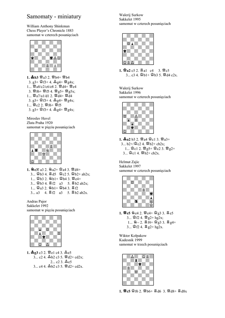 Samomaty - miniatury William Anthony Shinkman Chess Player’s Chronicle 1883 samomat w czterech posunięciach )........*! 0 , , , ,]! 0, , , , ]! 0 R , , ,]! 0, , , , ]! 0x, , McL]! 0, , , , ]! 0 , ,s,q,]! 0, , , , ]! \````````^! 1. ch3 ra3 2. rb4+ rb4 3. g3+ lf3+ 4. cg4+ rg4x; 1... ra8/c2/c6/e8 2. rd4+ re4 3. rf6+ rf5 4. rg5+ rg5x; 1... ra7/a1/d1 2. rd4+ rd4 3. g3+ lf3+ 4. cg4+ rg4x; 1... rc2 2. rf6+ rf5 3. g3+ lf3+ 4. cg4+ rg4x; Miroslav Havel Zlata Praha 1920 samomat w pięciu posunięciach )........*! 0 , , , ,]! 0, , , , ]! 0 , , , ,]! 0, , ,s, ]! 0pM ,i, ,]! 0, ,r, , ]! 0 , , , ,]! 0L , , , ]! \````````^! 1. ic3! a3 2. ia2+ la4 3. rd4+ 3... lb3 4. sd5 lc2 5. lb2+ ab2x; 1... lb3 2. ib1+ lb4 3. re4+ 3... lb3 4. sf2 a3 5. sb2 ab2x; 1... la3 2. ib1+ lb4 3. sf2 3... a3 4. sf2 a3 5. sb2 ab2x. Andras Pajor Sakkelet 1992 samomat w pięciu posunięciach )........*! 0 , , , ,]! 0, , , , ]! 0 , , , ,]! 0, P R , ]! 0 ,p, , S]! 0, ,m, , ]! 0 , , , ,]! 0, L C , ]! \````````^! 1. cg3 c3 2. re1 c4 3. ce5 3... c2 4. cb2 c3 5. rd2+ cd2x; 2... c2 3. ce5 3... c4 4. cb2 c3 5. rd2+ cd2x. Walerij Surkow Sakkelet 1995 samomat w czterech posunięciach )........*! 0 , , , ,]! 0, , , , ]! 0 Rp, , ,]! 0, , , , ]! 0m, , , ,]! 0, , , , ]! 0 , , , ,]! 0LsC , , ]! \````````^! 1. la2 c5 2. sa1 c4 3. rc5 3... c3 4. lb1+ lb3 5. rd4 c2x. Walerij Surkow Sakkelet 1996 samomat w czterech posunięciach )........*! 0 , , , ,]! 0, , , , ]! 0 , , , ,]! 0R ,c, , ]! 0 P S , ,]! 0, P , , ]! 0 ,m, , ,]! 0L , , , ]! \````````^! 1. ca2 b3 2. ra4 lc1 3. ra3+ 3... b2+/lc2 4. rb2+ cb2x; 1... lc1 2. rg5+ lc2 3. rg2+ 3... lc1 4. rb2+ cb2x. Helmut Zajic Sakkelet 1997 samomat w czterech posunięciach )........*! 0 , , , ,]! 0, R , , ]! 0 , , , ,]! 0, , ,s, ]! 0 , , , M]! 0, , , ,p]! 0 , K , I]! 0, , , ,l]! \````````^! 1. re5 ie4 2. re4+ lg3 3. se5 3... lf2 4. rg2+ hg2x; 1... i~ 2. sf4+ lg3 3. sg4+ 3... lf2 4. sg2+ hg2x. Wiktor Kołpakow Kudesnik 1999 samomat w trzech posunięciach )........*! 0 ,c, Ls,]! 0, ,u, , ]! 0 , ,m, ,]! 0,s, , , ]! 0 , R , ,]! 0, , , , ]! 0 , , , ,]! 0, , , , ]! \````````^! 1. rc5 lf6 2. rb6+ sd6 3. rd8+ sd8x