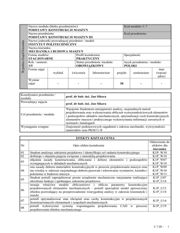 Wypełnia Zespół Kierunku Nazwa modułu (bloku przedmiotów): PODSTAWY KONSTRUKCJI MASZYN Nazwa przedmiotu: PODSTAWY KONSTRUKCJI MASZYN III Nazwa jednostki prowadzącej przedmiot / moduł: INSTYTUT POLITECHNICZNY Nazwa kierunku: MECHANIKA I BUDOWA MASZYN Forma studiów: Profil kształcenia: STACJONARNE PRAKTYCZNY Rok / semestr: Status przedmiotu /modułu: 3/5 OBOWIĄZKOWY Forma zajęć wykład ćwiczenia laboratorium Wymiar zajęć Koordynator przedmiotu / modułu Prowadzący zajęcia Cel przedmiotu / modułu Wymagania wstępne - - - Kod modułu: C.7 Kod przedmiotu: Specjalność: Język przedmiotu / modułu: POLSKI inne projekt seminarium (wpisać jakie) 30 - - prof. dr hab. inż. Jan Sikora prof. dr hab. inż. Jan Sikora Wpojenie Studentom umiejętności analizy, racjonalnych metod projektowania oraz wykonywania obliczeń wytrzymałościowych elementów i podzespołów układów mechanicznych, optymalizacji cech konstrukcyjnych elementów maszyn i praktycznego wykorzystania informacji zawartych w normach i katalogach Znajomość podstawowych zagadnień z zakresu mechaniki, wytrzymałości materiałów oraz PKM I i II EFEKTY KSZTAŁCENIA Nr Opis efektu kształcenia 01 02 Student analizuje założenia projektowe i identyfikuje cel zadania konstrukcyjnego definiuje i objaśnia pojęcia związane z metodyką projektowania objaśnia zasady konstruowania, obliczania i doboru elementów i podzespołów występujących w układach mechanicznych zna zasady doboru materiałów konstrukcyjnych w procesie projektowania maszyn oraz ma wiedzę w zakresie racjonalnego doboru pasowań i tolerowania wymiarów, kształtu i położenia w budowie maszyn Student potrafi zaprojektować proste urządzenie mechaniczne stacjonarne realizujące określona funkcje i spełniające założenia projektowe. stosuje właściwe modele obliczeniowe i oblicza parametry konstrukcyjne projektowanych elementów mechanicznych – potrafi sporządzić model uproszczony obiektu pozwalający na przeprowadzenie wiarygodnej analizy w zakresie kinematyki i statyki potrafi optymalizować stan obciążeń oraz cechy konstrukcyjne w projektowanych (konstruowanych) elementach i zespołach mechanicznych potrafi wykorzystać systemy wspomagania projektowania CAD w procesie projektowania obiektu mechanicznego 03 04 05 06 07 08 Odniesienie do efektów dla kierunku K1P_W10 K1P_W10 K1P_W07 K1P_W10 K1P_W09 K1P_W10 K1P_W13 K1P_U07 K1P_U14 K1P_U12 K1P_U14 K1P_U14 K1P_U19 C.7.III - 1 09 potrafi korzystać z informacji zawartych w normach w celu skonstruowania lub doboru elementów układu mechanicznego w taki sposób, aby w połączeniu z właściwym doborem materiałów konstrukcyjnych i dostępnych metod wytwarzania zapewnić wymaganą wytrzymałość, niezawodność i trwałość projektowanego obiektu K1P_U13 K1P_U14 K1P_U20 TREŚCI PROGRAMOWE Projekt Projekt prostego urządzenia mechanicznego o znanej funkcji i charakterystyce eksploatacyjnej - opracowanie koncepcyjne, sprecyzowanie kryteriów oceny, wybór optymalnej koncepcji na podstawie kryteriów i zasad konstrukcji, wykonanie stosownych obliczeń konstrukcyjnych przy użyciu CAD, wykonaniu rysunku złożeniowego oraz rysunków wykonawczych wskazanych elementów przy użyciu edytora graficznego AutoCAD, opis obsługi i montażu urządzenia.. Projekt (dokumentacja konstrukcyjnej) przekładni zębatej walcowej o znanym schemacie kinematycznym i charakterystyce obciążenia, wykonanie stosownych obliczeń konstrukcyjnych przy użyciu CAD, optymalizacja i dobór cech konstrukcyjnych kół zębatych, wałków i łożysk oraz korpusu przekładni, wykonaniu rysunku złożeniowego oraz rysunków wykonawczych wskazanych elementów przy użyciu edytora graficznego AutoCAD. Literatura podstawowa Literatura uzupełniająca Metody kształcenia Wykład z Podstaw Konstrukcji Maszyn z ćwiczeniami rachunkowymi. Praca zespołowa. Zbiór skryptów wyd. Politechnik Gdańskiej (druk. w latach 1993-2007) Podstawy Konstrukcji Maszyn (pod red. prof. Marka Dietrycha), t. I – IV, PWN, Warszawa 1989-2000. L.W. Kurmaz, O.L. Kurmaz: Projektowanie węzłów i części maszyn. Wyd. Polit. Świętokrzyskiej, Kielce 2003. Z. Osiński, W. Bajon, T. Szucki : Podstawy Konstrukcji Maszyn. PWN, Warszawa 1986. Monografie z serii: Podstawy Konstrukcji Maszyn, PWN, Warszawa J. Szala. Napędy mechaniczne. Wyd. ATR w Bydgoszczy. Ćwiczenia projektowe obejmujące kolejne etapy procesu konstruowania urządzenia mechanicznego(sformułowanie zadania, opracowanie koncepcyjne, dobór i analiza kryteriów, wybór optymalnej koncepcji, konstruowanie szczegółowe – dobór cech konstrukcyjnych obiektu, dokumentacja techniczna projektu wstępnego) dla dwóch zadań projektowych o różnych założeniach wstępnych sprecyzowanych w treściach programowych przedmiotu Nr efektu Metody weryfikacji efektów kształcenia kształcenia 1. Na każdych zajęciach Student przedstawia kolejne etapy rozwiązania zadania 01,02,03,04,05,0 konstrukcyjnego uzyskując stosowną ocenę punktowa według uznania prowadzącego 6,07,08,09, 2. Student ustnie prezentuje przed prowadzącym swoje rozwiązanie i odpowiada na 01,02,03,04,05,0 pytania dotyczące przesłanek stanowiących podstawę podejmowanych decyzji 6 konstrukcyjnych 3. Na koniec okresu przewidzianego dla realizacji projektu Student przedstawia projekt 05,06,07,08,09, wstępny projektowanego urządzenia i dokonuje jego obrony w dyskusji z prowadzącym zajęcia Forma i warunki Podstawą zaliczenia projektowania jest systematyczny, aktywny udział w zajęciach zaliczenia i zdobywanie punktów za kolejno wykonywane zadania oraz cały projekt. Konieczne jest uzyskanie oceny pozytywnej z każdego z realizowanych projektów - wynik końcowy jest średnią z obu ocen. C.7.III - 2 NAKŁAD PRACY STUDENTA Liczba godzin Udział w wykładach Samodzielne studiowanie tematyki wykładów Udział w ćwiczeniach audytoryjnych, laboratoryjnych, projektowych i seminariach Samodzielne przygotowywanie się do