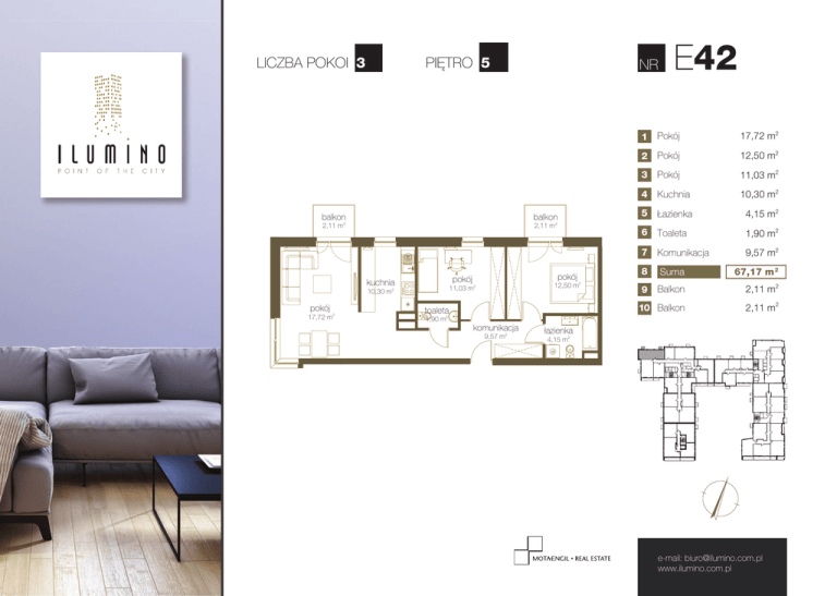 LICZBA POKOI 3 PIĘTRO 5 balkon 2,11 m NR balkon 2 2,11 m ZM kuchnia 2 17,72 m toaleta 1,90 m Pokój 17,72 m2 2 Pokój 12,50 m2 3 Pokój 11,03 m2 4 Kuchnia 10,30 m2 5 Łazienka 4,15 m2 6 Toaleta 1,90 m2 7 Komunikacja 9,57 m2 8 Suma 67,17 m 2 9 Balkon 2,11 m2 10 Balkon 2,11 m2 2 komunikacja 9,57 m2 łazienka 4,15 m2 P pokój 12,50 m2 11,03 m2 10,30 m2 1 2 pokój pokój E42 e-mail: [email protected] www.ilumino.com.pl