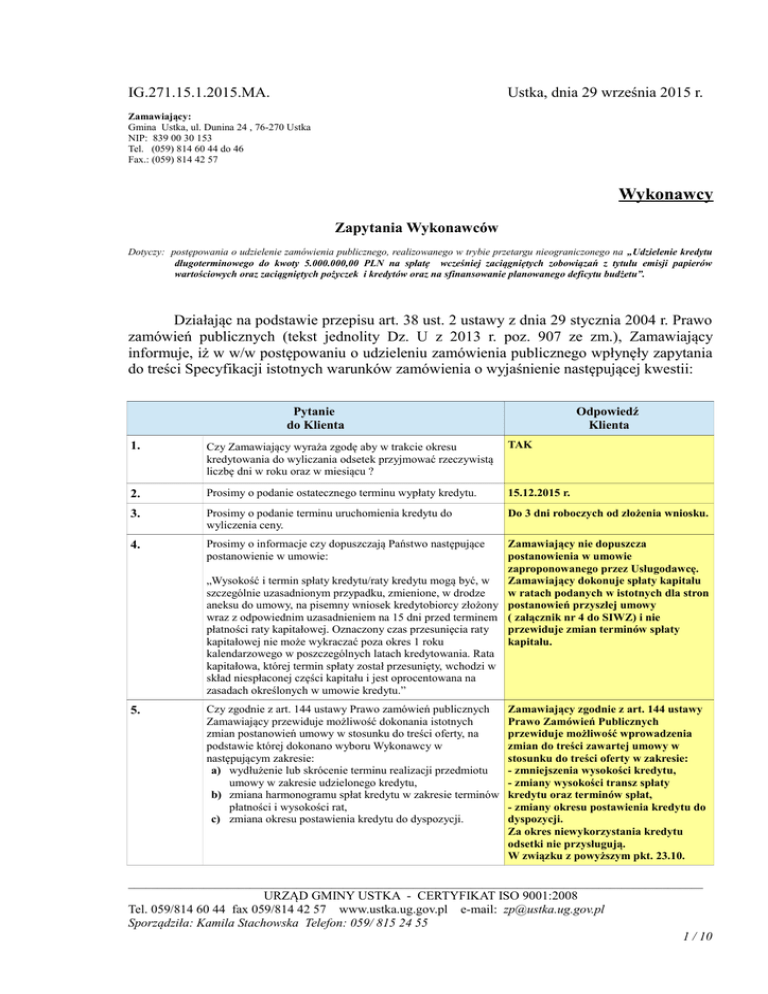 IG.271.15.1.2015.MA. Ustka, dnia 29 września 2015 r. Zamawiający: Gmina Ustka, ul. Dunina 24 , 76-270 Ustka NIP: 839 00 30 153 Tel. (059) 814 60 44 do 46 Fax.: (059) 814 42 57 Wykonawcy Zapytania Wykonawców Dotyczy: postępowania o udzielenie zamówienia publicznego, realizowanego w trybie przetargu nieograniczonego na „Udzielenie kredytu długoterminowego do kwoty 5.000.000,00 PLN na spłatę wcześniej zaciągniętych zobowiązań z tytułu emisji papierów wartościowych oraz zaciągniętych pożyczek i kredytów oraz na sfinansowanie planowanego deficytu budżetu”. Działając na podstawie przepisu art. 38 ust. 2 ustawy z dnia 29 stycznia 2004 r. Prawo zamówień publicznych (tekst jednolity Dz. U z 2013 r. poz. 907 ze zm.), Zamawiający informuje, iż w w/w postępowaniu o udzieleniu zamówienia publicznego wpłynęły zapytania do treści Specyfikacji istotnych warunków zamówienia o wyjaśnienie następującej kwestii: Pytanie do Klienta Odpowiedź Klienta 1. Czy Zamawiający wyraża zgodę aby w trakcie okresu kredytowania do wyliczania odsetek przyjmować rzeczywistą liczbę dni w roku oraz w miesiącu ? TAK 2. Prosimy o podanie ostatecznego terminu wypłaty kredytu. 15.12.2015 r. 3. Prosimy o podanie terminu uruchomienia kredytu do wyliczenia ceny. Do 3 dni roboczych od złożenia wniosku. 4. Prosimy o informacje czy dopuszczają Państwo następujące postanowienie w umowie: 5. Czy zgodnie z art. 144 ustawy Prawo zamówień publicznych Zamawiający przewiduje możliwość dokonania istotnych zmian postanowień umowy w stosunku do treści oferty, na podstawie której dokonano wyboru Wykonawcy w następującym zakresie: a) wydłużenie lub skrócenie terminu realizacji przedmiotu umowy w zakresie udzielonego kredytu, b) zmiana harmonogramu spłat kredytu w zakresie terminów płatności i wysokości rat, c) zmiana okresu postawienia kredytu do dyspozycji. Zamawiający nie dopuszcza postanowienia w umowie zaproponowanego przez Usługodawcę. „Wysokość i termin spłaty kredytu/raty kredytu mogą być, w Zamawiający dokonuje spłaty kapitału szczególnie uzasadnionym przypadku, zmienione, w drodze w ratach podanych w istotnych dla stron aneksu do umowy, na pisemny wniosek kredytobiorcy złożony postanowień przyszłej umowy wraz z odpowiednim uzasadnieniem na 15 dni przed terminem ( załącznik nr 4 do SIWZ) i nie płatności raty kapitałowej. Oznaczony czas przesunięcia raty przewiduje zmian terminów spłaty kapitałowej nie może wykraczać poza okres 1 roku kapitału. kalendarzowego w poszczególnych latach kredytowania. Rata kapitałowa, której termin spłaty został przesunięty, wchodzi w skład niespłaconej części kapitału i jest oprocentowana na zasadach określonych w umowie kredytu.” Zamawiający zgodnie z art. 144 ustawy Prawo Zamówień Publicznych przewiduje możliwość wprowadzenia zmian do treści zawartej umowy w stosunku do treści oferty w zakresie: - zmniejszenia wysokości kredytu, - zmiany wysokości transz spłaty kredytu oraz terminów spłat, - zmiany okresu postawienia kredytu do dyspozycji. Za okres niewykorzystania kredytu odsetki nie przysługują. W związku z powyższym pkt. 23.10. ___________________________________________________________________________________________________ URZĄD GMINY USTKA - CERTYFIKAT ISO 9001:2008 Tel. 059/814 60 44 fax 059/814 42 57 www.ustka.ug.gov.pl e-mail: [email protected] Sporządziła: Kamila Stachowska Telefon: 059/ 815 24 55 1 / 10 SIWZ otrzymuje nowe brzmienie. 6. Czy zmiana postanowień umowy kredytowej będzie możliwa w przypadku wystąpienia istotnej zmiany warunków finansowych Zamawiającego, w szczególności w wypadku: a) zmiany powszechnie obowiązujących przepisów prawa mającej wpływ na realizację zamówienia, b) pogorszenia sytuacji ekonomiczno- finansowej Zamawiającego powodującego zagrożenie dla terminowej spłaty kredytu lub spełnienia przez Zamawiającego warunków określonych ustawą o finansach publicznych, c) zmiany okresu realizacji inwestycji, d) zmiany rzeczowego lub finansowego harmonogramu realizacji inwestycji. Zamawiający nie przewiduje zmian postanowień umowy kredytowej w przypadku wystąpienia istotnej zmiany warunków finansowych. 7. Czy warunki wprowadzenia zmian do umowy będą następujące: a)zmiana może być inicjowana na wniosek złożony wraz z uzasadnieniem oraz wskazaniem podstawy prawnej i umownej, b)zmiana musi uzyskać aprobatę obu stron umowy, c)zmiana musi być wprowadzona w formie pisemnej pod rygorem nieważności, d)zmiana nie może spowodować wykroczenia usługi poza określenie przedmiotu zamówienia zawarte w specyfikacji istotnych warunków zamówienia. Zgodnie z pkt. 23.11. SIWZ „każda zmiana umowy musi być dokonana na piśmie w formie aneksu pod rygorem nieważności oraz wymaga zgody drugiej strony”. 8. W przypadku inwestycji przewidzianej/-ych do finansowania wnioskowanym kredytem / emisją obligacji / inną ekspozycją kredytową oraz finansowanej / -ych dotacją /–ami z UE, prosimy o informację, czy założone dofinansowanie z UE wynika z zawartej umowy. a) Jeżeli tak - prosimy o podanie łącznej kwoty, na jaką zostały zawarte umowy o dofinansowanie inwestycji będących przedmiotem SIWZu, b) Jeżeli nie - prosimy o informację, czy w przypadku braku dotacji inwestycja będzie realizowana i z jakich źródeł. Założone dofinansowanie z UE wynika z zawartej umowy na łączna kwotę 32.695.944,49 zł. 9. Czy Zamawiający wyraża zgodę na sfinansowanie części kredytu, tj. kredytu przeznaczonego na sfinansowanie planowanego deficytu budżetu, ze środków przekazanych naszemu Bankowi przez Europejski Bank Inwestycyjny? Bank motywuje swoją prośbę możliwością zaoferowania preferencyjnych warunków cenowych dla kredytu udzielonego ze środków Międzynarodowej Instytucji Finansowej. Należy zaznaczyć, że Państwa zgoda leży w interesie publicznym, bowiem przyczynia się do obniżenia marży kredytow