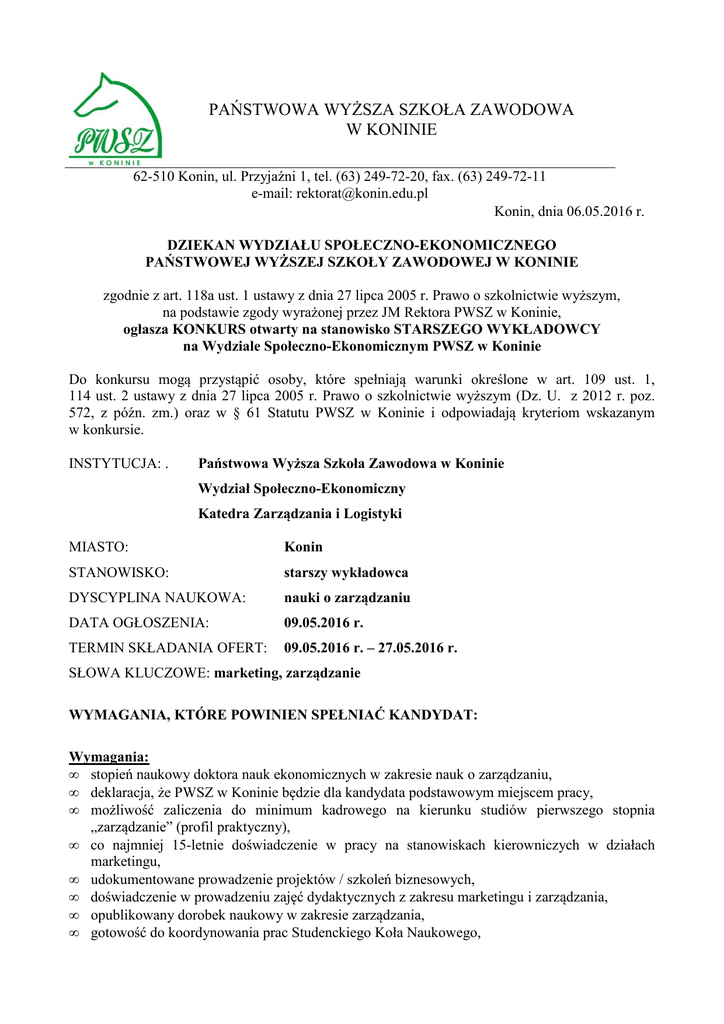 PAŃSTWOWA WYŻSZA SZKOŁA ZAWODOWA W KONINIE 62-510 Konin, ul. Przyjaźni 1, tel. (63) 249-72-20, fax. (63) 249-72-11 e-mail: [email protected] Konin, dnia 06.05.2016 r. DZIEKAN WYDZIAŁU SPOŁECZNO-EKONOMICZNEGO PAŃSTWOWEJ WYŻSZEJ SZKOŁY ZAWODOWEJ W KONINIE zgodnie z art. 118a ust. 1 ustawy z dnia 27 lipca 2005 r. Prawo o szkolnictwie wyższym, na podstawie zgody wyrażonej przez JM Rektora PWSZ w Koninie, ogłasza KONKURS otwarty na stanowisko STARSZEGO WYKŁADOWCY na Wydziale Społeczno-Ekonomicznym PWSZ w Koninie Do konkursu mogą przystąpić osoby, które spełniają warunki określone w art. 109 ust. 1, 114 ust. 2 ustawy z dnia 27 lipca 2005 r. Prawo o szkolnictwie wyższym (Dz. U. z 2012 r. poz. 572, z późn. zm.) oraz w § 61 Statutu PWSZ w Koninie i odpowiadają kryteriom wskazanym w konkursie. INSTYTUCJA: . Państwowa Wyższa Szkoła Zawodowa w Koninie Wydział Społeczno-Ekonomiczny Katedra Zarządzania i Logistyki MIASTO: Konin STANOWISKO: starszy wykładowca DYSCYPLINA NAUKOWA: nauki o zarządzaniu DATA OGŁOSZENIA: 09.05.2016 r. TERMIN SKŁADANIA OFERT: 09.05.2016 r. – 27.05.2016 r. SŁOWA KLUCZOWE: marketing, zarządzanie WYMAGANIA, KTÓRE POWINIEN SPEŁNIAĆ KANDYDAT: Wymagania: • stopień naukowy doktora nauk ekonomicznych w zakresie nauk o zarządzaniu, • deklaracja, że PWSZ w Koninie będzie dla kandydata podstawowym miejscem pracy, • możliwość zaliczenia do minimum kadrowego na kierunku studiów pierwszego stopnia „zarządzanie” (profil praktyczny), • co najmniej 15-letnie doświadczenie w pracy na stanowiskach kierowniczych w działach marketingu, • udokumentowane prowadzenie projektów / szkoleń biznesowych, • doświadczenie w prowadzeniu zajęć dydaktycznych z zakresu marketingu i zarządzania, • opublikowany dorobek naukowy w zakresie zarządzania, • gotowość do koordynowania prac Studenckiego Koła Naukowego, • • • dyspozycyjność (obecność minimum trzy dni w tygodniu w PWSZ w Koninie), znajomość języka angielskiego w stopniu komunikatywnym umożliwiającym prowadzenie zajęć dydaktycznych, znajomość języka polskiego w mowie i piśmie na poziomie umożliwiającym pracę dydaktyczną. Dokumenty wymagane od kandydata: 1. 2. 3. 4. list motywacyjny lub wniosek o zatrudnienie; CV; kwestionariusz osobowy dla osoby ubiegającej się o zatrudnienie (formularz do pobrania); odpis dyplomu oraz inne dokumenty potwierdzające posiadane kwalifikacje i spełnienie wymagań określonych w przepisach powszechnie obowiązujących oraz wymagań dodatkowych, określonych w statucie PWSZ w Koninie, oraz zawierające dane o uprzednim zatrudnieniu; 5. kserokopie zaświadczeń, certyfikatów o ukończonych kursach i doskonaleniu zawodowym; 6. informacja o osiągnięciach naukowych, dydaktycznych i organizacyjnych z wykazem publikacji; 7. oświadczenie o posiadaniu pełnej zdolności do czynności prawnych; 8. oświadczenie o korzystaniu z pełni praw publicznych; 9. oświadczenie o niekaralności karą dyscyplinarną pozbawienia prawa do wykonywania zawodu nauczyciela akademickiego na stałe lub na czas określony; 10. oświadczenie, o którym mowa w art. 112a ust. 1 ustawy – Prawo o szkolnictwie wyższym, upoważniające do zaliczenia do minimum kadrowego z dniem zatrudnienia na stanowisku nauczyciela akademickiego (formularz do pobrania); 11. oświadczenie kandydata o wyrażeniu zgody na przetwarzanie danych osobowych w związku z prowadzonym postępowaniem konkursowym. Zgłoszenia należy nadsyłać w jednej z dwóch form: e-mailowo (forma preferowana) – skan dokumentów lub pliki w formacie pdf na adres: [email protected] (temat: konkurs) lub pocztą na adres: Państwowa Wyższa Szkoła Zawodowa w Koninie Sekretariat Wydziału Społeczno-Ekonomicznego adres: 62-510 Konin, ul. Przyjaźni 1. Uczelnia nie zwraca kosztów poniesionych przez uczestników konkursu, związanych z całością procesu uczestnictwa w konkursie.