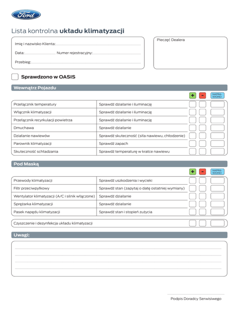 Lista kontrolna układu klimatyzacji Imię i nazwisko Klienta:............................................................................................................................................................................................................................... Pieczęć Dealera Data:.................................................................................. Numer rejestracyjny:.............................................................................................................................. Przebieg:............................................................................................................................................................................................................................................................................................... Sprawdzono w OASIS Wewnątrz Pojazdu Przełącznik temperatury Sprawdź działanie i iluminację Włącznik klimatyzacji Sprawdź działanie i iluminację Przełącznik recyrkulacji powietrza Sprawdź działanie i iluminację Dmuchawa Sprawdź działanie Działanie nawiewów Sprawdź skuteczność (siła nawiewu, chłodzenie) Parownik klimatyzacji Sprawdź zapach Skuteczność schładzania Sprawdź temperaturę w kratce nawiewu + - NAPRAWIONO + - NAPRAWIONO Pod Maską Przewody klimatyzacji Sprawdź uszkodzenia i wycieki Filtr przeciwpyłkowy Sprawdź stan (zapytaj o datę ostatniej wymiany) Wentylator klimatyzacji (A/C i silnik włączone) Sprawdź działanie Sprężarka klimatyzacji Sprawdź działanie Pasek napędu klimatyzacji Sprawdź stan i stopień zużycia Czyszczenie i dezynfekcja układu klimatyzacji Uwagi: ........................................................................................................................................................................................................................................................................................................................................................................................................................................................................................................................................................... ........................................................................................................................................................................................................................................................................................................................................................................................................................................................................................................................................................... ........................................................................................................................................................................................................................................................................................................................................................................................................................................................................................................................................................... ........................................................................................................................................................................................................................................................................................................................................................................................................................................................................................................................................................... ...................................................................................................................................................... Podpis Doradcy Serwisiwego