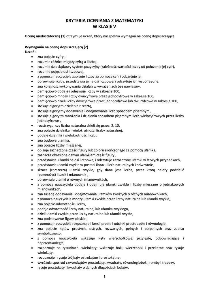 KRYTERIA OCENIANIA Z MATEMATYKI W KLASIE V Ocenę niedostateczną (1) otrzymuje uczeń, który nie spełnia wymagań na ocenę dopuszczającą. Wymagania na ocenę dopuszczającą (2) Uczeń: zna pojęcie cyfry , rozumie różnice między cyfrą a liczbą , rozumie dziesiątkowy system pozycyjny (zależność wartości liczby od położenia jej cyfr), rozumie pojęcie osi liczbowej, z pomocą nauczyciela zapisuje liczby za pomocą cyfr i odczytuje je, porównuje liczby, przedstawia je na osi liczbowej i odczytuje ich współrzędne, zna kolejność wykonywania działań w wyrażeniach bez nawiasów, pamięciowo dodaje i odejmuje liczby w zakresie 100, pamięciowo mnoży liczby dwucyfrowe przez jednocyfrowe w zakresie 100, pamięciowo dzieli liczby dwucyfrowe przez jednocyfrowe lub dwucyfrowe w zakresie 100, stosuje algorytm dzielenia z resztą, stosuje algorytmy dodawania i odejmowania liczb sposobem pisemnym , stosuje algorytm mnożenia i dzielenia sposobem pisemnym liczb wielocyfrowych przez liczby jednocyfrowe , rozstrzyga, czy liczba naturalna dzieli się przez: 2, 10, zna pojęcie dzielnika i wielokrotności liczby naturalnej, podaje dzielniki i wielokrotności liczb , zna budowę ułamka, zna pojęcie liczby mieszanej, opisuje zaznaczone części figury lub zbioru skończonego za pomocą ułamka, zaznacza określoną danym ułamkiem część figury , przedstawia ułamki na osi liczbowej i odczytuje zaznaczone ułamki w łatwych przypadkach, przedstawia ułamki zwykłe w postaci ilorazu liczb naturalnych i odwrotnie, skraca (rozszerza) ułamki zwykłe, gdy dana jest liczba, przez którą należy podzielić (pomnożyć) licznik i mianownik , porównuje ułamki o równych mianownikach, z pomocą nauczyciela dodaje i odejmuje ułamki zwykłe i liczby mieszane o jednakowych mianownikach, zna zasadę dodawania i odejmowania ułamków zwykłych o różnych mianownikach, z pomocą nauczyciela mnoży ułamki zwykłe przez liczby naturalne lub ułamki zwykłe, zna pojęcie odwrotności liczby, podaje odwrotność liczby naturalnej lub ułamka zwykłego, dzieli ułamki zwykłe przez liczby naturalne lub ułamki zwykłe, zna podstawowe figury płaskie , z pomocą nauczyciela rozpoznaje i kreśli proste i odcinki prostopadłe i równoległe, zna pojęcie kątów prostych, ostrych, rozwartych, pełnych i półpełnych oraz zapisu symbolicznego, z pomocą nauczyciela wskazuje kąty wierzchołkowe, przyległe, odpowiadające i naprzemianległe, rozpoznaje na rysunkach. wielokąty; wskazuje boki, wierzchołki i przekątne oraz rysuje wielokąty, rozpoznaje i rysuje trójkąty ostrokątne i prostokątne, wyróżnia spośród czworokątów prostokąty, kwadraty, równoległoboki, romby i trapezy, rysuje prostokąty i kwadraty o danych długościach boków, 1 z pomocą nauczyciela oblicza obwody trójkątów, prostokątów, kwadratów i innych czworokątów, stosuje w zadaniach twierdzenia o sumie miar kątów trójkąta, gdy dane są miary dwóch pozostałych kątów, wskazuje figury przystające, zna pojęcie jednostek: monetarnych, masy, długości, rozumie algorytmy czterech podstawowych działań (pamięciowych i pisemnych) na ułamkach dziesiętnych, z pomocą nauczyciela dodaje i odejmuje sposobem pisemnym ułamki dziesiętne o tej samej liczbie cyfr po przecinku, z pomocą nauczyciela mnoży i dzieli ułamki dziesiętne przez 10, 100, 1000, ..., stosuje algorytm mnożenia i dzielenia ułamków dziesiętnych sposobem pisemnym przez liczbę naturalną, zna pojęcie liczby ujemnej i pojęcie liczb przeciwnych, porównuje liczby całkowite dodatnie i dodatnią z ujemną, z pomocą nauczyciela zaznacza liczby całkowite ujemne na osi liczbowej, podaje przykłady zastosowania liczb ujemnych w życiu codziennym, podaje liczby przeciwne do danych, z pomocą nauczyciela dodaje liczby o jednakowych znakach, może korzystać z osi liczbowej przy dodawaniu, z pomocą nauczyciela odejmuje liczby całkowite korzystając z osi, zna pojęcie miary pola jako liczby kwadratów jednostkowych, mierzy pola figur kwadratami lub trójkątami jednostkowymi, z pomocą nauczyciela oblicza pola prostokątów i kwadratów, zna jednostki miary pola, zna pojęcie prostopadłościanu i sześcianu, wskazuje na modelu prostopadłościanu lub graniastosłupa prostego: ściany, podstawę oraz krawędzie równoległe i prostopadle, kreśli siatki prostopadłościanów i sześcianów , z pomocą nauczyciela oblicza pola powierzchni sześcianów , zna pojęcie objętości figury i jednostki objętości , z pomocą nauczyciela oblicza objętość brył za pomocą liczby sześcianów jednostkowych, zna wzór na obliczanie objętości sześcianu i prostopadłościanu, z pomocą nauczyciela oblicza objętość sześcianu. Wymagania na ocenę dostateczną (3) obejmują wymagania na ocenę dopuszczającą oraz dodatkowe wymienione poniżej. Uczeń: zna kolejność wykonywania działań, gdy występują nawiasy, zna pojęcie kwadratu i sześcianu liczby, zapisuje liczby wielocyfrowe w dziesiątkowym systemie pozycyjnym, przedstawia liczby spełniające określone warunki na osi liczbowej i odczytuje ich współrzędne, dopełnia składniki do danej sumy; oblicza odjemną (odjemnik), gdy są dane różnica i odjemnik (odjemna), oblicza dzielną (dzielnik), gdy dane są iloraz i dzielnik (dzielna), stosuje algorytmy dodawania i odejmowania liczb sposobem pisemnym , oblicza kwadraty i sześciany liczb, stosuje algorytm mnożenia sposobem pisemnym przez liczby wielocyfrowe lub wielokrotności liczby 100, stosuje algorytm dzielenia sposobem pisemnym liczb wielocyfrowych przez liczby wielocyfrowe (z zerami na końcu), 2 rozwiązuje zadania tekstowe jednodziałaniowe, zna pojęcie liczby pierwszej i złożonej i sposób rozkładu liczby na czynniki pierwsze, rozstrzyga, czy liczba naturalna dzieli się przez: 3, 4, 5, 9, 25 i 100, wyróżnia liczby pierwsze i złożone, rozkłada liczby dwucyfrowe na czynniki pierwsze, rozumie pojęcie NWD i NW