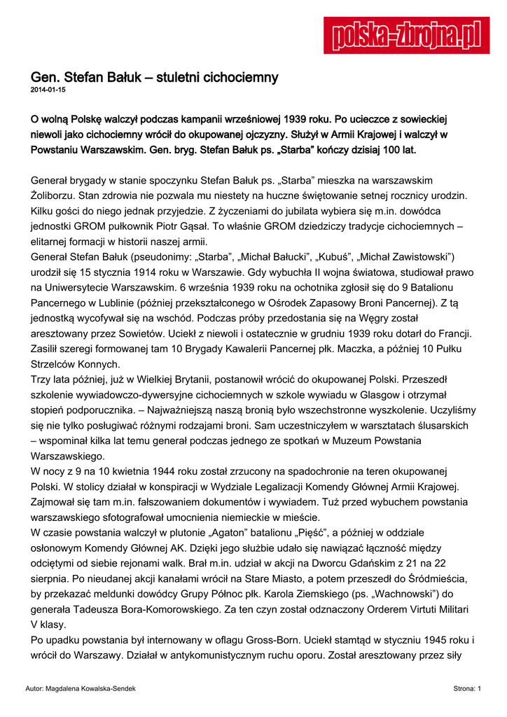 Gen. Stefan Bałuk – stuletni cichociemny 2014-01-15 O wolną Polskę walczył podczas kampanii wrześniowej 1939 roku. Po ucieczce z sowieckiej niewoli jako cichociemny wrócił do okupowanej ojczyzny. Służył w Armii Krajowej i walczył w Powstaniu Warszawskim. Gen. bryg. Stefan Bałuk ps. „Starba” kończy dzisiaj 100 lat. Generał brygady w stanie spoczynku Stefan Bałuk ps. „Starba” mieszka na warszawskim Żoliborzu. Stan zdrowia nie pozwala mu niestety na huczne świętowanie setnej rocznicy urodzin. Kilku gości do niego jednak przyjedzie. Z życzeniami do jubilata wybiera się m.in. dowódca jednostki GROM pułkownik Piotr Gąsał. To właśnie GROM dziedziczy tradycje cichociemnych – elitarnej formacji w historii naszej armii. Generał Stefan Bałuk (pseudonimy: „Starba”, „Michał Bałucki”, „Kubuś”, „Michał Zawistowski”) urodził się 15 stycznia 1914 roku w Warszawie. Gdy wybuchła II wojna światowa, studiował prawo na Uniwersytecie Warszawskim. 6 września 1939 roku na ochotnika zgłosił się do 9 Batalionu Pancernego w Lublinie (później przekształconego w Ośrodek Zapasowy Broni Pancernej). Z tą jednostką wycofywał się na wschód. Podczas próby przedostania się na Węgry został aresztowany przez Sowietów. Uciekł z niewoli i ostatecznie w grudniu 1939 roku dotarł do Francji. Zasilił szeregi formowanej tam 10 Brygady Kawalerii Pancernej płk. Maczka, a później 10 Pułku Strzelców Konnych. Trzy lata później, już w Wielkiej Brytanii, postanowił wrócić do okupowanej Polski. Przeszedł szkolenie wywiadowczo-dywersyjne cichociemnych w szkole wywiadu w Glasgow i otrzymał stopień podporucznika. – Najważniejszą naszą bronią było wszechstronne wyszkolenie. Uczyliśmy się nie tylko posługiwać różnymi rodzajami broni. Sam uczestniczyłem w warsztatach ślusarskich – wspominał kilka lat temu generał podczas jednego ze spotkań w Muzeum Powstania Warszawskiego. W nocy z 9 na 10 kwietnia 1944 roku został zrzucony na spadochronie na teren okupowanej Polski. W stolicy działał w konspiracji w Wydziale Legalizacji Komendy Głównej Armii Krajowej. Zajmował się tam m.in. fałszowaniem dokumentów i wywiadem. Tuż przed wybuchem powstania warszawskiego sfotografował umocnienia niemieckie w mieście. W czasie powstania walczył w plutonie „Agaton” batalionu „Pięść”, a później w oddziale osłonowym Komendy Głównej AK. Dzięki jego służbie udało się nawiązać łączność między odciętymi od siebie rejonami walk. Brał m.in. udział w akcji na Dworcu Gdańskim z 21 na 22 sierpnia. Po nieudanej akcji kanałami wrócił na Stare Miasto, a potem przeszedł do Śródmieścia, by przekazać meldunki dowódcy Grupy Północ płk. Karola Ziemskiego (ps. „Wachnowski”) do generała Tadeusza Bora-Komorowskiego. Za ten czyn został odznaczony Orderem Virtuti Militari V klasy. Po upadku powstania był internowany w oflagu Gross-Born. Uciekł stamtąd w styczniu 1945 roku i wrócił do Warszawy. Działał w antykomunistycznym ruchu oporu. Został aresztowany przez siły Autor: Magdalena Kowalska-Sendek Strona: 1 bezpieczeństwa i za służbę w AK skazany na dwa lata więzienia. W 1947 roku po ogłoszonej amnestii opuścił areszt. Przez kilka lat pracował jako taksówkarz, a później zawodowo zajął się fotografią. Od 1952 roku pracował dla Centralnej Agencji Fotograficznej. Gen. Bałuk ma na swoim koncie wiele wystaw zdjęciowych, jest też autorem albumów historycznych i krajoznawczych oraz książek, m.in.: „Wspomnienia Spadochroniarza”, ,,Byłem cichociemnym". Uważa się, że jest jednym z najlepszych powstańczych fotoreporterów, na zdjęciach dokumentował m.in. mieszkańców walczącej stolicy. Jest członkiem Związku Polskich Artystów Fotografików. W 1999 roku został awansowany do stopnia podpułkownika rezerwy, a siedem lat później do stopnia generała brygady w stanie spoczynku. Jest honorowym obywatelem Warszawy i Tuszowa Narodowego. Od 2010 roku pełni obowiązki kanclerza Kapituły Orderu Wojennego Virtuti Militari. W ubiegłym roku między innymi z jego inicjatywy w Warszawie stanął pomnik Cichociemnych. O setnych urodzinach gen. Stefana Bałuka pamiętają także pracownicy Muzeum Powstania Warszawskiego, które od kilku dni prowadzi akcję „Dziękuję za wolność”. W tramwajach i autobusach wyświetlane są spoty zachęcające do złożenia życzeń jubilatowi. O włączenie się do akcji proszą muzycy, sportowcy i artyści, m.in. medalistka olimpijska Zofia Klepacka oraz artysta plastyk Przemek Trust Truściński. Jak złożyć życzenia? Wystarczy wejść na stronę internetową muzeum (fanpage MPW >), pobrać grafikę, wydrukować, a następnie zrobić sobie z nią zdjęcie i zamieścić w sieci za pomocą specjalnej aplikacji. Z propozycji muzeum skorzystało już wiele osób, m.in. dowódca i operatorzy jednostki GROM, dziennikarze z Informacyjnej Agencji Radiowej oraz Paweł Ukielski, zastępca dyrektora Muzeum Powstania Warszawskiego. Jutro muzeum podliczy, ile osób w internecie złożyło życzenia stulatkowi. Dzisiaj po południu na ulicach Warszawy do składania życzeń zachęcać będą wolontariusze z muzeum Powstania Warszawskiego. – Od godziny 17 życzenia od mieszkańców stolicy dla legendarnego cichociemnego wyświetlane będą też na wieżowcu Marriott w Warszawie – mówi Anna Kotonowicz, rzeczniczka muzeum. Autor: Magdalena Kowalska-Sendek Strona: 2