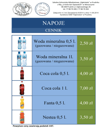 Szkolne Schronisko Młodzieżowe „Dąbrówka” w Prudniku z filią „U Króla Gór Opawskich” w Wieszczynie 48-200 Prudnik ul. Dąbrowskiego 26 tel. 77 88 70 200 / 77 88 70 204 Załącznik nr 2 do Zarządzenia 6/2014 z dnia 11.06.2014 Dyrektora SSM "Dąbrówka" w Prudniku NAPOJE CENNIK Woda mineralna 0,5 l. 2,50 zł (gazowana / niegazowana) Woda mineralna 1l. (gazowana / niegazowana) 3,50 zł Coca cola 0,5 l. 4,00 zł Coca cola 1 l. 7,00 zł Fanta 0,5 l. 4,00 zł Nestea 0,5 l. 3,50 zł Powyższe ceny zawierają podatek VAT.