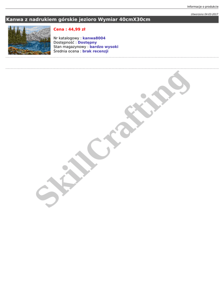 Informacje o produkcie Utworzono 04-03-2017 Kanwa z nadrukiem górskie jezioro Wymiar 40cmX30cm Cena : 44,99 zł Sk ill C ra ft in g Nr katalogowy : kanwa8004 Dostępność : Dostępny Stan magazynowy : bardzo wysoki Średnia ocena : brak recenzji
