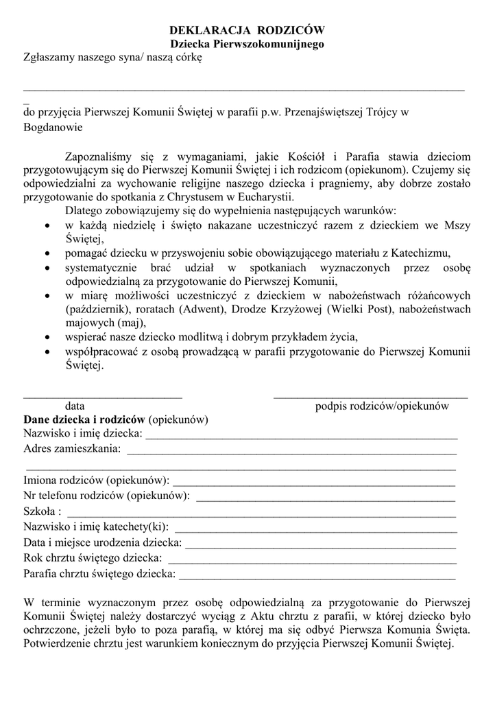 DEKLARACJA RODZICÓW Dziecka Pierwszokomunijnego Zgłaszamy naszego syna/ naszą córkę ___________________________________________________________________________ _ do przyjęcia Pierwszej Komunii Świętej w parafii p.w. Przenajświętszej Trójcy w Bogdanowie Zapoznaliśmy się z wymaganiami, jakie Kościół i Parafia stawia dzieciom przygotowującym się do Pierwszej Komunii Świętej i ich rodzicom (opiekunom). Czujemy się odpowiedzialni za wychowanie religijne naszego dziecka i pragniemy, aby dobrze zostało przygotowanie do spotkania z Chrystusem w Eucharystii. Dlatego zobowiązujemy się do wypełnienia następujących warunków: w każdą niedzielę i święto nakazane uczestniczyć razem z dzieckiem we Mszy Świętej, pomagać dziecku w przyswojeniu sobie obowiązującego materiału z Katechizmu, systematycznie brać udział w spotkaniach wyznaczonych przez osobę odpowiedzialną za przygotowanie do Pierwszej Komunii, w miarę możliwości uczestniczyć z dzieckiem w nabożeństwach różańcowych (październik), roratach (Adwent), Drodze Krzyżowej (Wielki Post), nabożeństwach majowych (maj), wspierać nasze dziecko modlitwą i dobrym przykładem życia, współpracować z osobą prowadzącą w parafii przygotowanie do Pierwszej Komunii Świętej. ___________________________ _________________________________ data podpis rodziców/opiekunów Dane dziecka i rodziców (opiekunów) Nazwisko i imię dziecka: _____________________________________________________ Adres zamieszkania: ________________________________________________________ _________________________________________________________________________ Imiona rodziców (opiekunów): ________________________________________________ Nr telefonu rodziców (opiekunów): ____________________________________________ Szkoła : __________________________________________________________________ Nazwisko i imię katechety(ki): ________________________________________________ Data i miejsce urodzenia dziecka: ______________________________________________ Rok chrztu świętego dziecka: _________________________________________________ Parafia chrztu świętego dziecka: _______________________________________________ W terminie wyznaczonym przez osobę odpowiedzialną za przygotowanie do Pierwszej Komunii Świętej należy dostarczyć wyciąg z Aktu chrztu z parafii, w której dziecko było ochrzczone, jeżeli było to poza parafią, w której ma się odbyć Pierwsza Komunia Święta. Potwierdzenie chrztu jest warunkiem koniecznym do przyjęcia Pierwszej Komunii Świętej.
