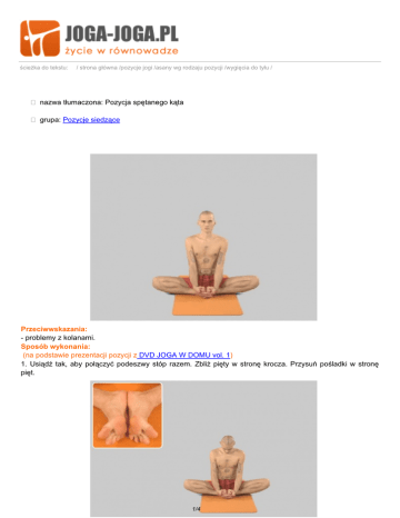 ścieżka do tekstu: / strona główna /pozycje jogi /asany wg rodzaju pozycji /wygięcia do tyłu / nazwa tłumaczona: Pozycja spętanego kąta grupa: Pozycje siedzące Przeciwwskazania: - problemy z kolanami. Sposób wykonania: (na podstawie prezentacji pozycji z DVD JOGA W DOMU vol. 1) 1. Usiądź tak, aby połączyć podeszwy stóp razem. Zbliż pięty w stronę krocza. Przysuń pośladki w stronę pięt. 1/4 2. Chwyć się dłońmi pod stopami i wyciągając stopy do góry opuszczaj kolana na dół. Dwa przeciwstawne ruchy kolana idą w dół, a osią kręgosłupa wyciągasz się do góry - wyciągasz dłońmi stopy w górę. Kolana w dół i na bok, czubek głowy do góry. Oddychaj spokojnie i staraj się zachować całkowicie wydłużony kręgosłup. Spokojne wdechy, spokojne wydechy. 3. Kolana idą na boki. Plecy zupełnie wyprostowane. Od nasady kręgosłupa do czubka głowy wyciągnięcie. Cały czas rozluźniona, miękka, spokojna twarz i zupełnie swobodny przepływ oddechu. 4. Żeby wyjść z pozycji wróć do Svastikasany (siadu skrzyżnego). 2/4 3/4 Korzyści: tonizuje nerki i narządy dołu brzucha, łagodzi zaburzenia pęcherza i macicy, zapobiega rwie kulszowej i przepuklinie. Materiał opracowany na podstawie DVD JOGA W DOMU vol. 1 << Sprawdź wybór akcesoriów do jogi >> << Zajrzyj na półkę z książkami >> data wydruku: sobota, 4 marca 2017 roku 11:23:32 adres dokumentu: http://www.joga-joga.pl//index.php?LANG=pl&page_ID=106&art_ID=158 4/4