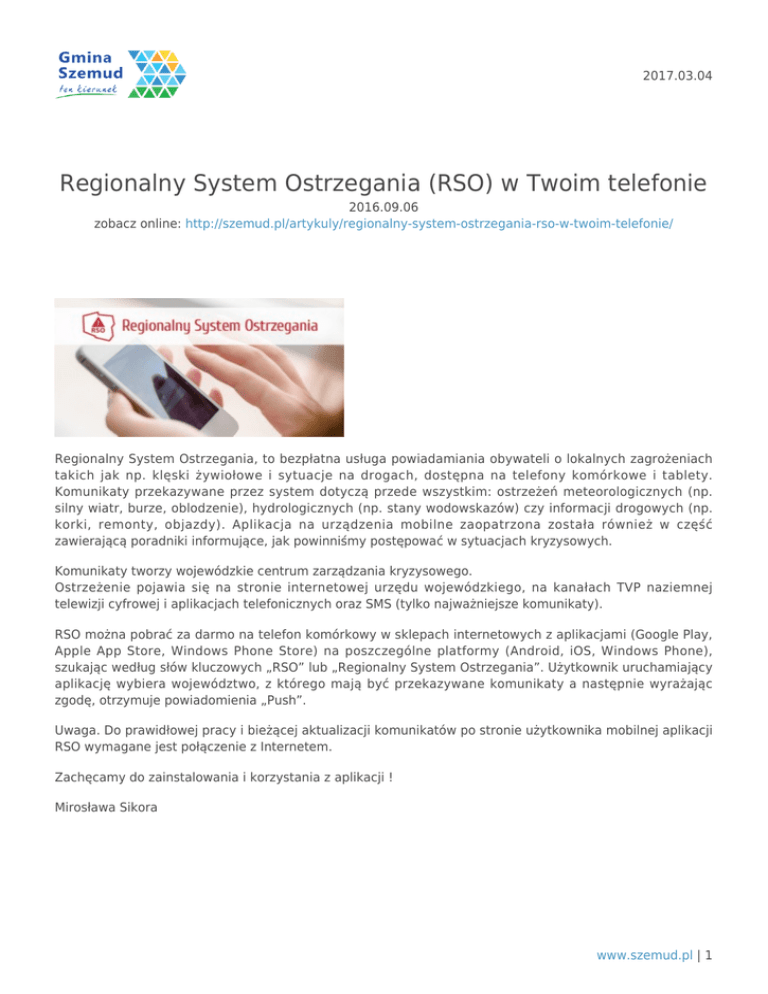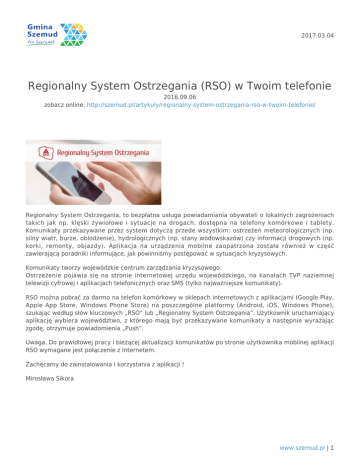 2017.03.04 Regionalny System Ostrzegania (RSO) w Twoim telefonie 2016.09.06 zobacz online: http://szemud.pl/artykuly/regionalny-system-ostrzegania-rso-w-twoim-telefonie/ Regionalny System Ostrzegania, to bezpłatna usługa powiadamiania obywateli o lokalnych zagrożeniach takich jak np. klęski żywiołowe i sytuacje na drogach, dostępna na telefony komórkowe i tablety. Komunikaty przekazywane przez system dotyczą przede wszystkim: ostrzeżeń meteorologicznych (np. silny wiatr, burze, oblodzenie), hydrologicznych (np. stany wodowskazów) czy informacji drogowych (np. korki, remonty, objazdy). Aplikacja na urządzenia mobilne zaopatrzona została również w część zawierającą poradniki informujące, jak powinniśmy postępować w sytuacjach kryzysowych. Komunikaty tworzy wojewódzkie centrum zarządzania kryzysowego. Ostrzeżenie pojawia się na stronie internetowej urzędu wojewódzkiego, na kanałach TVP naziemnej telewizji cyfrowej i aplikacjach telefonicznych oraz SMS (tylko najważniejsze komunikaty). RSO można pobrać za darmo na telefon komórkowy w sklepach internetowych z aplikacjami (Google Play, Apple App Store, Windows Phone Store) na poszczególne platformy (Android, iOS, Windows Phone), szukając według słów kluczowych „RSO” lub „Regionalny System Ostrzegania”. Użytkownik uruchamiający aplikację wybiera województwo, z którego mają być przekazywane komunikaty a następnie wyrażając zgodę, otrzymuje powiadomienia „Push”. Uwaga. Do prawidłowej pracy i bieżącej aktualizacji komunikatów po stronie użytkownika mobilnej aplikacji RSO wymagane jest połączenie z Internetem. Zachęcamy do zainstalowania i korzystania z aplikacji ! Mirosława Sikora www.szemud.pl | 1