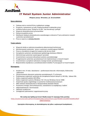 IT Retail System Junior Administrator Miejsce pracy: Wrocław, pl. Grunwaldzki Nasza obietnica: Ciekawy etat w centrali firmy o globalnym zasięgu Przyjazne, nastawione na ludzi międzynarodowe środowisko pracy Unikalna kultura pracy “Bring fun to life”, bez biurokracji i polityki Wsparcie doświadczonych pracowników Elastyczne godziny pracy Możliwość zdobycia doświadczenia zawodowego w obszarze IT przy wdrażaniu nowych systemów sprzedażowych Praca w oparciu o umowę zlecenie Twoje zadania: Wsparcie działu w zakresie prowadzenia dokumentacji technicznej Monitorowanie systemów - praca z systemem monitorującym NAGIOS Praca w charakterze drugiej linii wsparcia dla Service Desk Zarządzanie systemem sprzedażowym globalnego dostawcy ORACLE Administracja systemów wspierających sprzedaż Uczestnictwo w procesie aktualizacji systemu sprzedażowego Przygotowanie systemów sprzedażowych do implementacji w nowych krajach Uczestnictwo w projekcie wdrażaniu nowego kanału sprzedażowego Bezpośrednia współpraca z przedstawicielami działów IT pracujących w innych krajach Wymagania: Studenci min. IV roku i absolwenci – preferowane kierunki: Informatyka, Elektronika i pokrewne Zainteresowanie obszarem systemów sprzedażowych, IT w biznesie Podstawowa znajomość systemów do zarządzania bazami danych tj. MS SQL, Sybase SQL Dobra znajomość pakietu MS Office Dobra znajomość systemu Windows 7,8 i 10 oraz Windows Server 2008 Znajomość języka angielskiego na poziomie średniozaawansowanym Mile widziane doświadczenie w bezpośredniej obsłudze klienta Pozytywna energia, komunikatywność, nastawienie na współpracę z ludźmi Odpowiedzialność i terminowość Zdolności analityczne Umiejętność planowanie i organizowanie pracy Nie wahaj się! Aplikuj już teraz! Wyślij swoje CV używając linku poniżej: https://system.erecruiter.pl/FormTemplates/RecruitmentForm.aspx?WebID=d1a4d937d2e841e9b2f c8887439d93dc Uprzejmie informujemy, że skontaktujemy się tylko z wybranymi kandydatami.