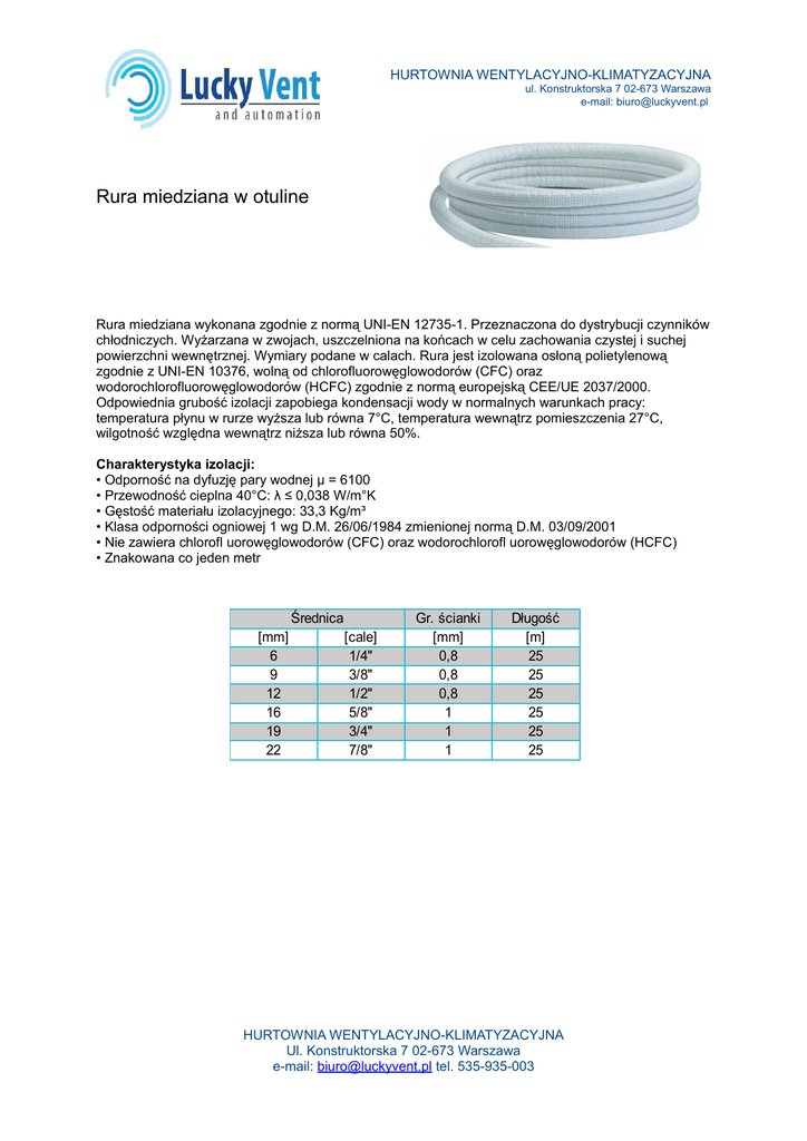 HURTOWNIA WENTYLACYJNO-KLIMATYZACYJNA ul. Konstruktorska 7 02-673 Warszawa e-mail: [email protected] Rura miedziana w otuline Rura miedziana wykonana zgodnie z normą UNI-EN 12735-1. Przeznaczona do dystrybucji czynników chłodniczych. Wyżarzana w zwojach, uszczelniona na końcach w celu zachowania czystej i suchej powierzchni wewnętrznej. Wymiary podane w calach. Rura jest izolowana osłoną polietylenową zgodnie z UNI-EN 10376, wolną od chlorofluorowęglowodorów (CFC) oraz wodorochlorofluorowęglowodorów (HCFC) zgodnie z normą europejską CEE/UE 2037/2000. Odpowiednia grubość izolacji zapobiega kondensacji wody w normalnych warunkach pracy: temperatura płynu w rurze wyższa lub równa 7°C, temperatura wewnątrz pomieszczenia 27°C, wilgotność względna wewnątrz niższa lub równa 50%. Charakterystyka izolacji: • Odporność na dyfuzję pary wodnej µ = 6100 • Przewodność cieplna 40°C: λ ≤ 0,038 W/m°K • Gęstość materiału izolacyjnego: 33,3 Kg/m³ • Klasa odporności ogniowej 1 wg D.M. 26/06/1984 zmienionej normą D.M. 03/09/2001 • Nie zawiera chlorofl uorowęglowodorów (CFC) oraz wodorochlorofl uorowęglowodorów (HCFC) • Znakowana co jeden metr Średnica [mm] 6 9 12 16 19 22 [cale] 1/4" 3/8" 1/2" 5/8" 3/4" 7/8" Gr. ścianki [mm] 0,8 0,8 0,8 1 1 1 Długość [m] 25 25 25 25 25 25 HURTOWNIA WENTYLACYJNO-KLIMATYZACYJNA Ul. Konstruktorska 7 02-673 Warszawa e-mail: [email protected] tel. 535-935-003