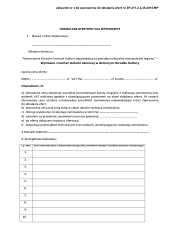Załącznik nr 1 do zaproszenia do składania ofert nr ZP.271.2.2.45.2015.MP FORMULARZ OFERTOWY DLA WYKONAWCY 1. Nazwa i adres Wykonawcy: ………………………………………………………………………………………. Składam ofertę na: ”Nowoczesne Gminne Centrum Kultury odpowiedzią na potrzeby kulturalne mieszkańców regionu” – Wymiana i montaż stolarki okiennej w Gminnym Ośrodku Kultury Łączna cena oferty: Netto,: ……………………………..………. zł VAT (%) ……………………….…….. zł, brutto …………………………..……. zł Oświadczam, że a) oferowana cena obejmuje wszystkie przewidywane koszty związane z realizacją zamówienia oraz podatek VAT naliczony zgodnie z obowiązującymi przepisami na dzień składania oferty. W ramach oferowanej ceny zostanie zrealizowany przedmiot zamówienia odpowiadający treści Zaproszenia do składania ofert. b) oferowana cena jest ceną stałą w całym okresie realizacji zamówienia. c) oferuję wykonanie niniejszego zamówienia w terminie …………………………….…………., d) udzielam na przedmiot zamówienia terminu gwarancji ………………………..………………. e) do oferty dołączam kosztorys ofertowy; f) dysponuję potencjałem technicznym oraz osobami umożliwiającymi realizację zamówienia. 3.Warunki płatności ………………………………………………………………………………………………..…………….. 4. Szczegółowa kalkulacja: L.p. okna 1. 2. 3. 4. 5. 6. 7. 8. 9. 10. Cena netto okna (wraz z demontażem starego okna, montażem nowego i montażem parapetu zewnętrznego) 11. 12. 13. 14. 15. 16. 17. 18. 19. 20. 21. 22. 23. Razem netto VAT …....% Razem brutto ……………………………………… (Miejscowość) ……………………………. (data) (podpis osoby Wykonawcy)